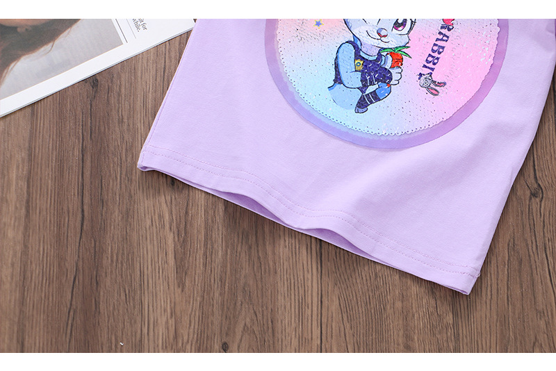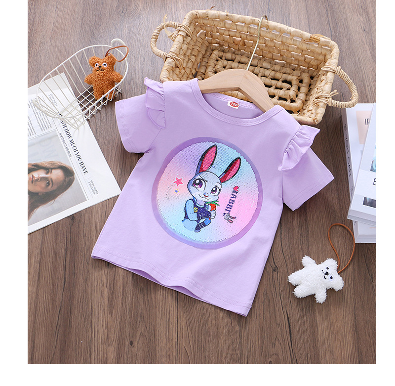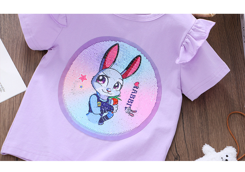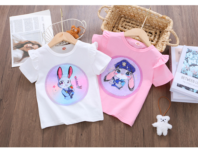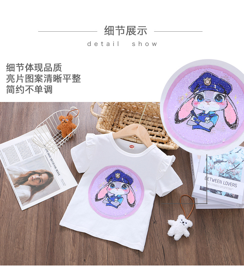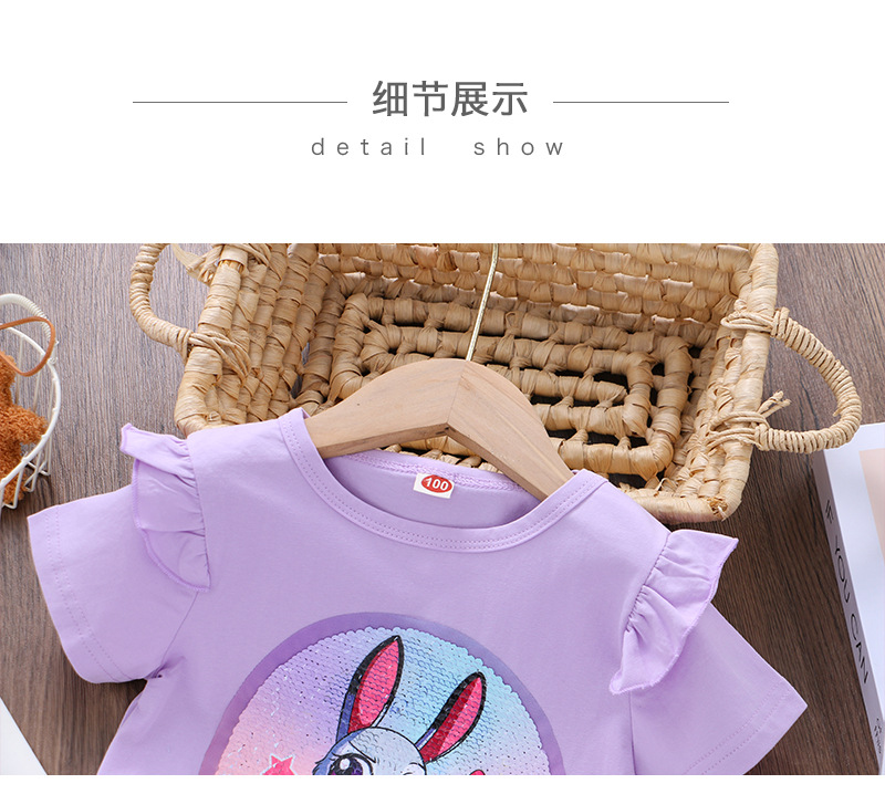 어린이 여름 반팔 2025 새로운 스타일 소녀 토끼 프린트 플라잉 슬리브 티셔츠 아기 귀여운 양면 색상 변경 탑스토어 가기