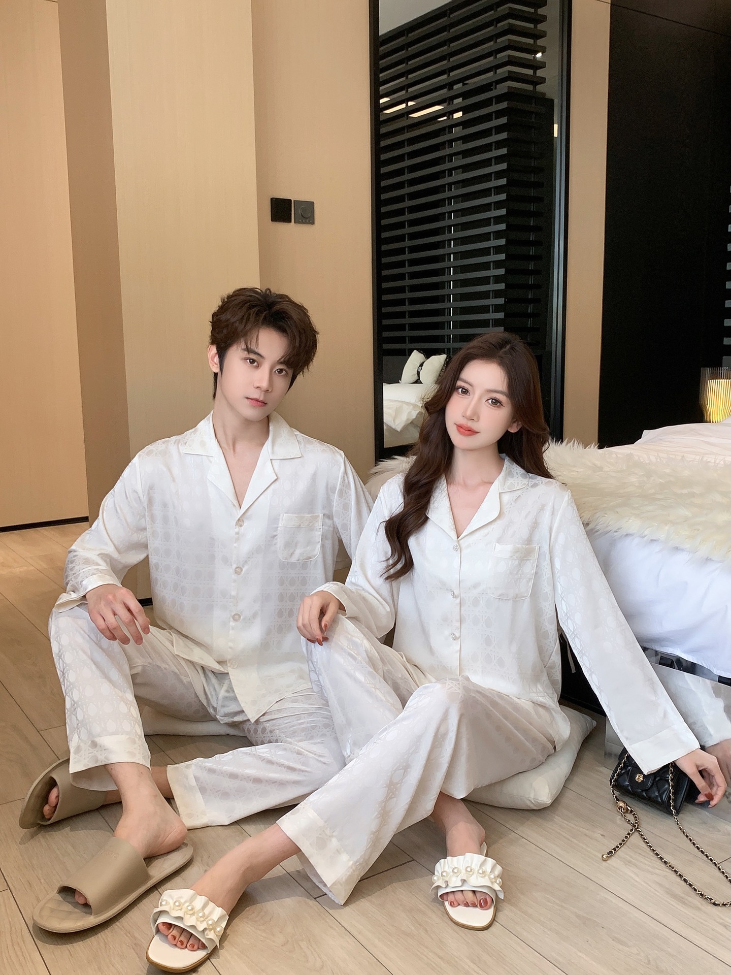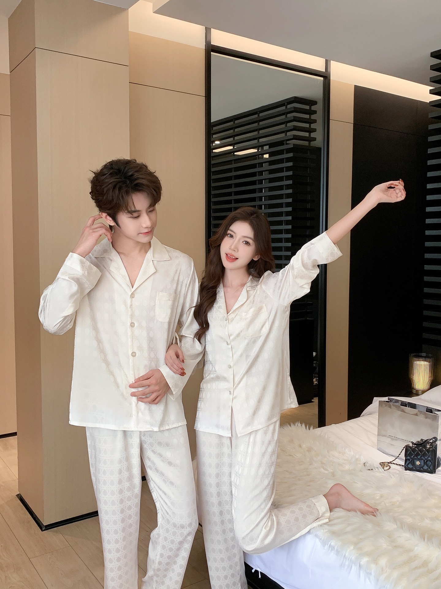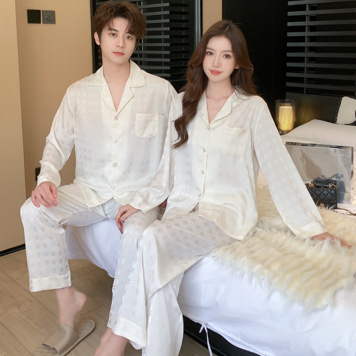25 새로운 봄과 여름 커플 잠옷 아이스 실크 남자와 여자의 긴 소매 바지 자카드 얇은 통기성 패션 카디건 홈 옷