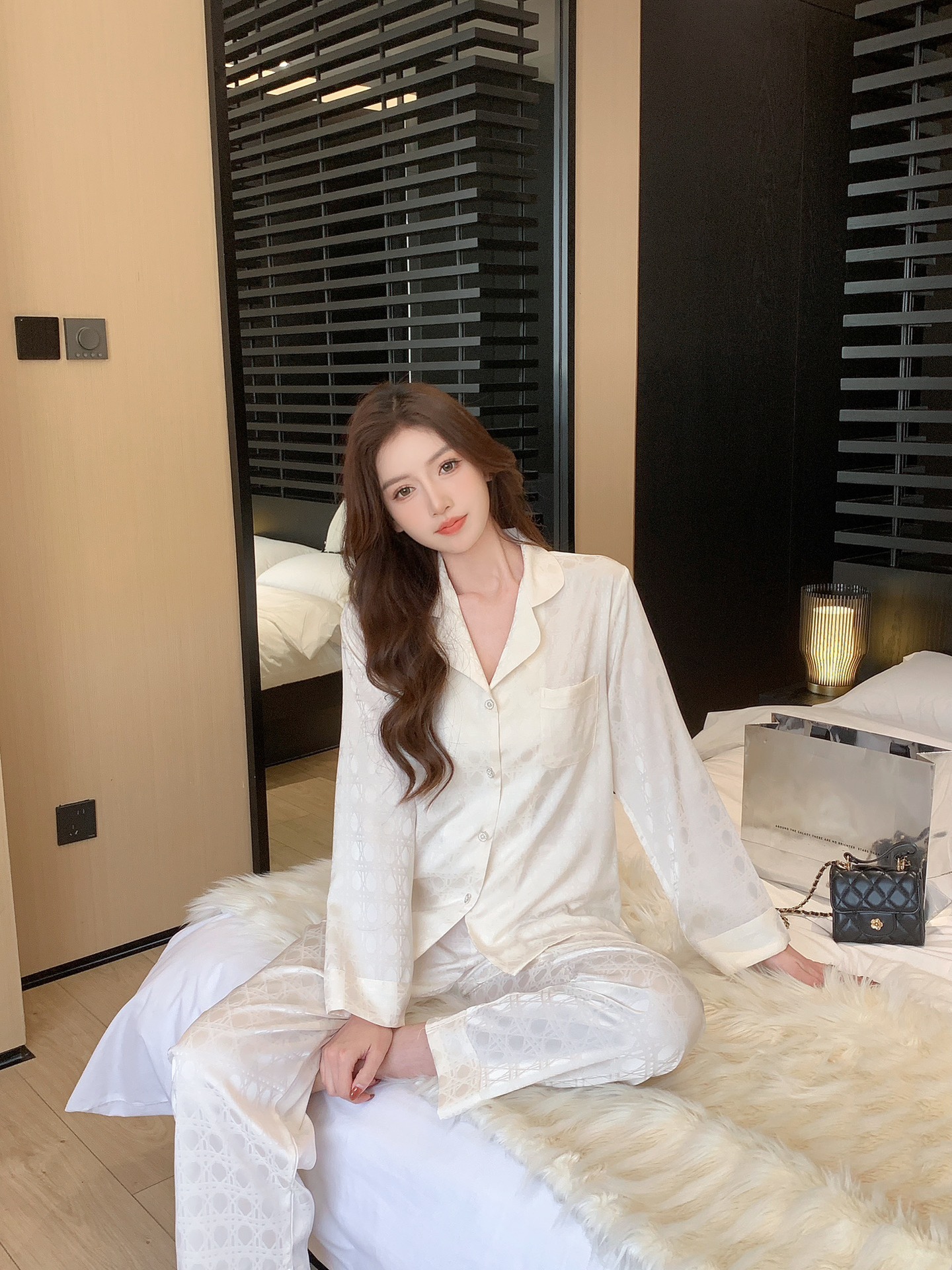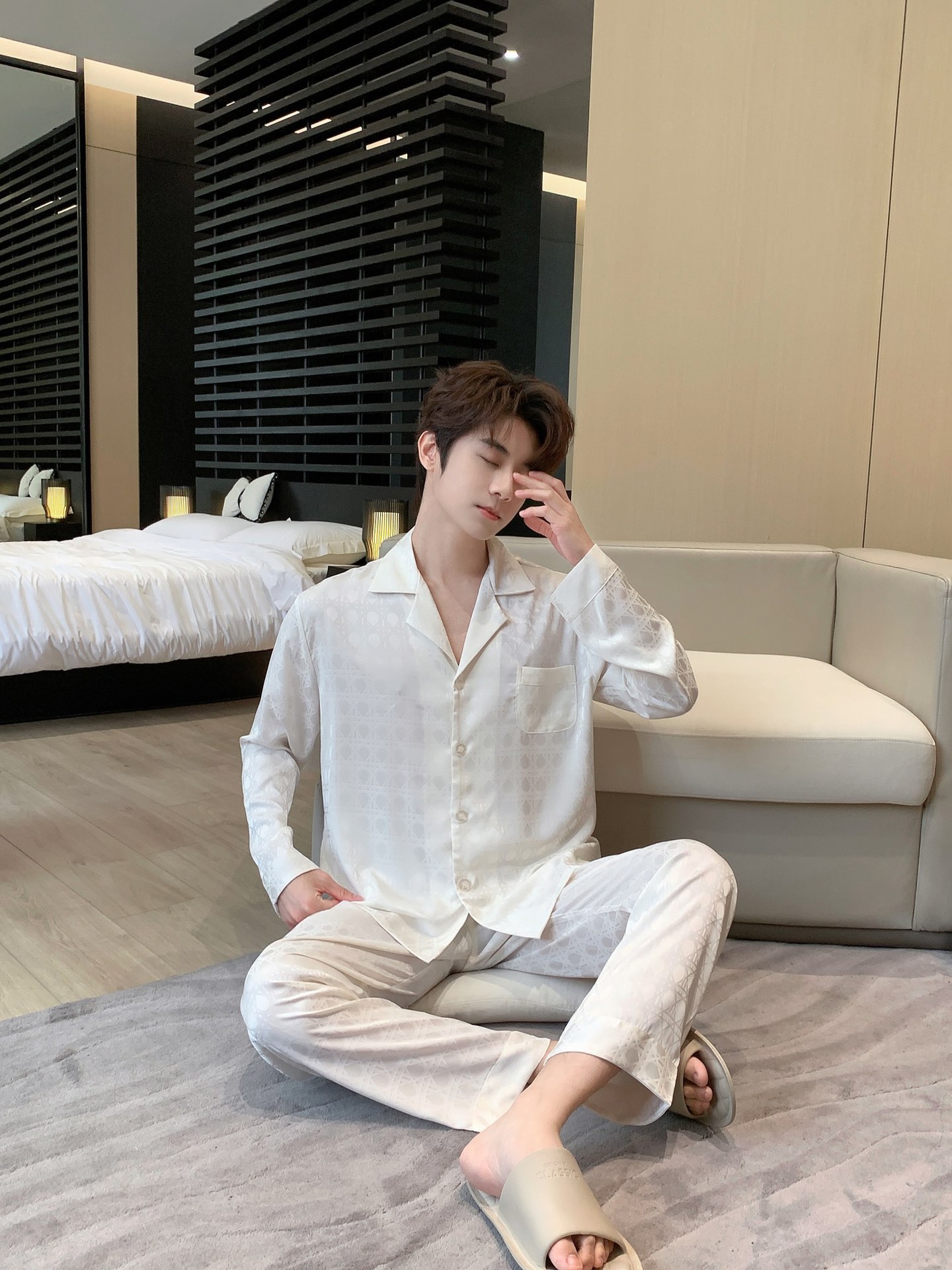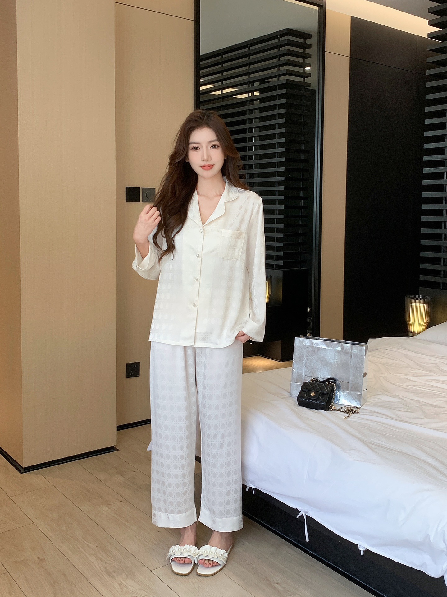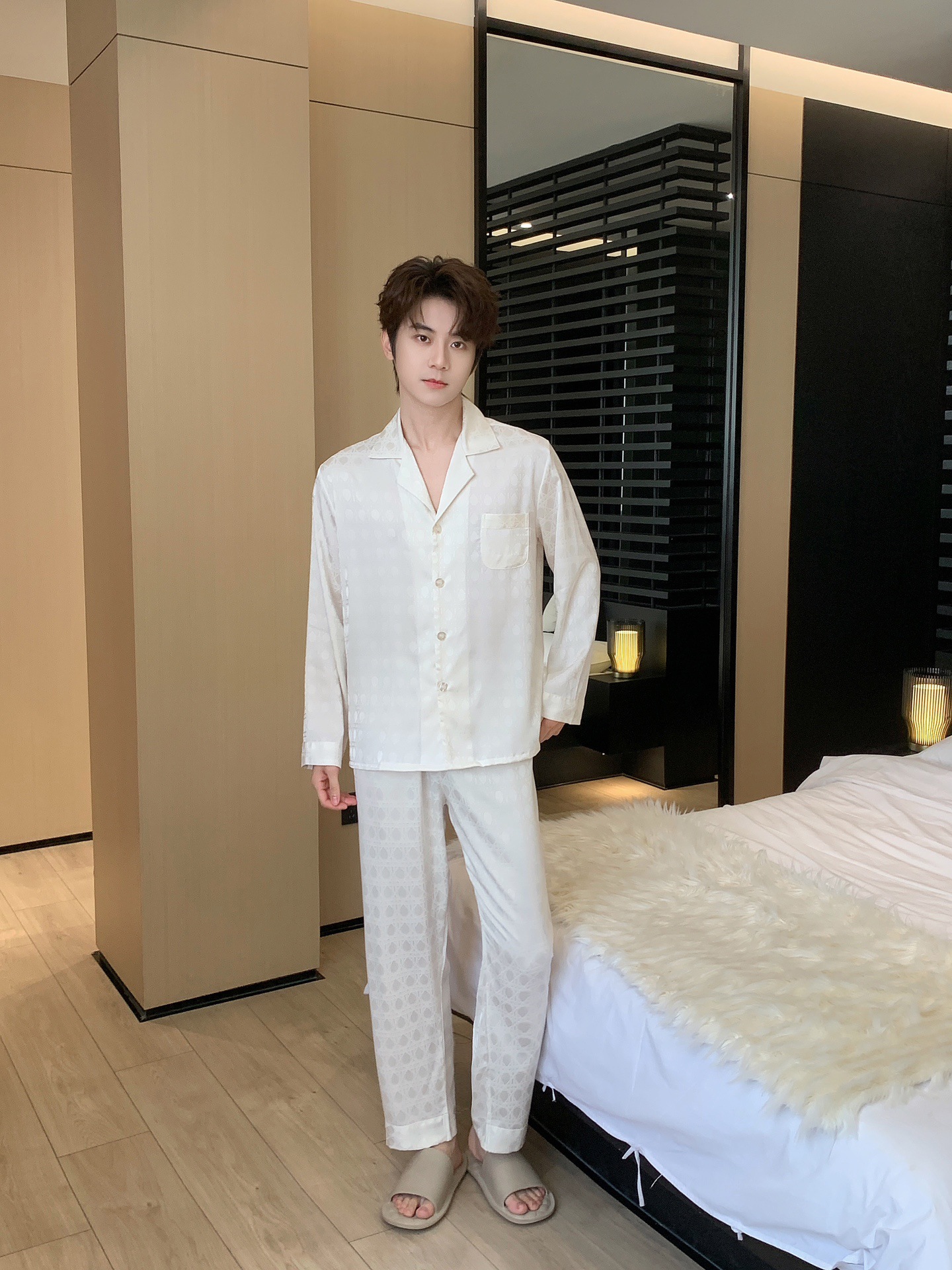 25 새로운 봄과 여름 커플 잠옷 아이스 실크 남자와 여자의 긴 소매 바지 자카드 얇은 통기성 패션 카디건 홈 옷스토어 가기