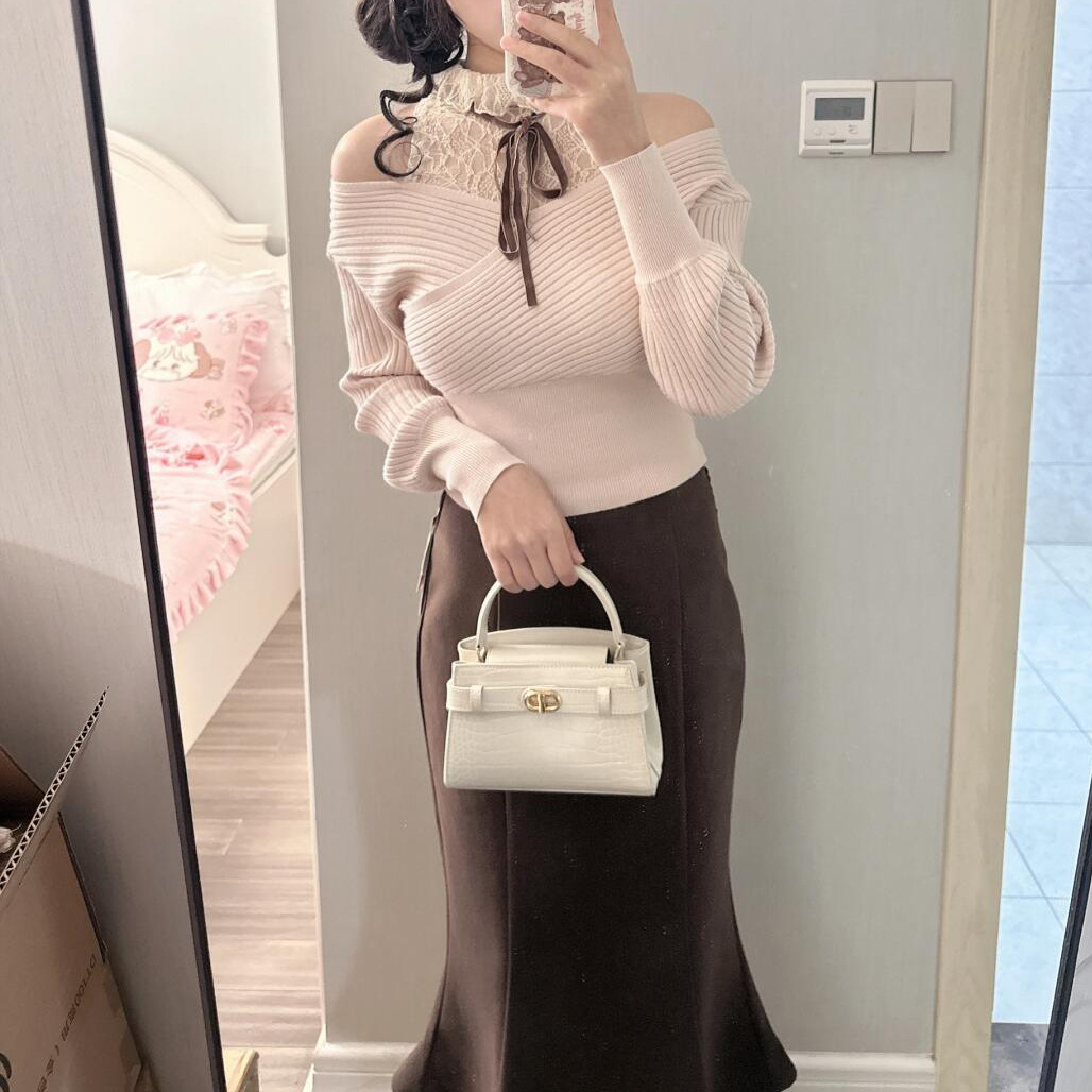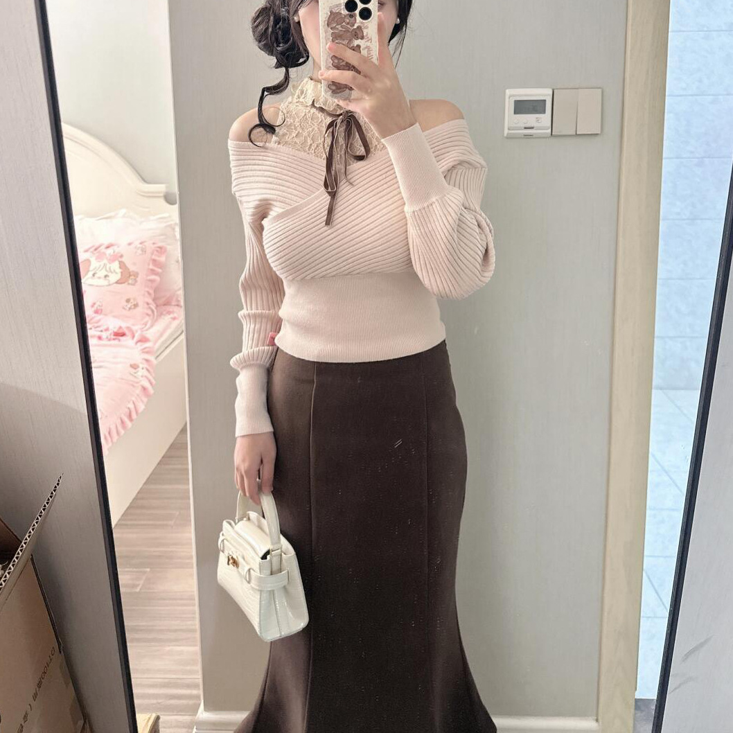 일본식 가짜 2 피스 어깨 스웨터 니트 최고 여성 봄 새로운 패션 여성을위한 우아한 젠틀 탑