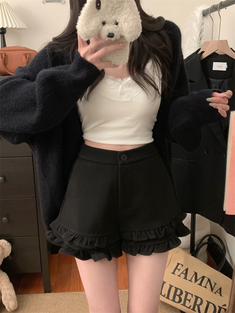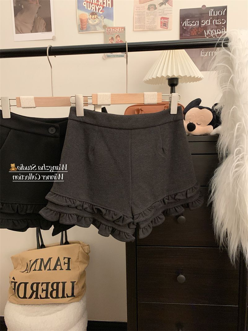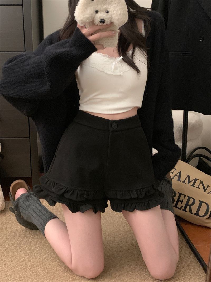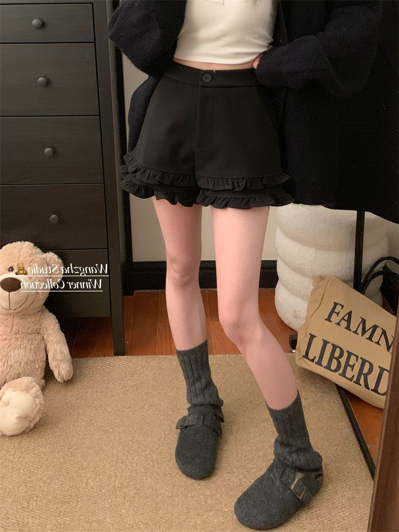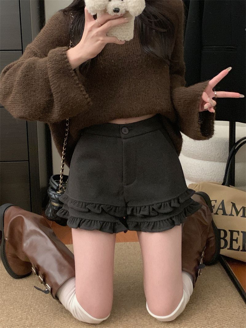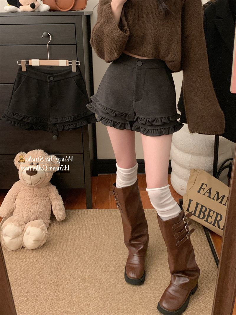가을과 겨울 달콤한 우아한 높은 허리 슬리밍 양모 반바지 여성 디자인 센스 레이스 머리 외부 부츠 바지