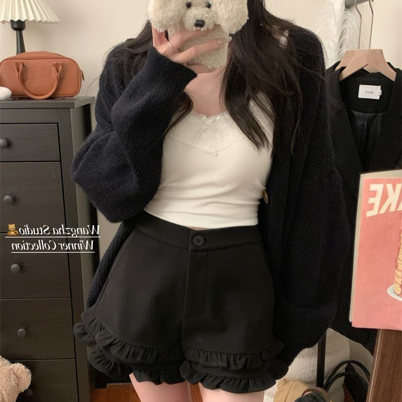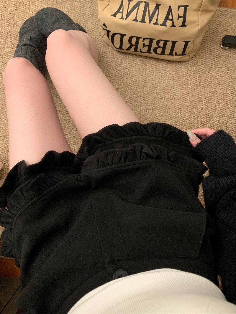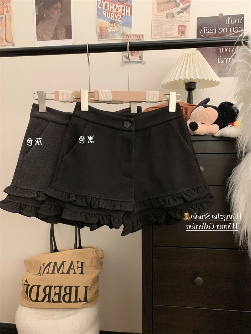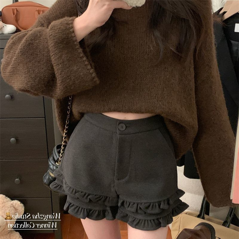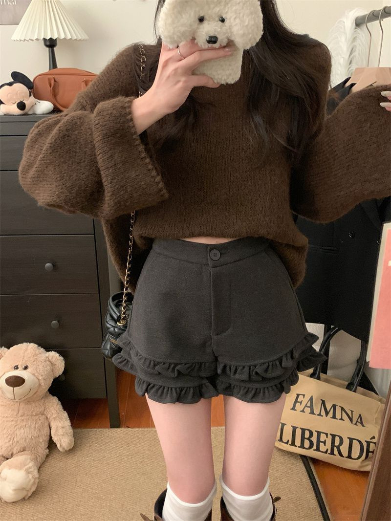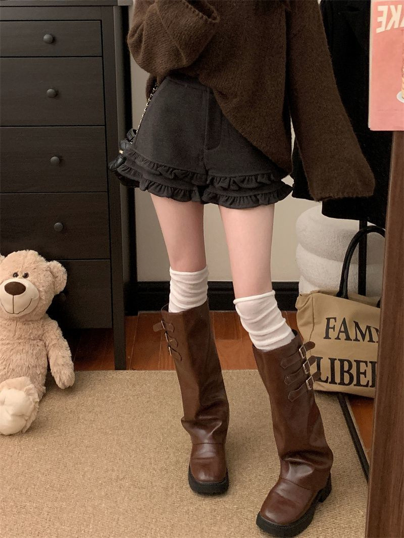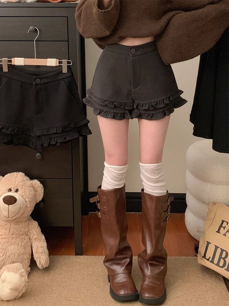 가을과 겨울 달콤한 우아한 높은 허리 슬리밍 양모 반바지 여성 디자인 센스 레이스 머리 외부 부츠 바지