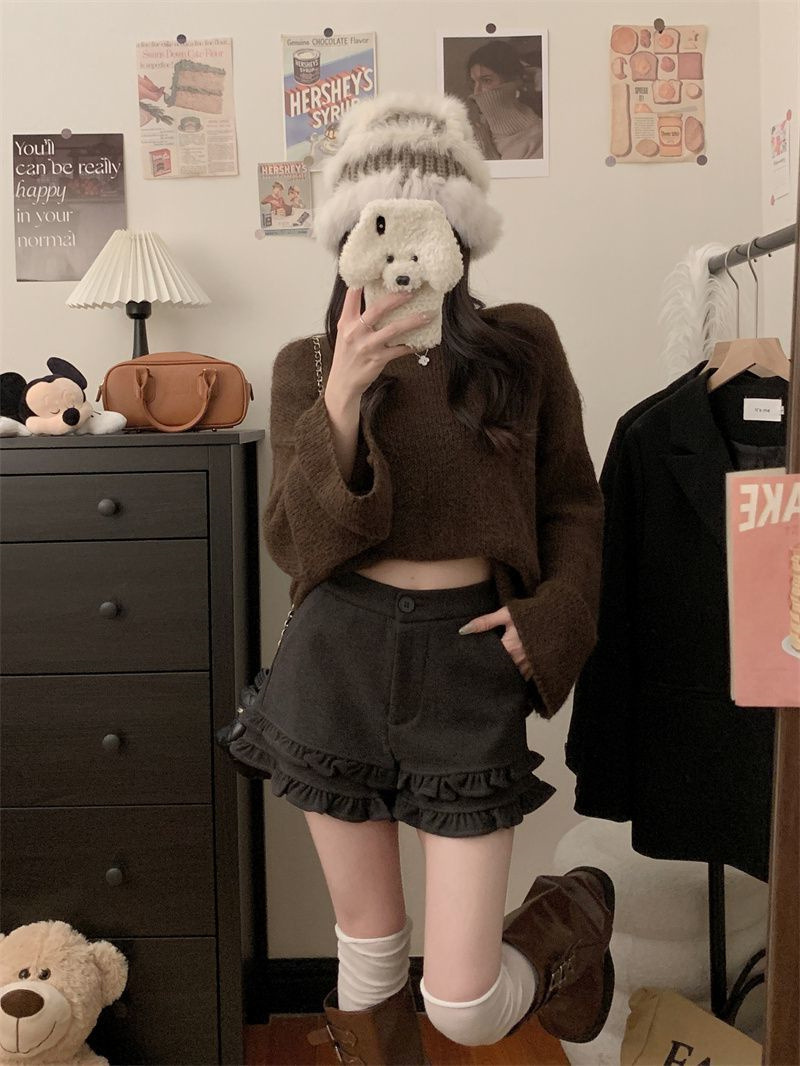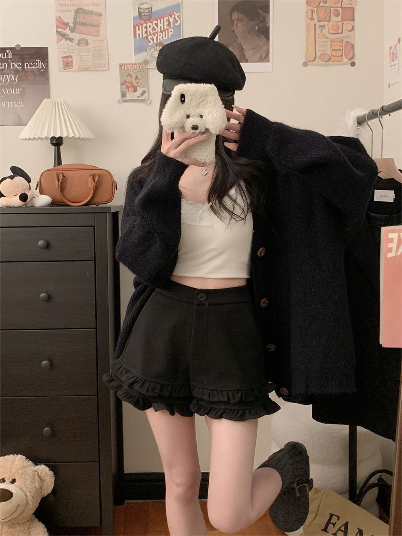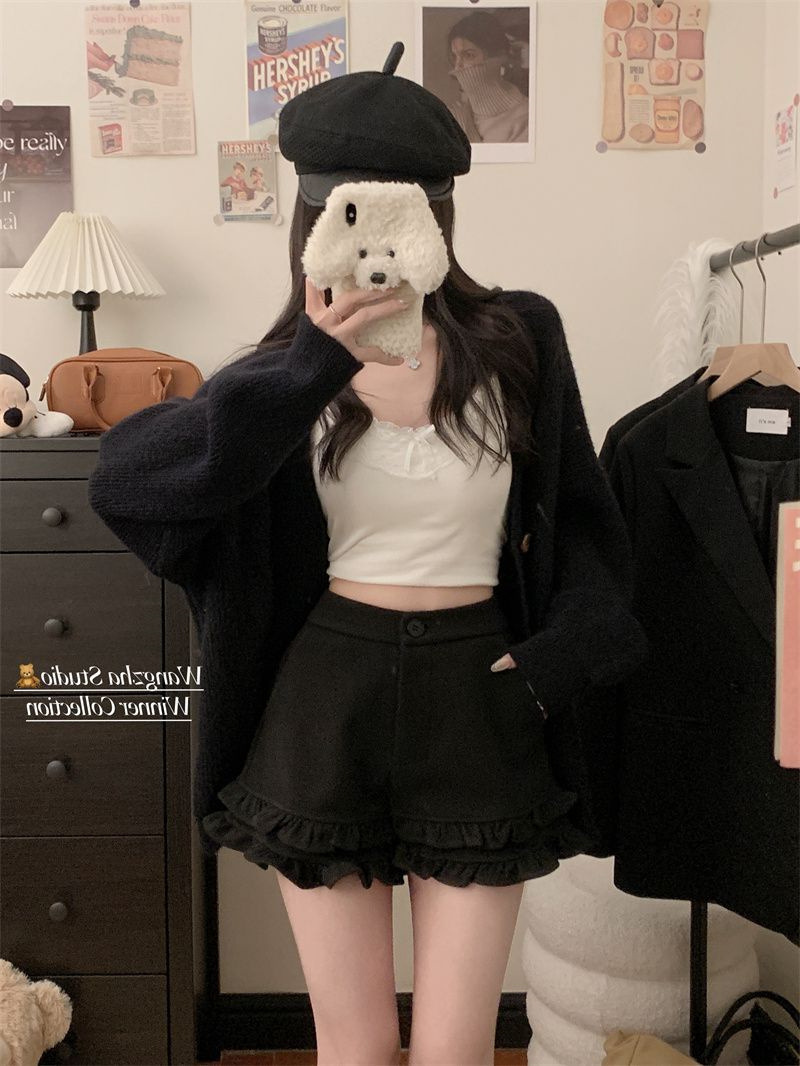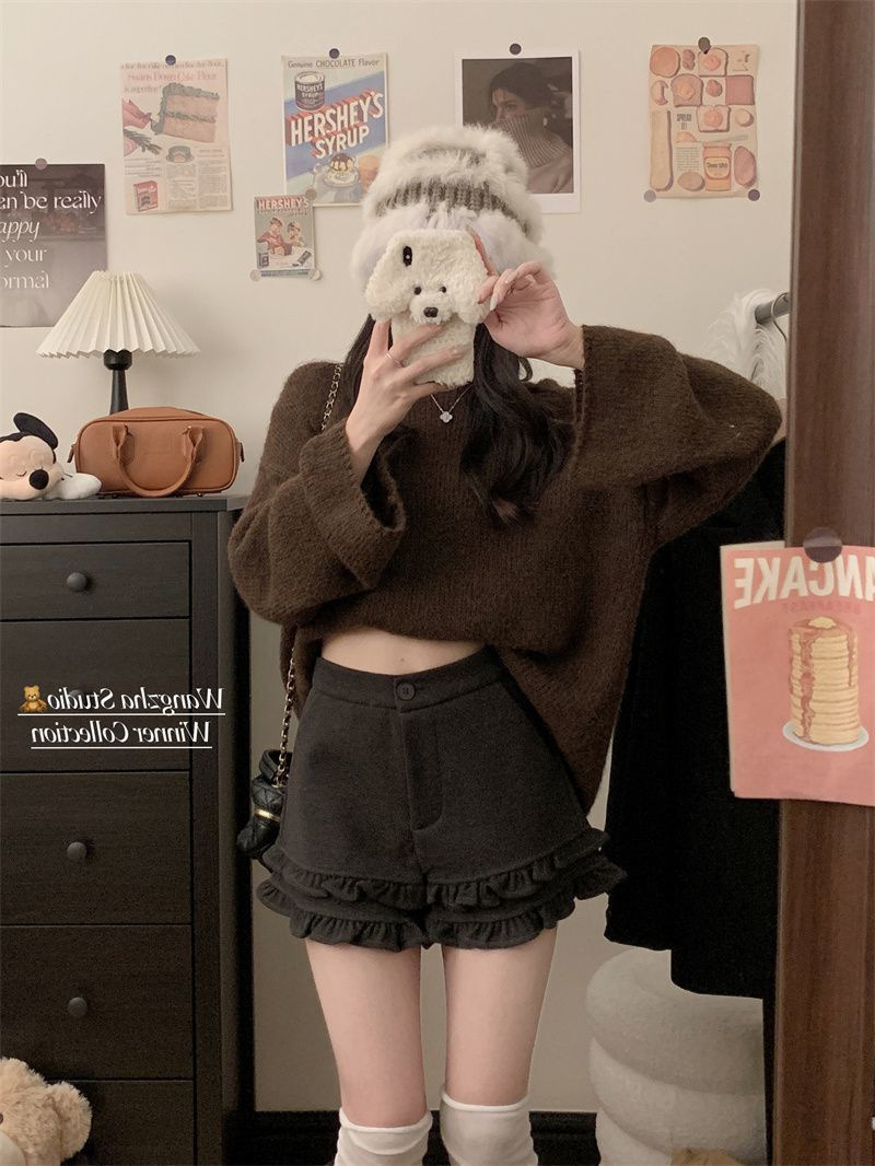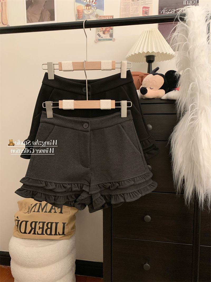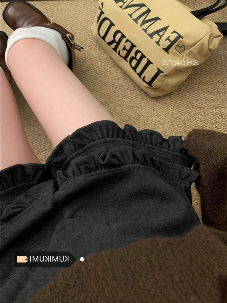 가을과 겨울 달콤한 우아한 높은 허리 슬리밍 양모 반바지 여성 디자인 센스 레이스 머리 외부 부츠 바지