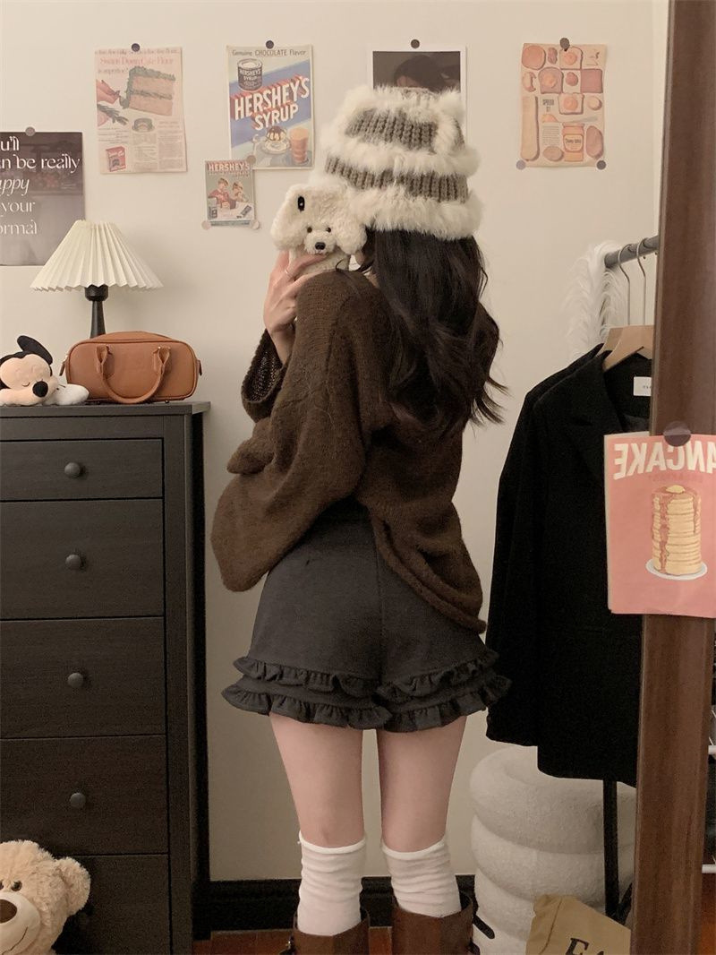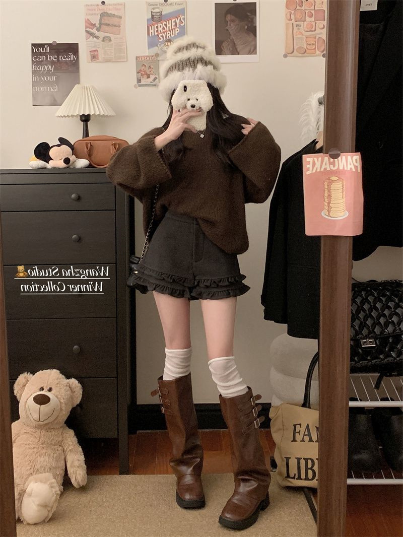 가을과 겨울 달콤한 우아한 높은 허리 슬리밍 양모 반바지 여성 디자인 센스 레이스 머리 외부 부츠 바지스토어 가기