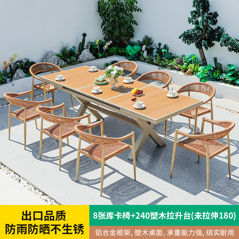• 240cm 플라스틱 목재 스트레치 롱 테이블 + 쿠카라 로프 의자 8개