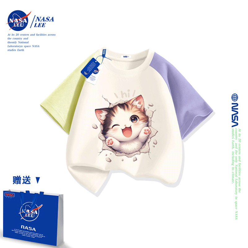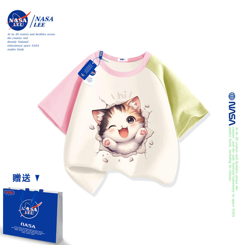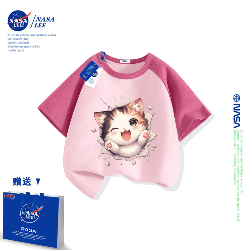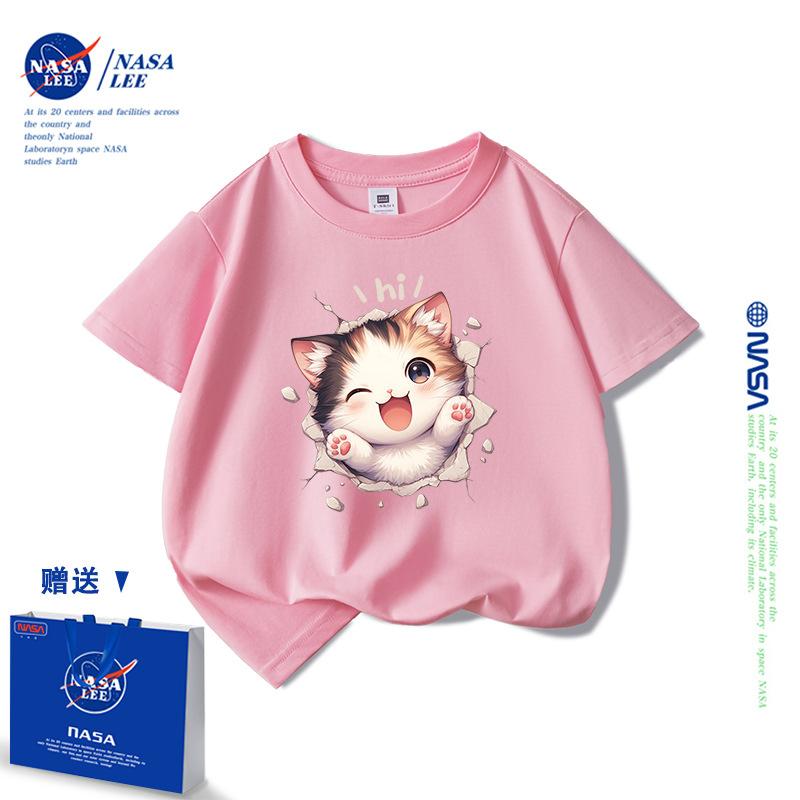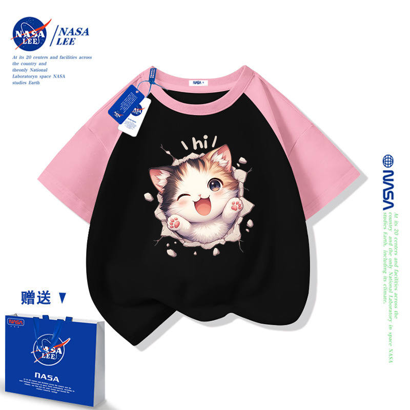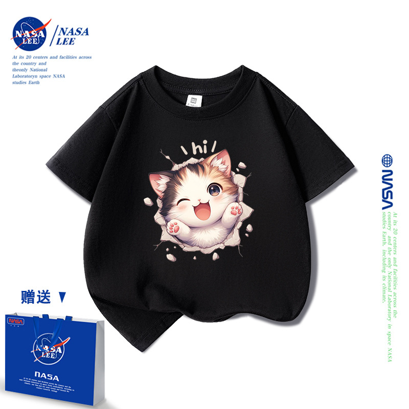 NASA 어린이 짧은 소매 티셔츠 얇은 어린이 여름 원피스 소년 2025 새로운 퓨어 코튼 블랙 걸스 톱 도매