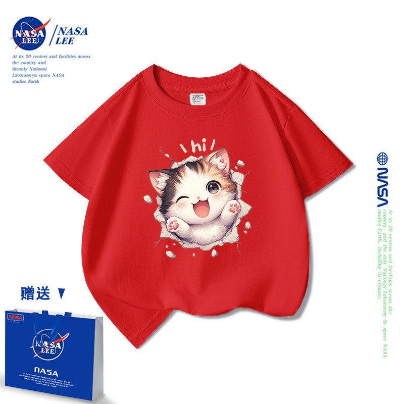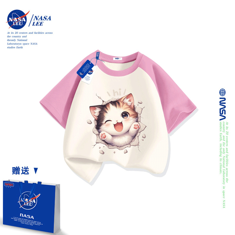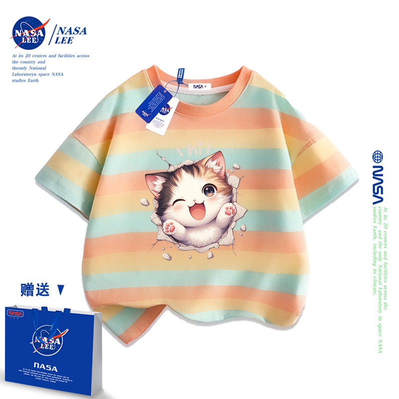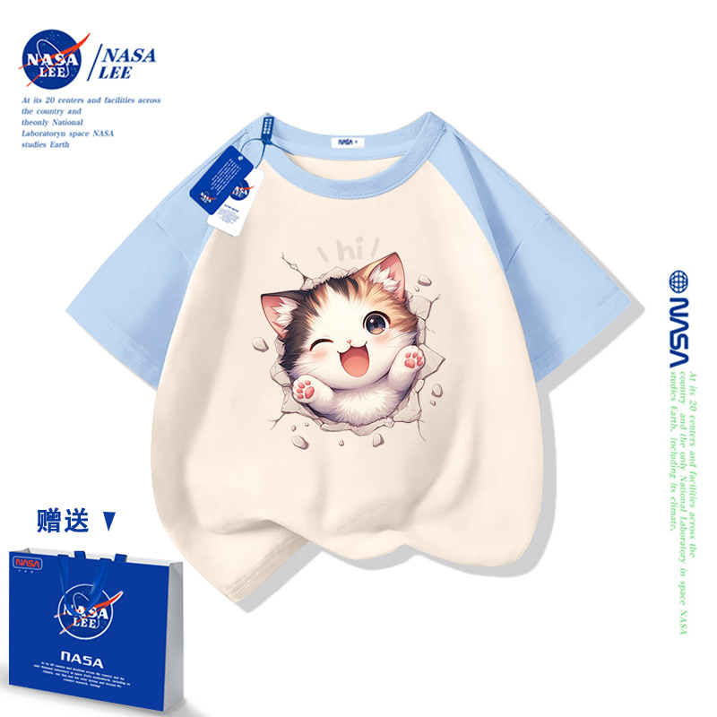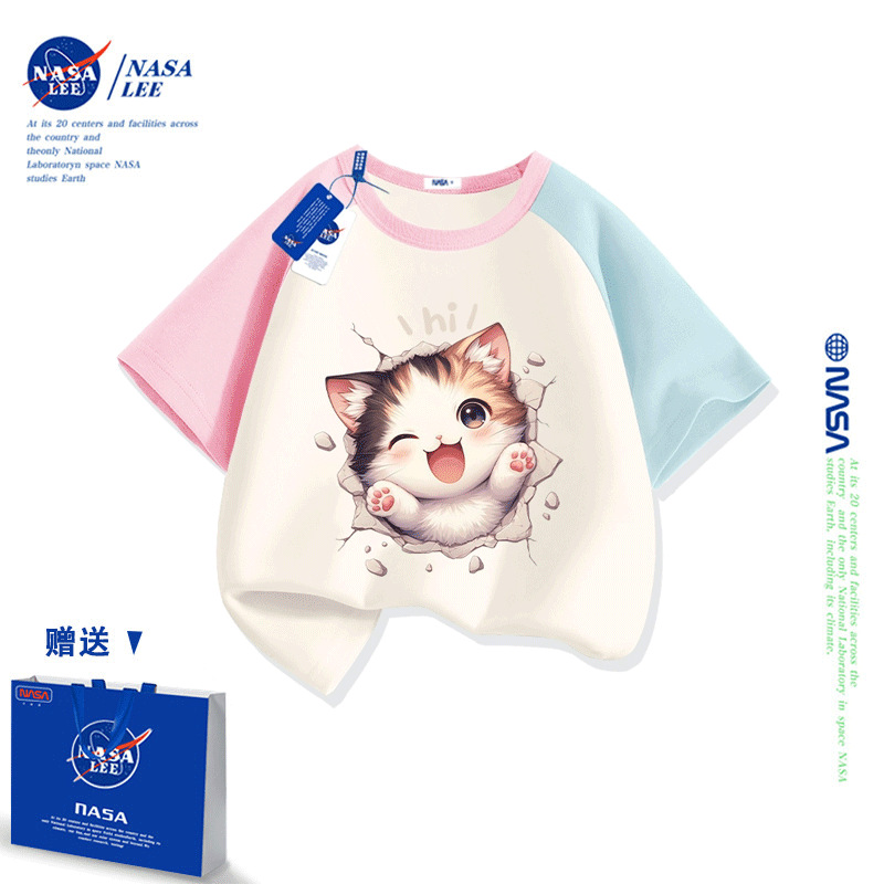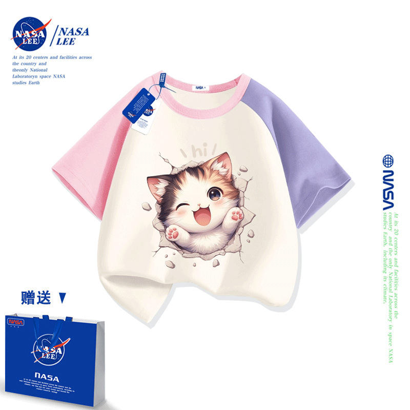 NASA 어린이 짧은 소매 티셔츠 얇은 어린이 여름 원피스 소년 2025 새로운 퓨어 코튼 블랙 걸스 톱 도매