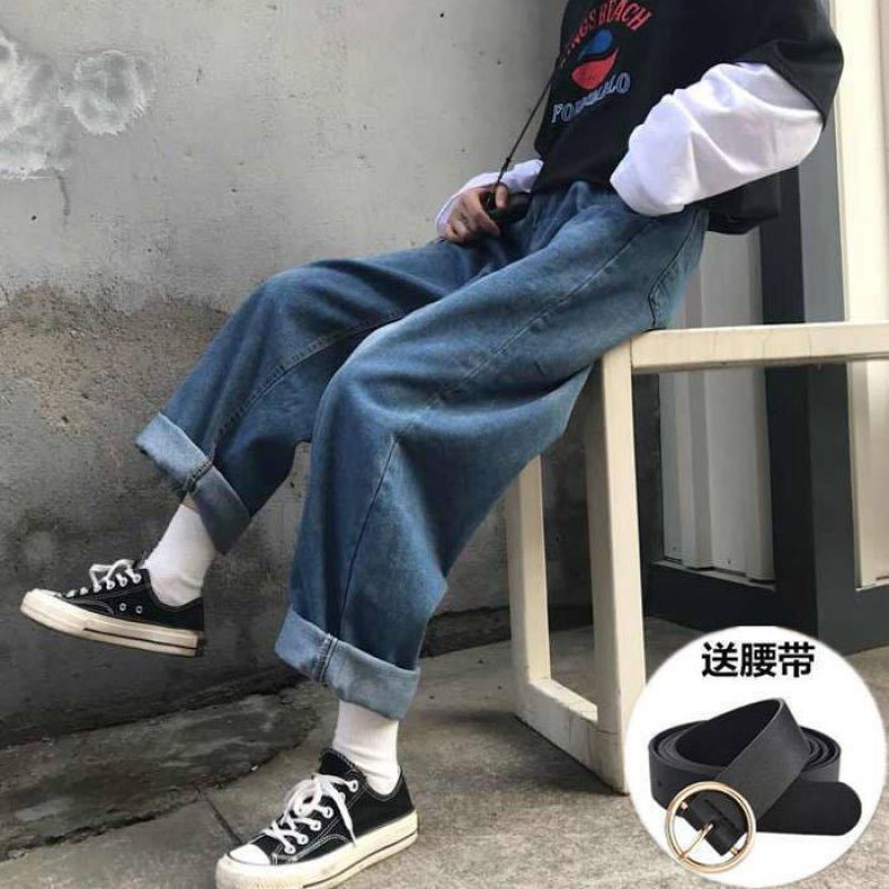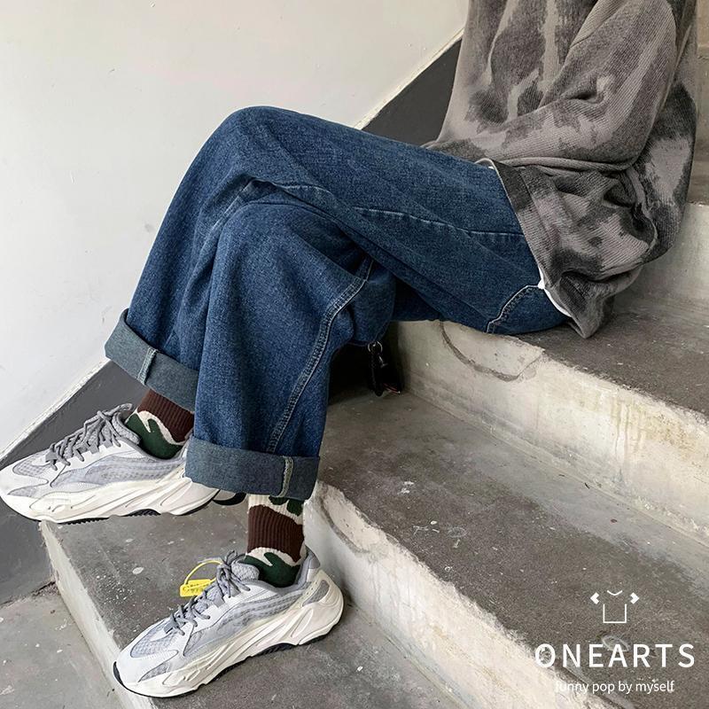 봄과 가을 새로운 한국식 홍콩 스타일 레트로 하이 웨이스트 루즈 스트레이트 레그 와이드 레그 컬은 여학생을위한 올 매치 슬림 핏 청바지스토어 가기