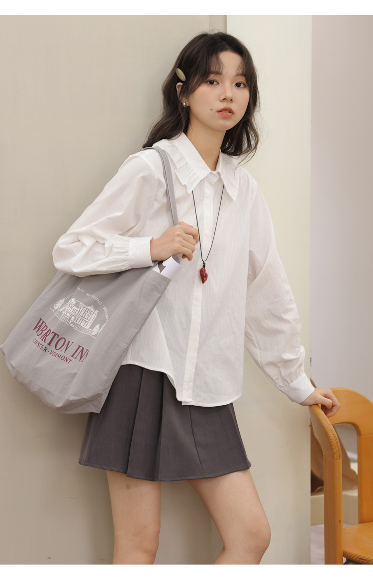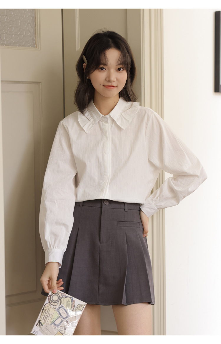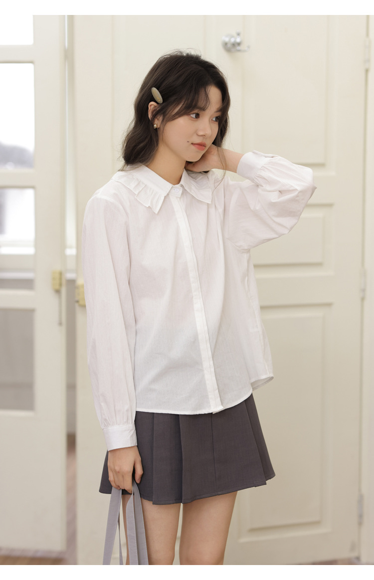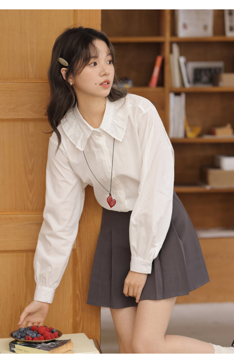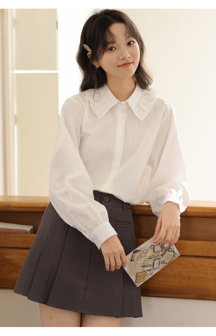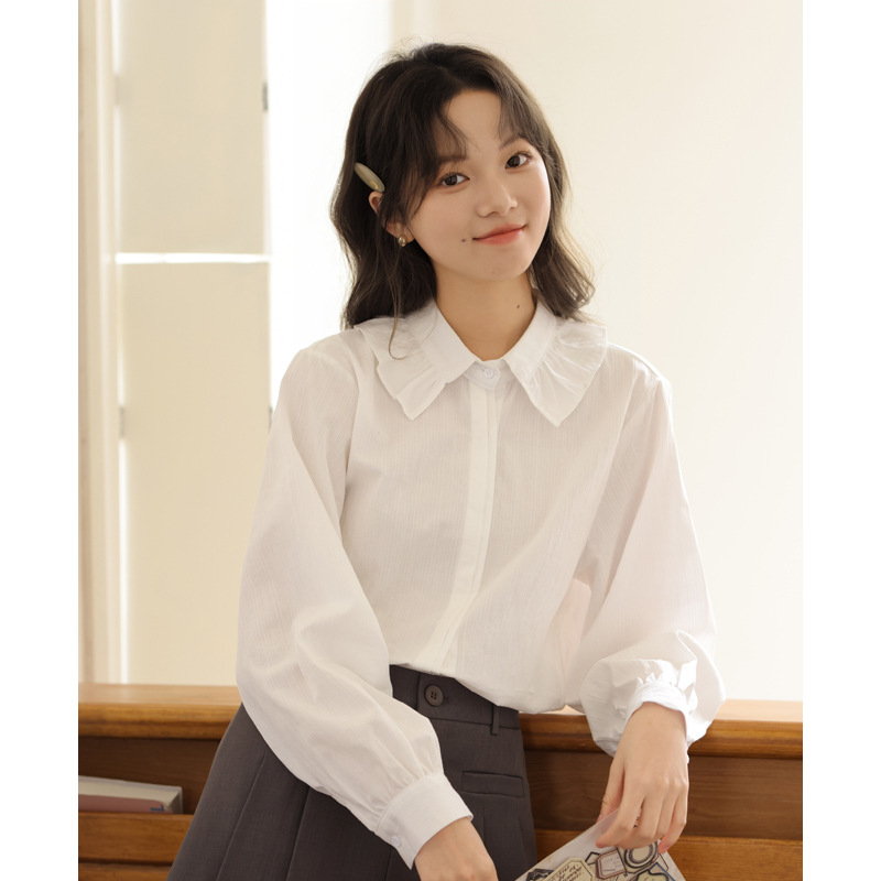 봄 2025 새로운 한국 스타일 달콤한 하이 퀄리티 자카드 디자인 여성을위한 로터스 칼라 긴 소매 셔츠와 연령 감소 탑스토어 가기