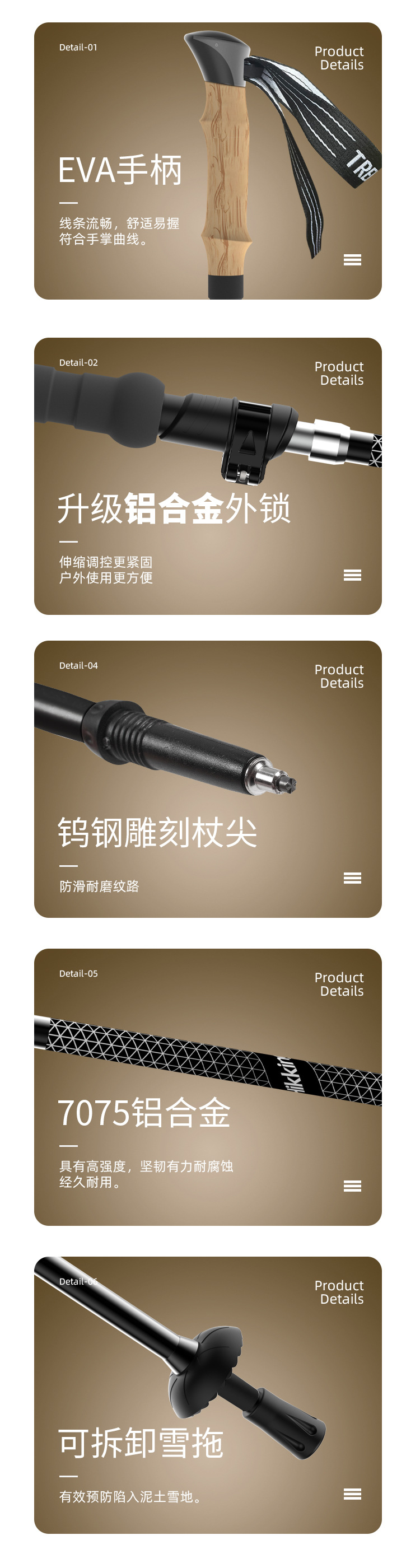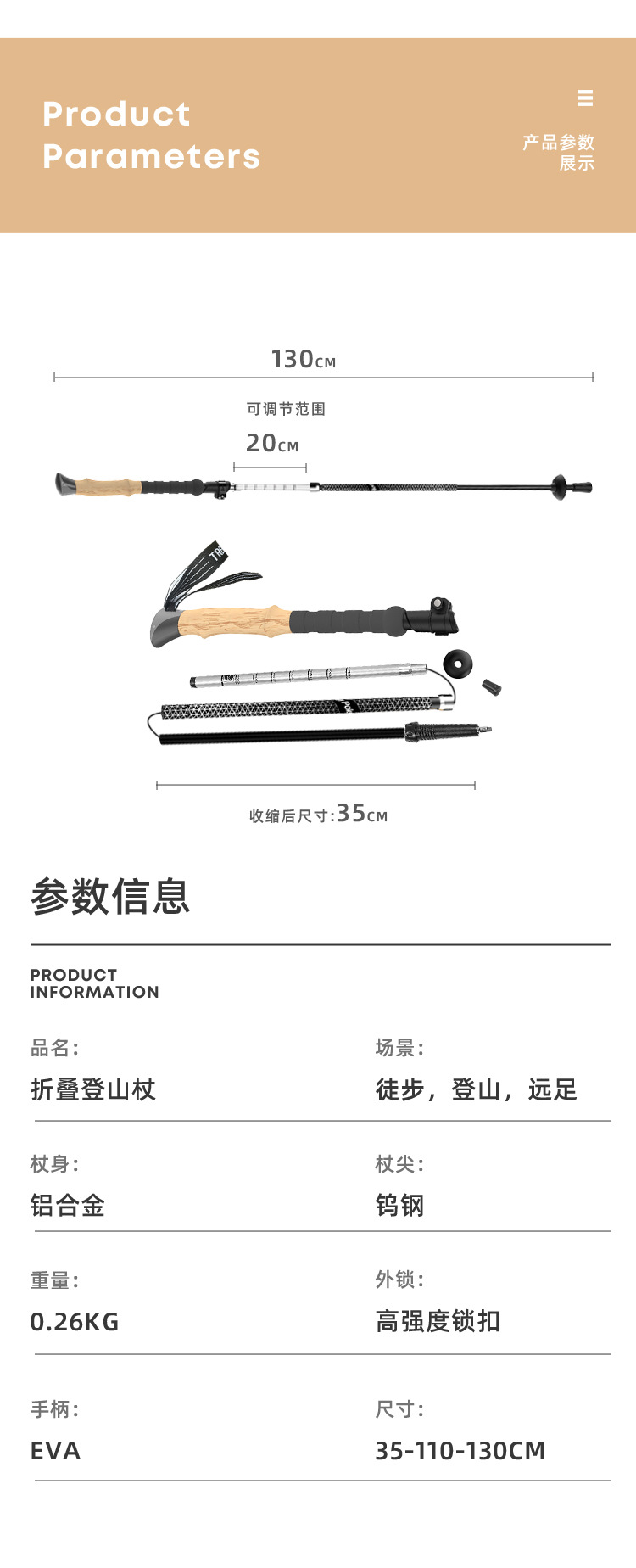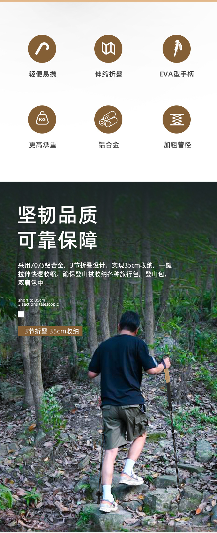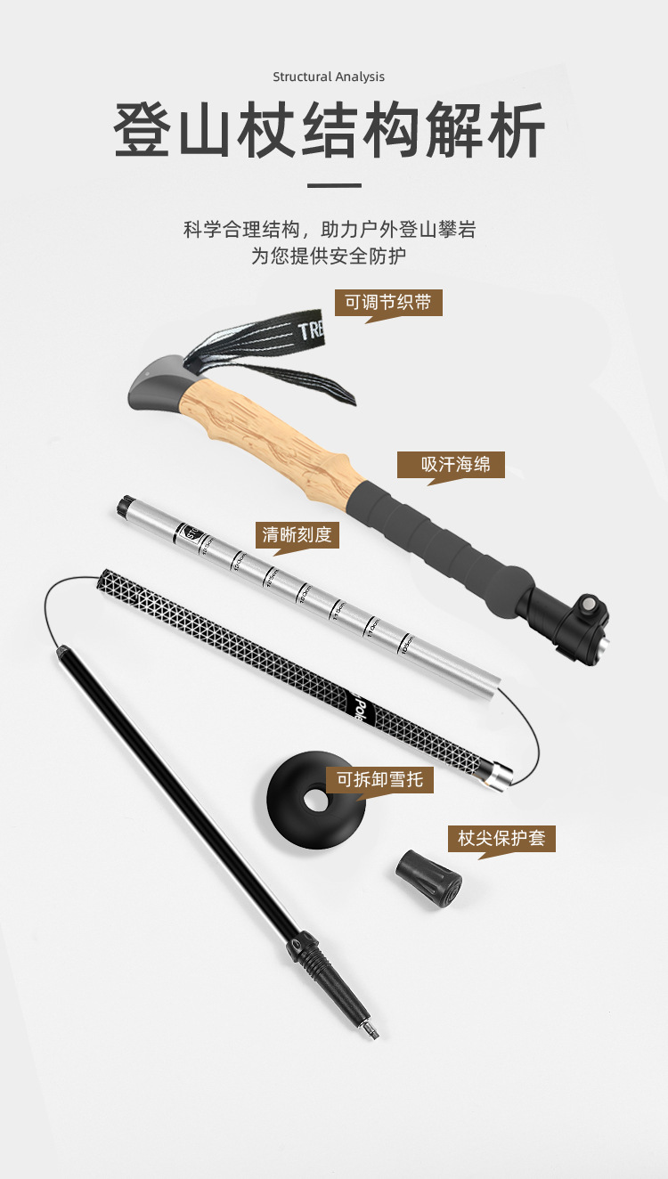 2. 登山杖操作规范:使用前检查杖身伸缩节、锁扣是否牢固,避免因部件松动导致登山杖断裂、滑落;调节长度时需确认锁扣完全锁紧,防止使用中突然缩短失衡。