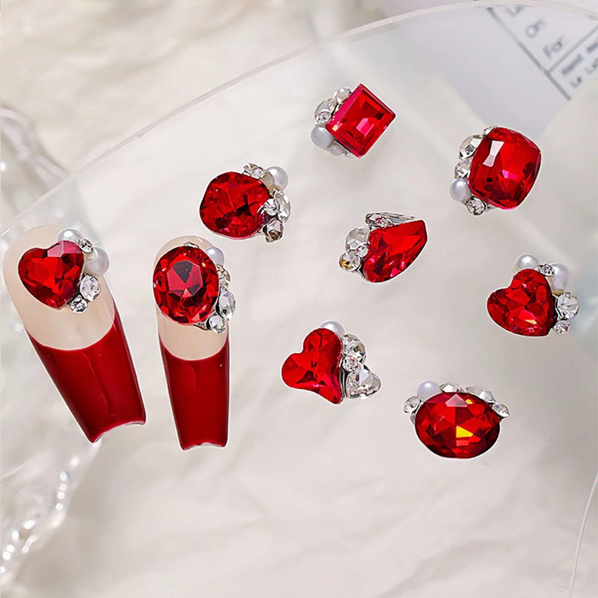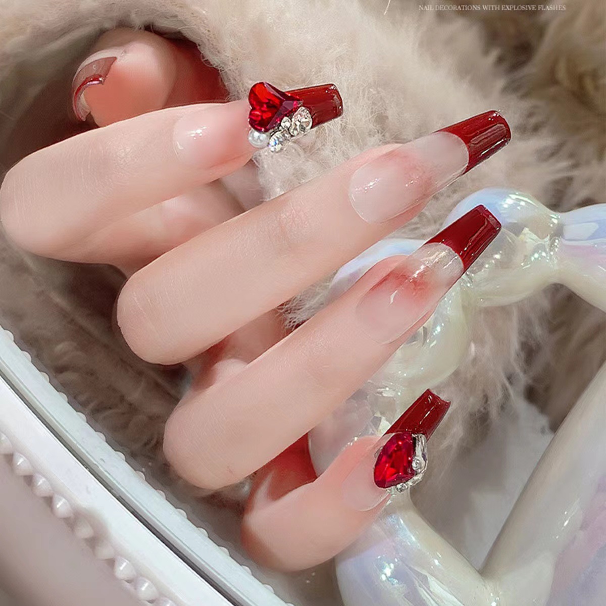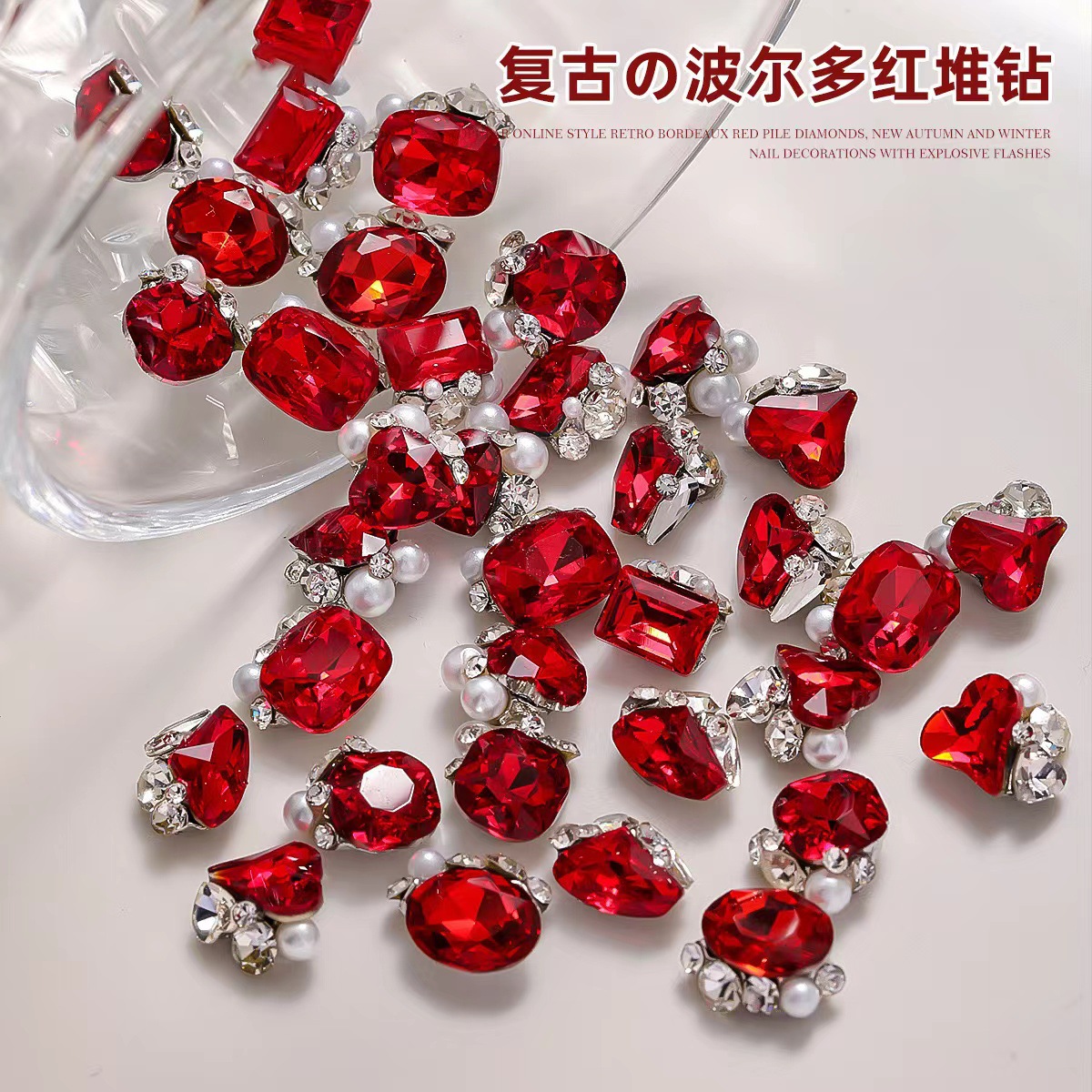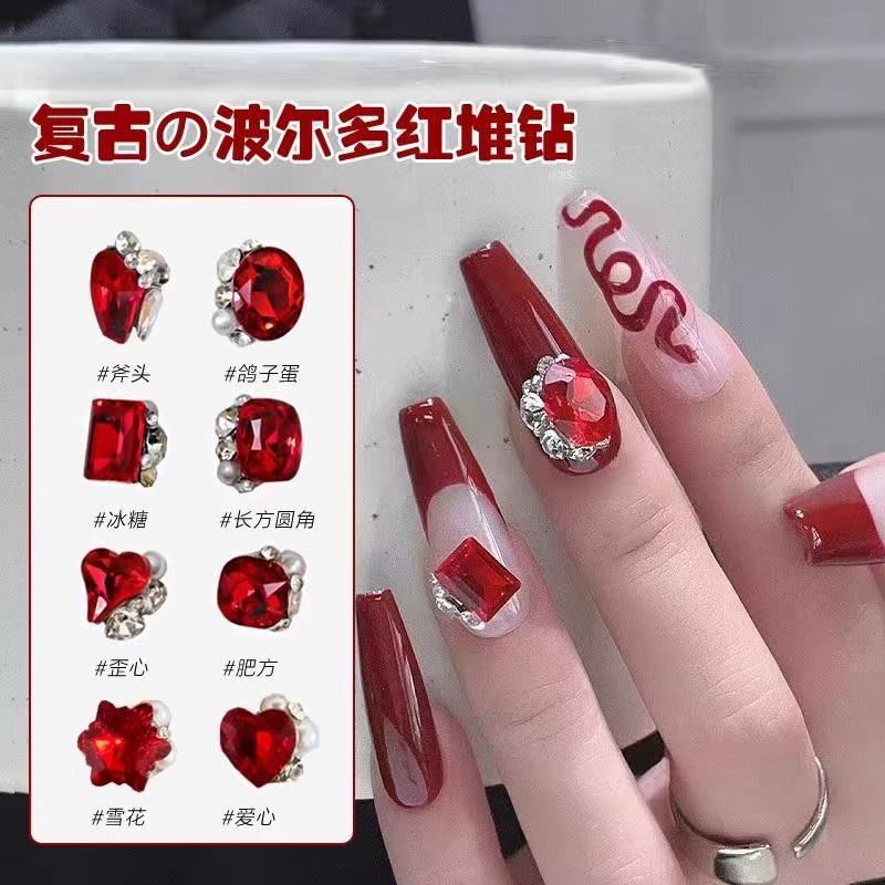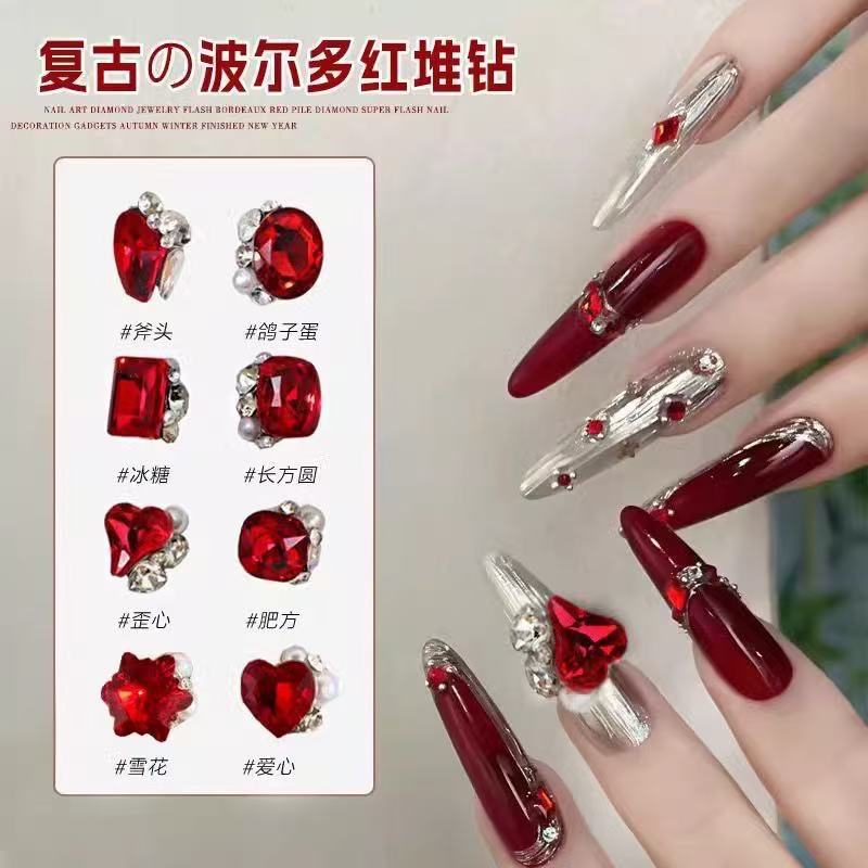 순 붉은 폭발 복고풍 보르도 붉은 더미 드릴 2024 가을과 겨울 새해 플래시 설탕 비뚤어진 심장 드릴 네일 장식스토어 가기