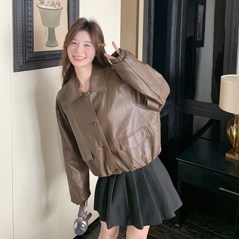 리얼 샷 복고풍 거리 스타일 다크 브라운 짧은 가죽 코트 2025 새로운 달콤한 시원한 달걀 흰색 오토바이 재킷 탑스토어 가기