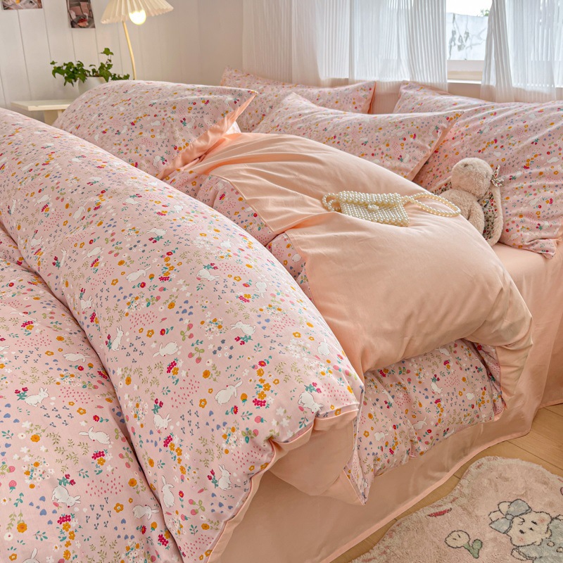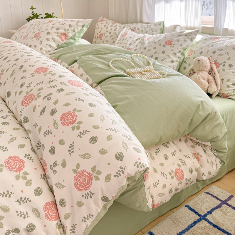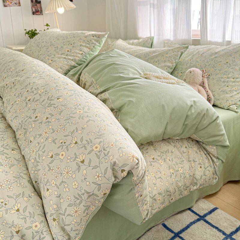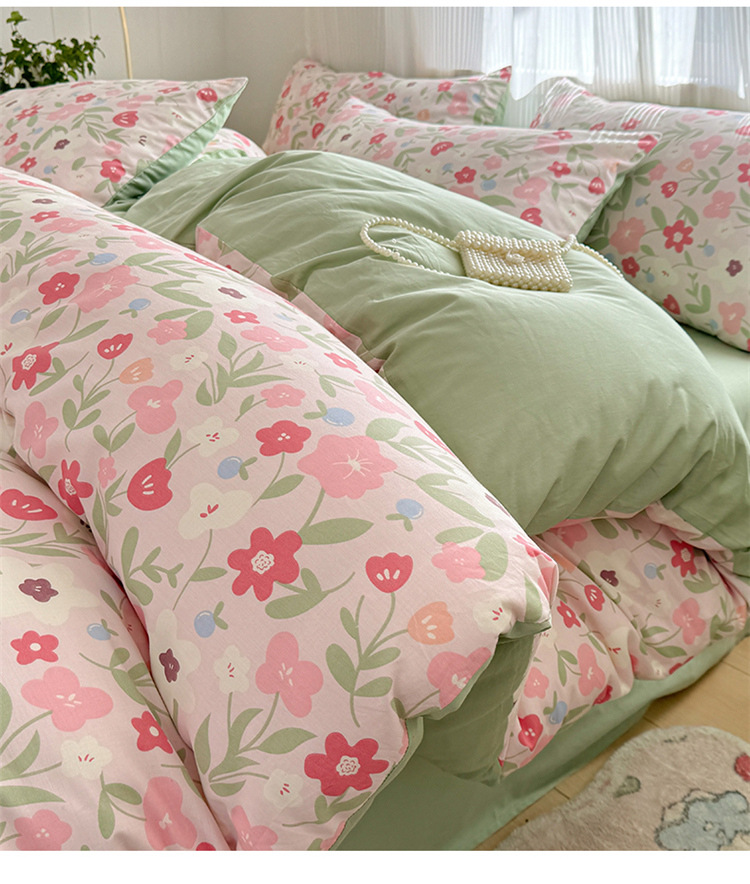 순수한면 4 피스면 2025 새로운 침구 작은 신선한 꽃 싱글 퀼트 커버 기숙사 침대 모자 3 피스 세트