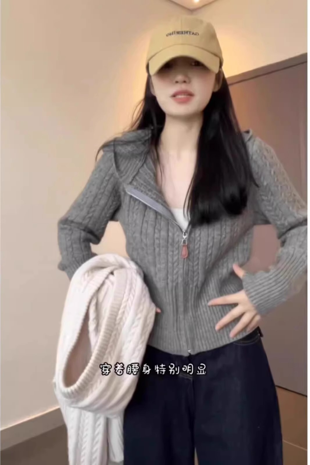 부드러운 바람 트위스트 후드 니트 카디건 여성용 봄과 가을 한국 스타일 게으른 지퍼 스웨터 코트 타이트 허리 쇼트 탑스토어 가기