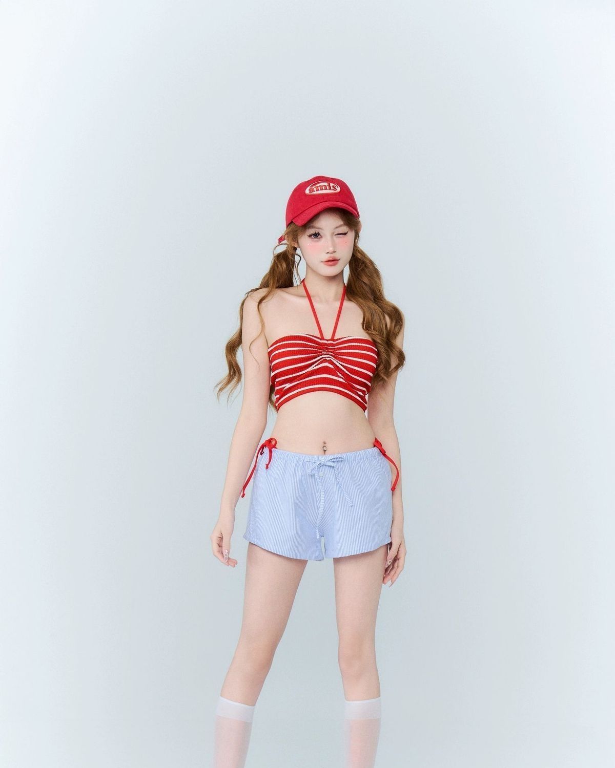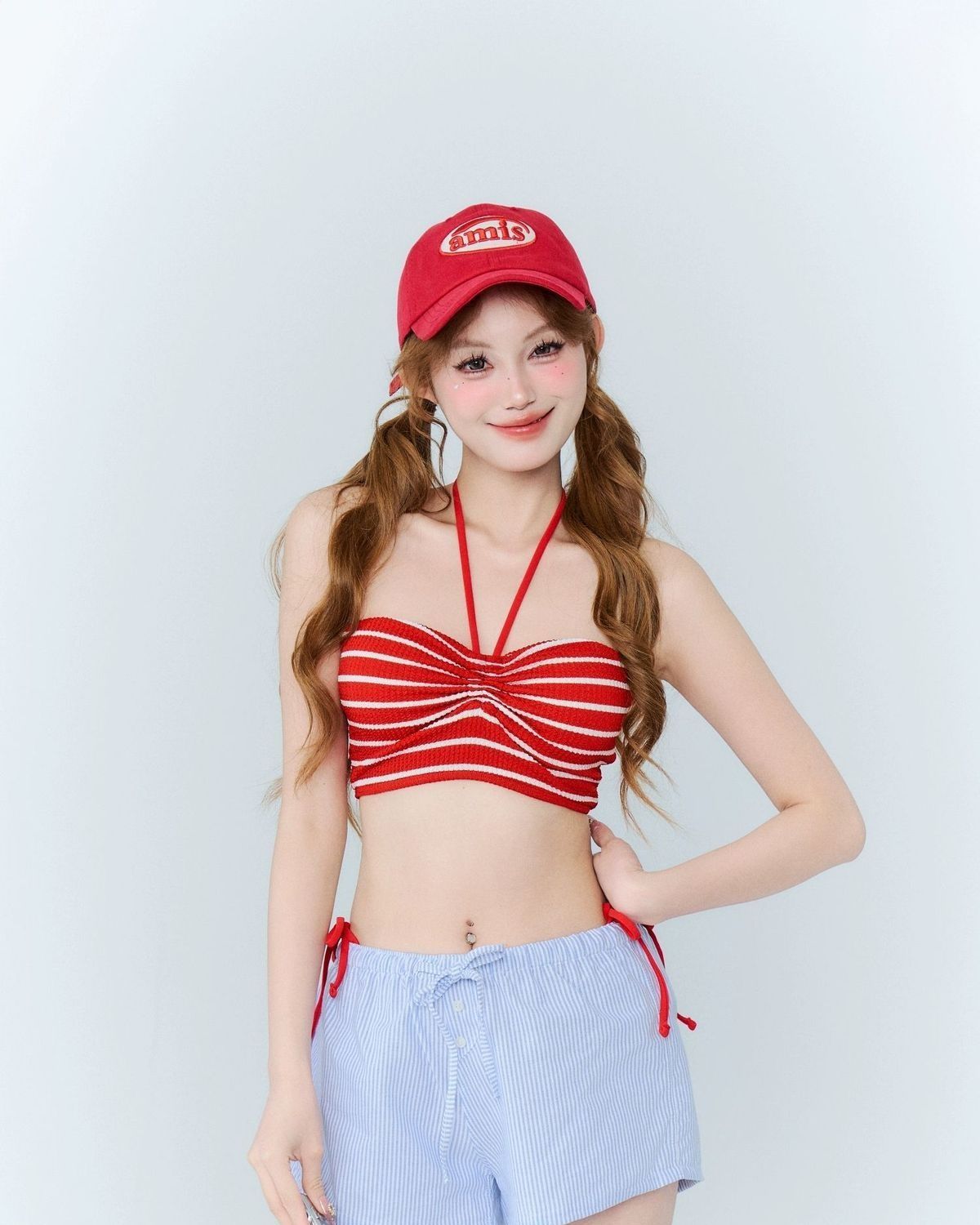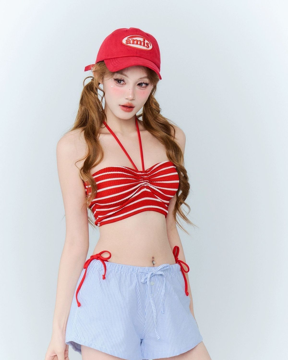 SWIMMINGWARM 빈 소녀 붉은 줄무늬 섹시 교수형 목 높은 허리 보수 분할 온천 휴일 수영복