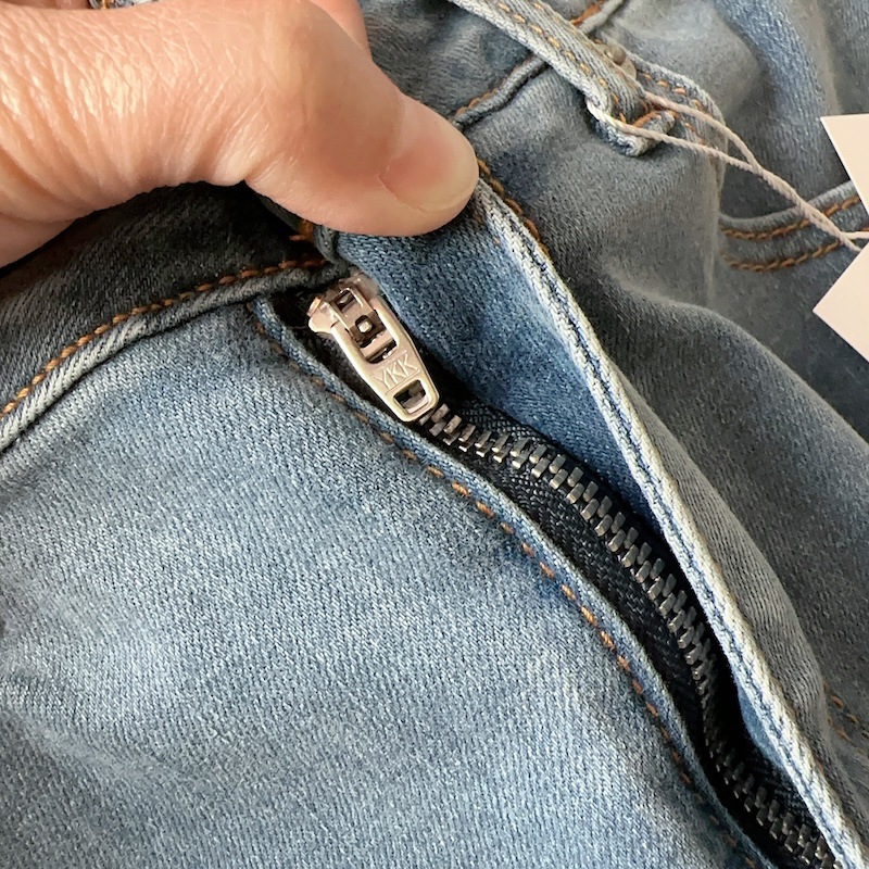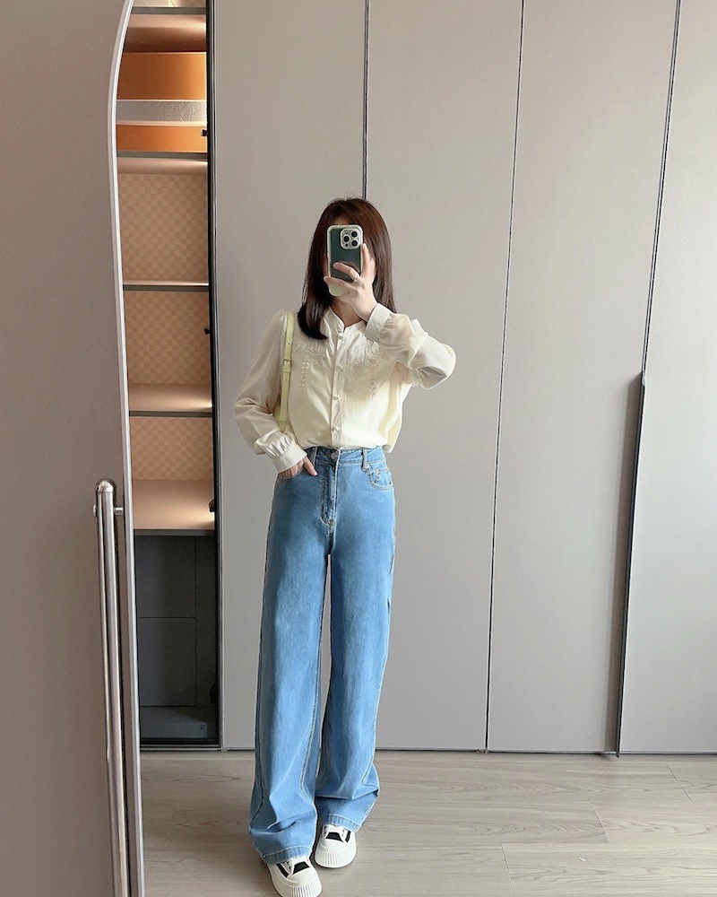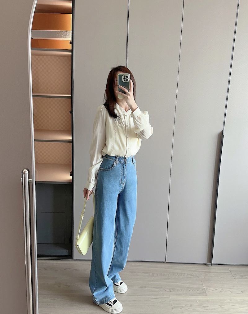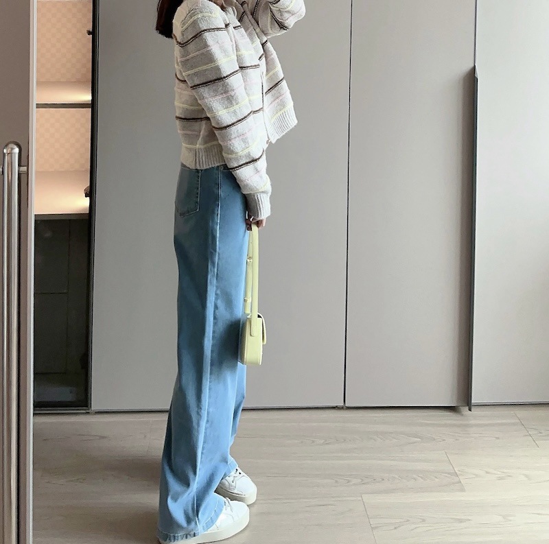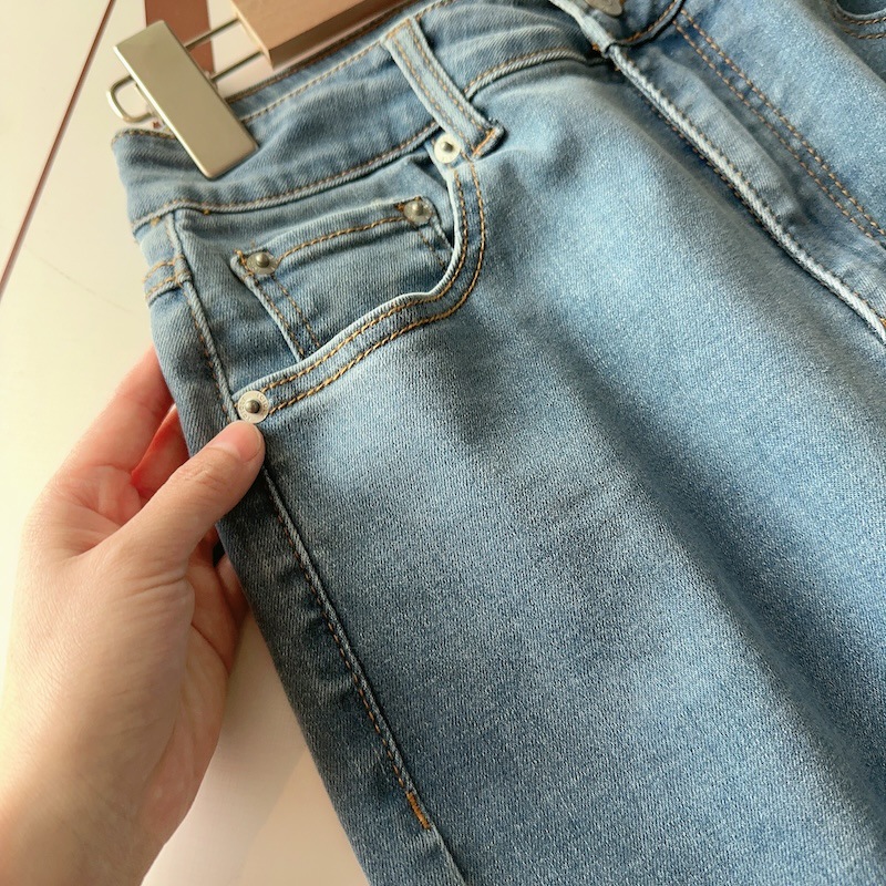 上身显得非常干净清爽,面料是非常的针织牛仔,非常高的弹力,
