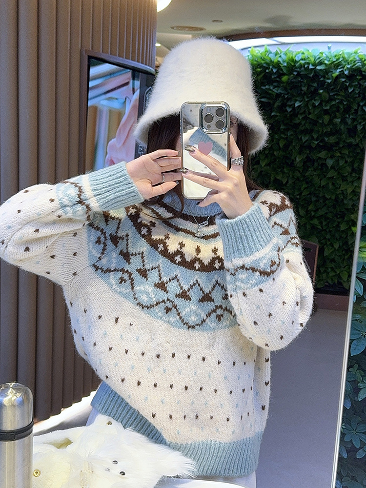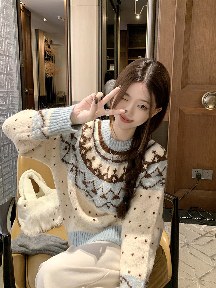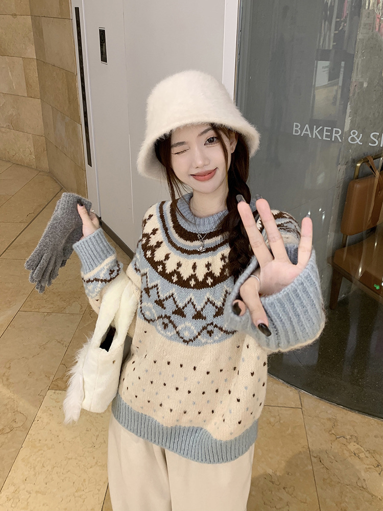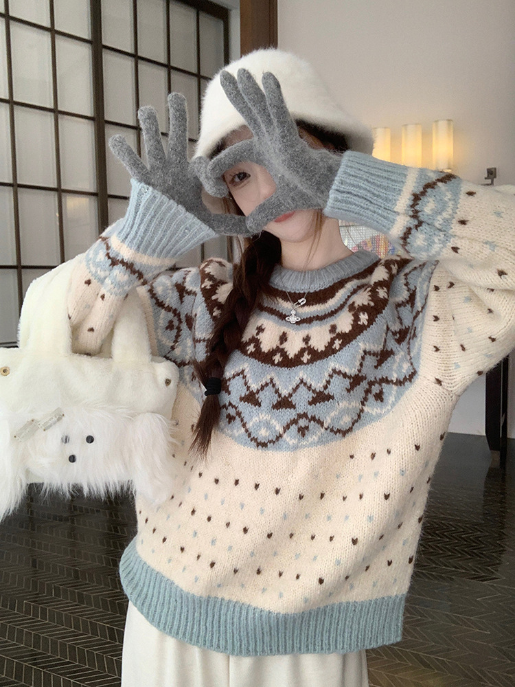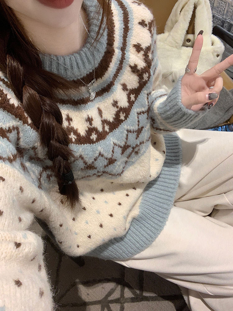 크리스마스 스웨터 달콤한 스타일 대비 색상 라운드 넥 풀오버 스웨터 여성의 겨울 긴 소매 루즈베이스 셔츠 블루 탑