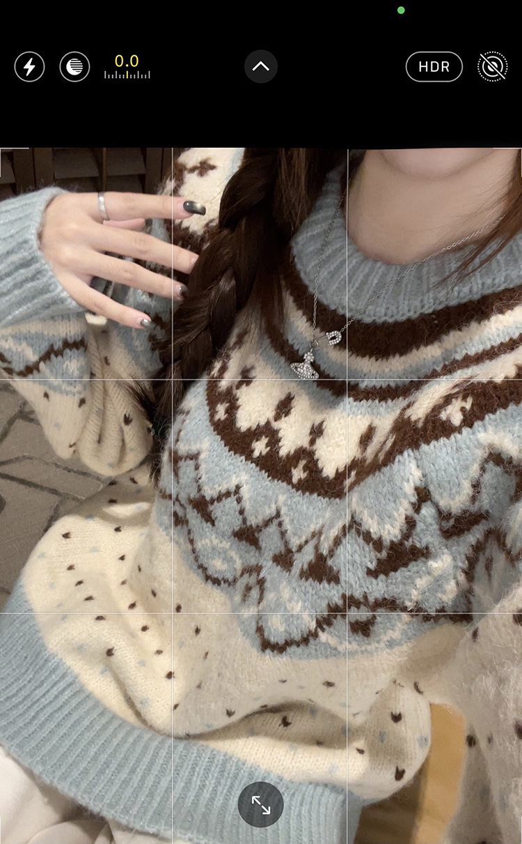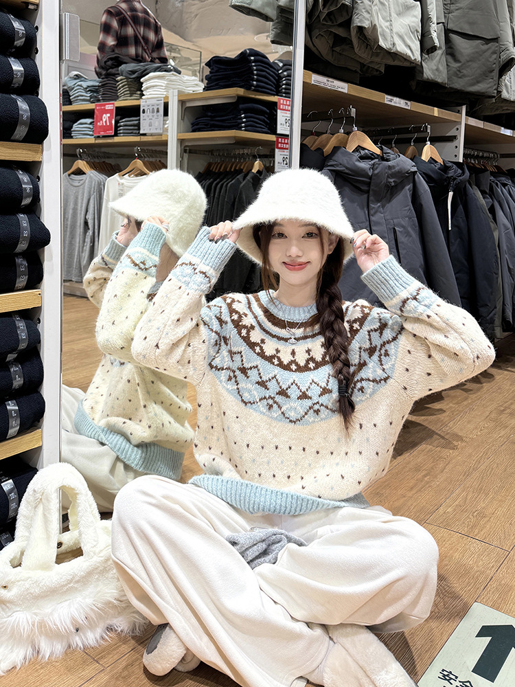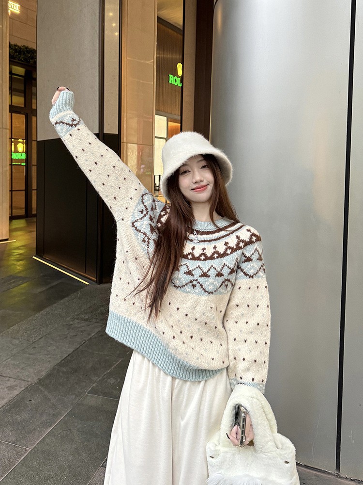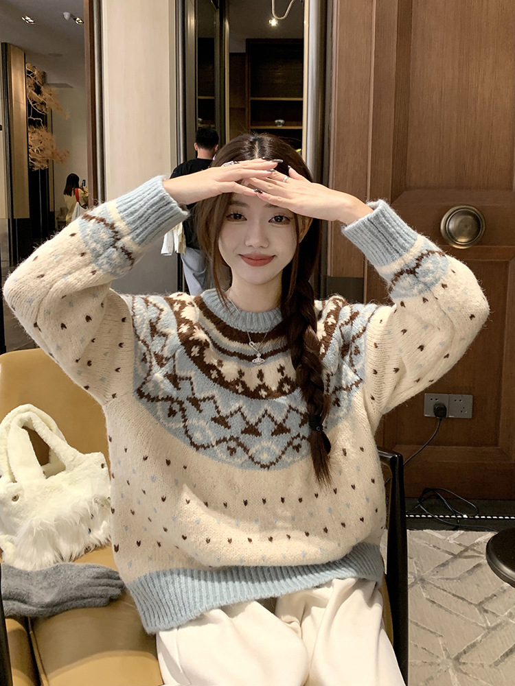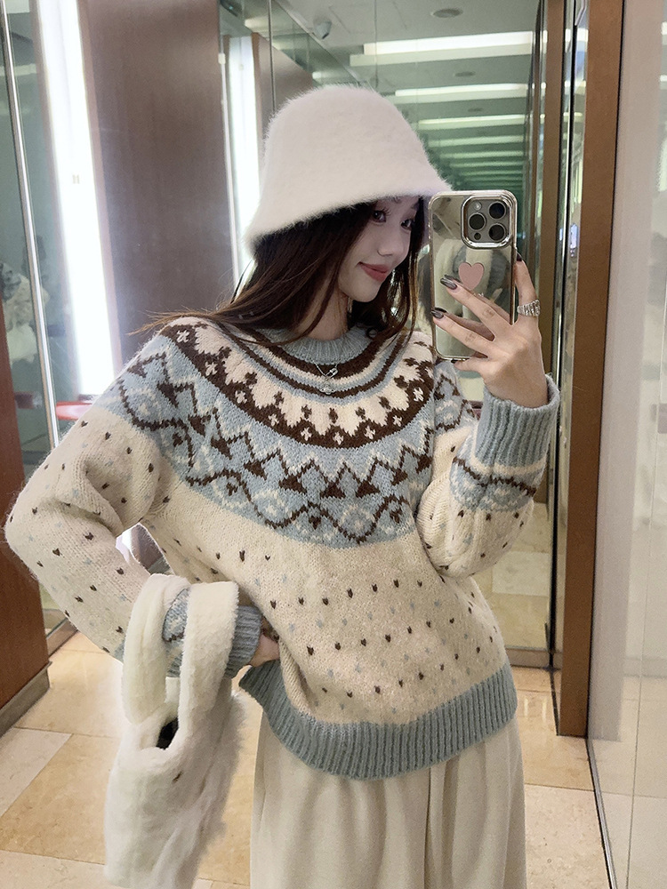 크리스마스 스웨터 달콤한 스타일 대비 색상 라운드 넥 풀오버 스웨터 여성의 겨울 긴 소매 루즈베이스 셔츠 블루 탑