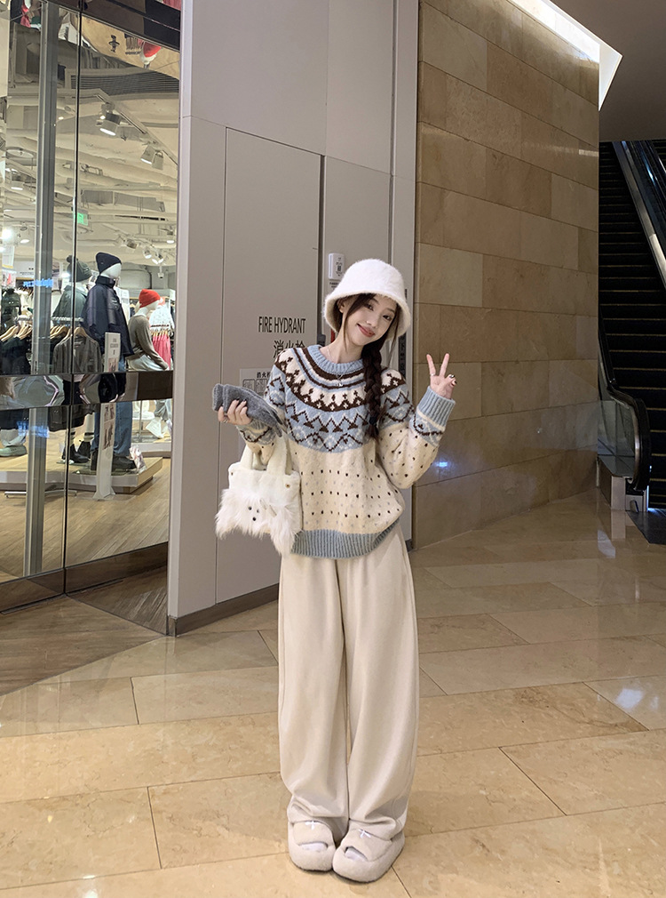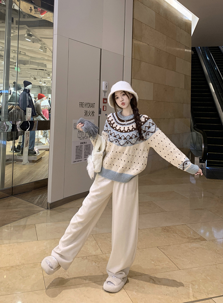 크리스마스 스웨터 달콤한 스타일 대비 색상 라운드 넥 풀오버 스웨터 여성의 겨울 긴 소매 루즈베이스 셔츠 블루 탑스토어 가기
