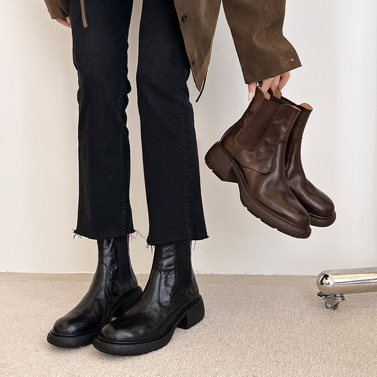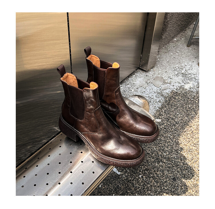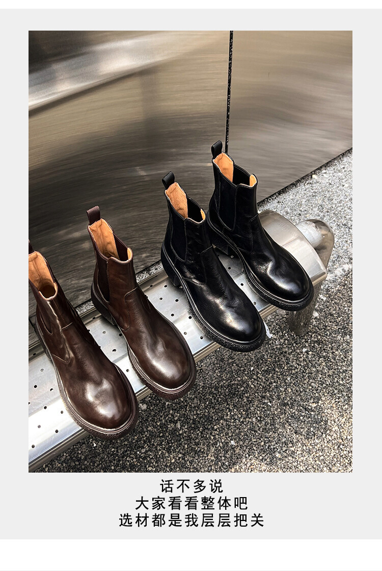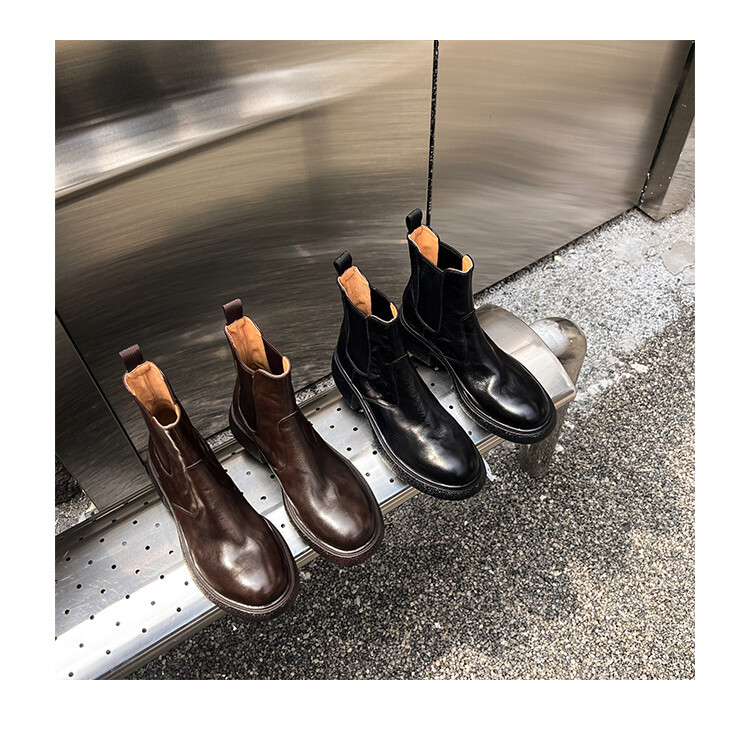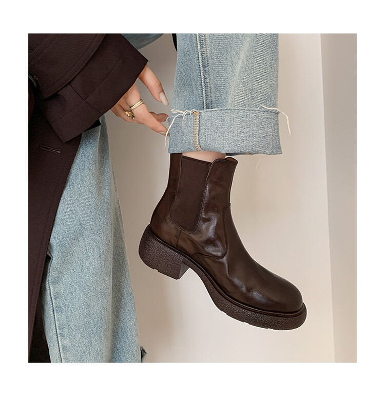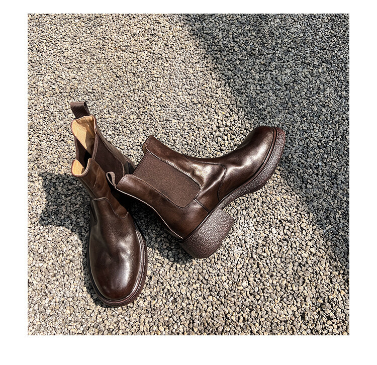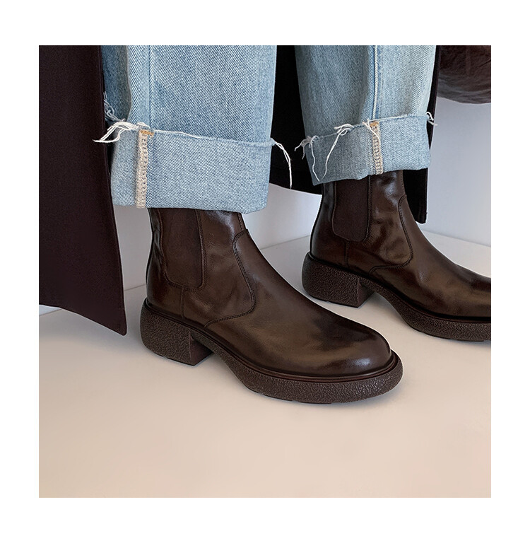 Cowhide 버전 ~ 레트로 다크 브라운 첼시 짧은 부츠 여자 가을과 겨울 2024 새로운 두꺼운 밑창 증가 마틴 부츠 여성스토어 가기