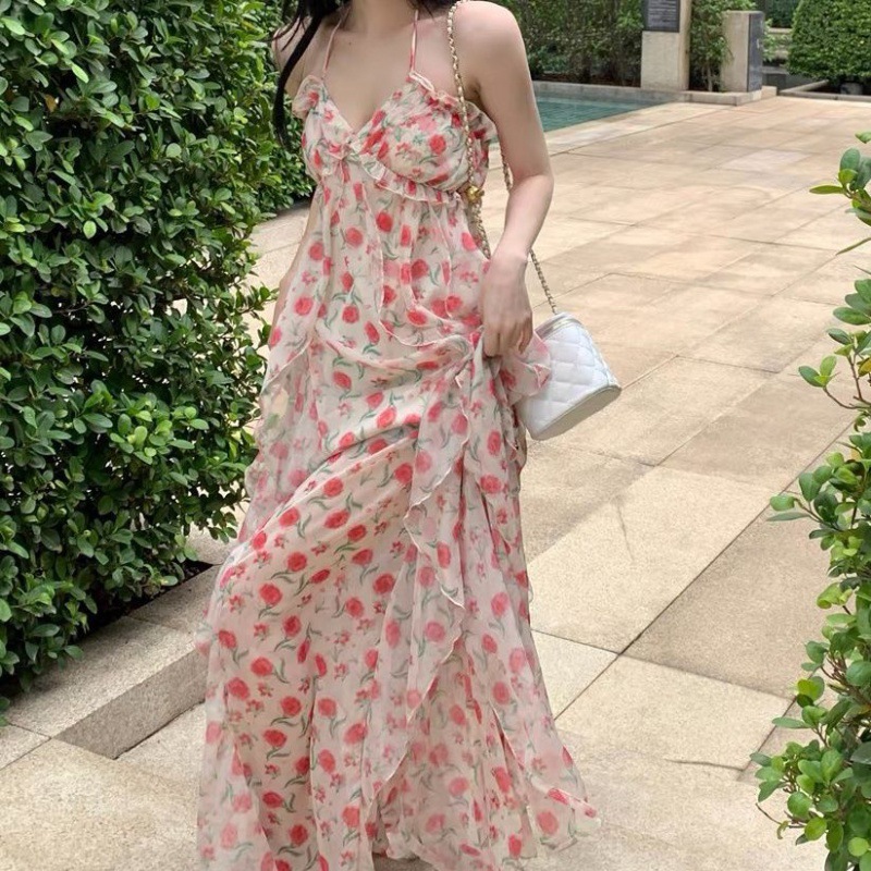 부드러운 스타일 꽃 슬링을위한 해변 긴 원피스 원피스 여성의 2023 타이트 허리 슬리밍 요정 분할 긴 원피스스토어 가기