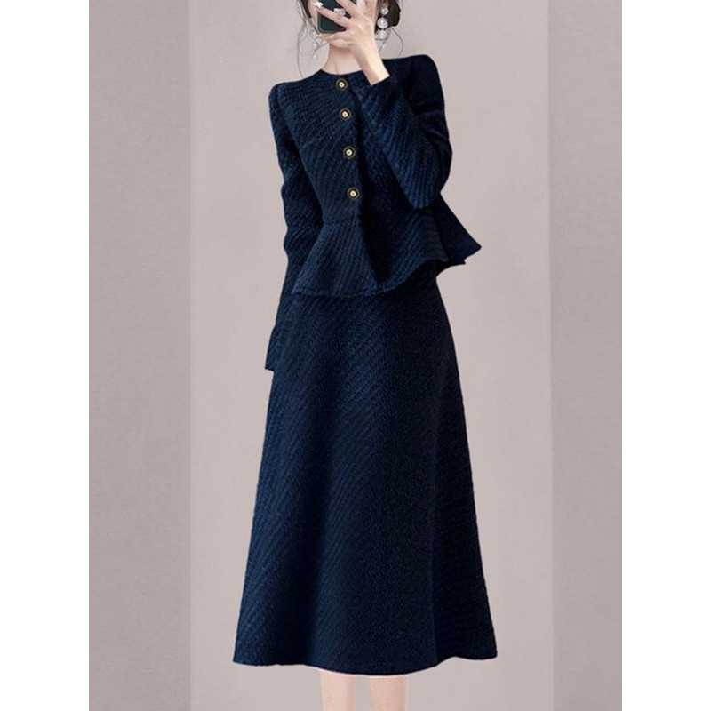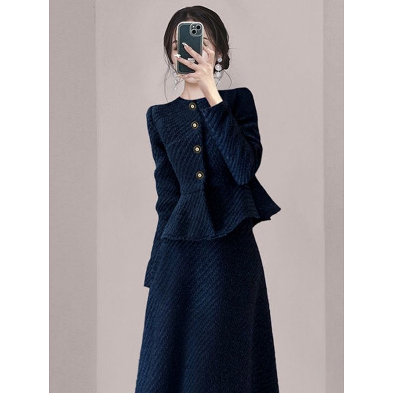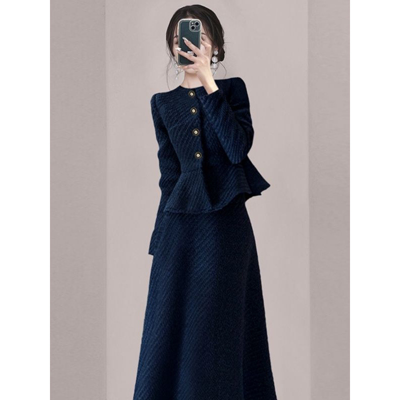 샤오 샹 스타일 블루 원피스 2024 가을 새로운 스타일 타이트 허리 슬리밍 연예인 우아한 슬림 핏 투피스 세트스토어 가기