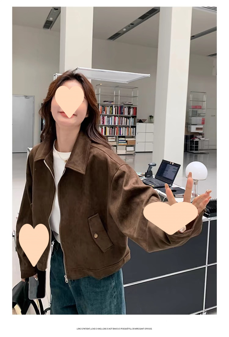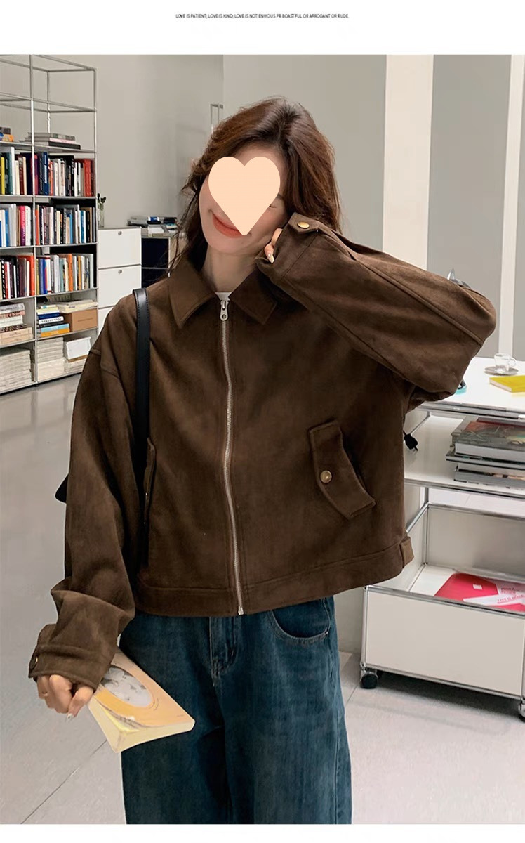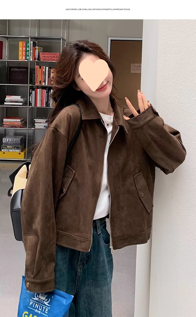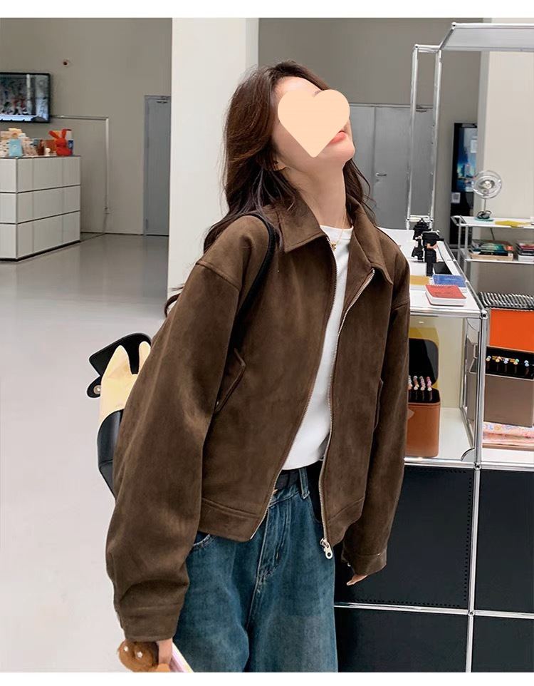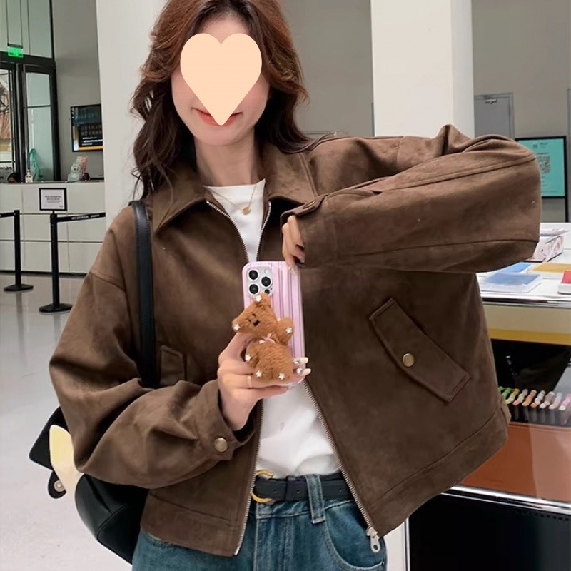 다크 브라운 Maillard 사슴 가죽 코트 여성의 봄과 가을 새로운 짧은 미국 스타일 쁘띠 레트로 바이커 재킷 탑스토어 가기