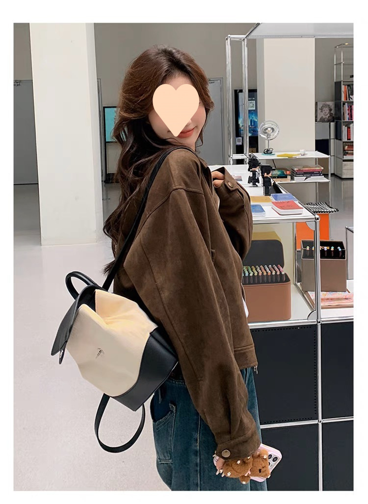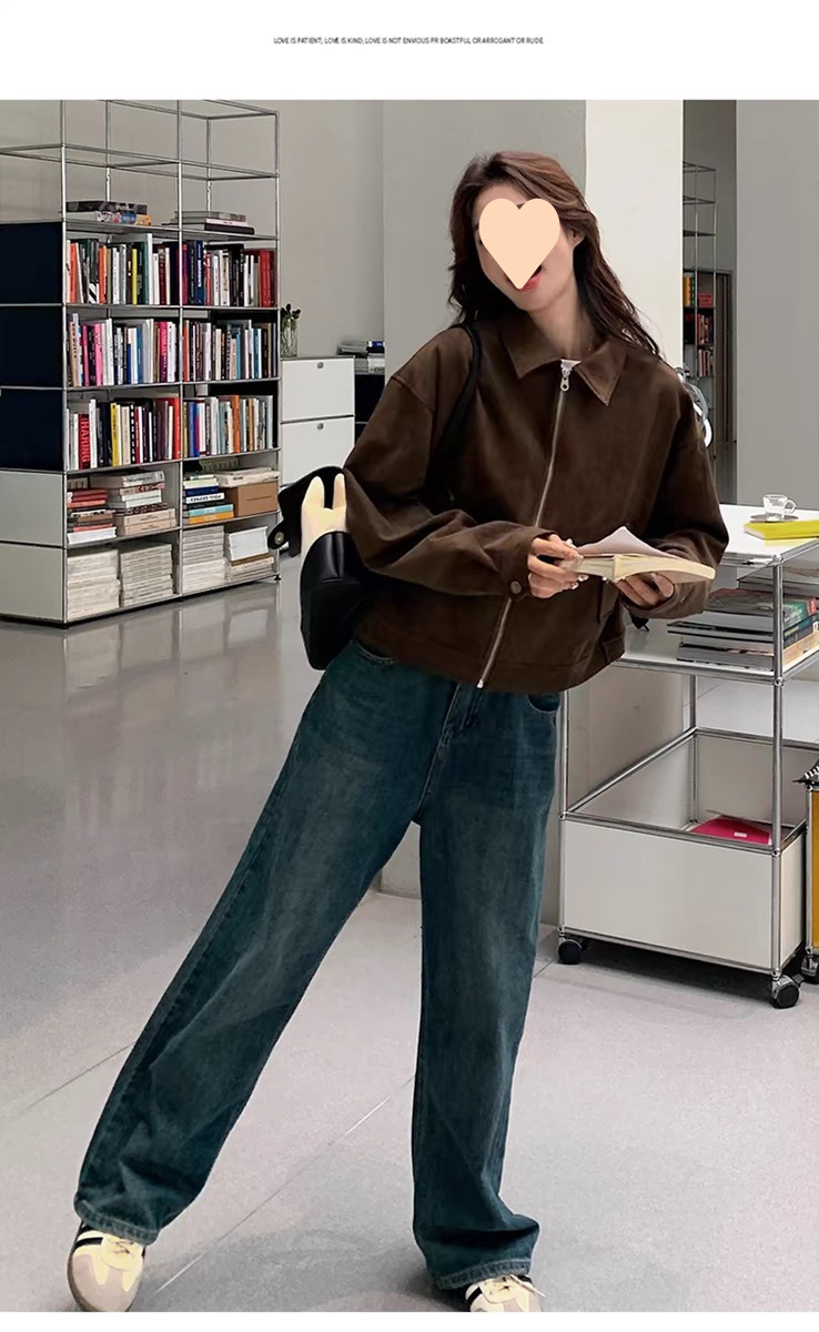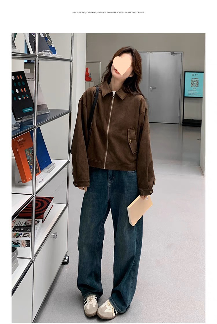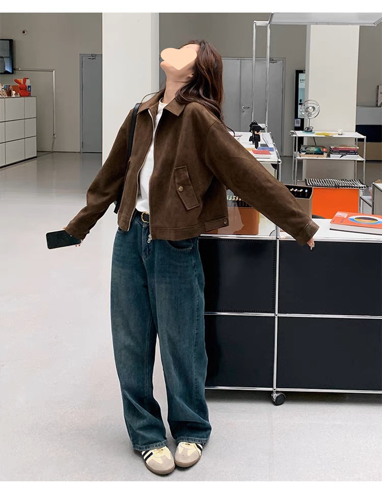 다크 브라운 Maillard 사슴 가죽 코트 여성의 봄과 가을 새로운 짧은 미국 스타일 쁘띠 레트로 바이커 재킷 탑스토어 가기