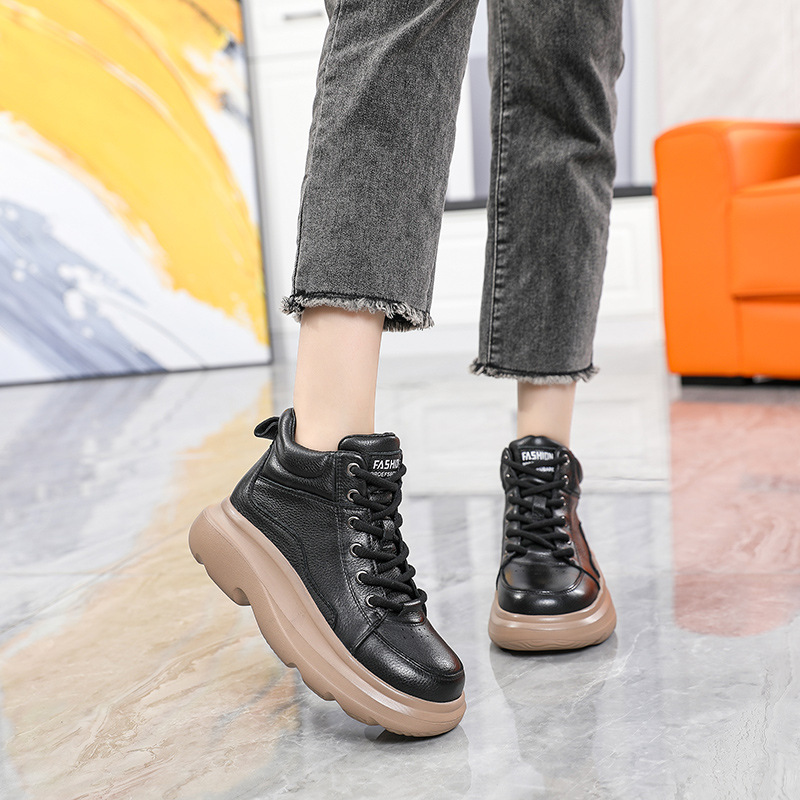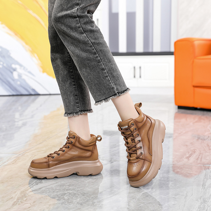 2024 가을과 겨울 새로운 소 가죽 라운드 헤드 플랫 힐 짧은 부츠 따뜻한 기모 빵 부츠 여성용 두꺼운 밑창 부츠 라이트 마틴 부츠