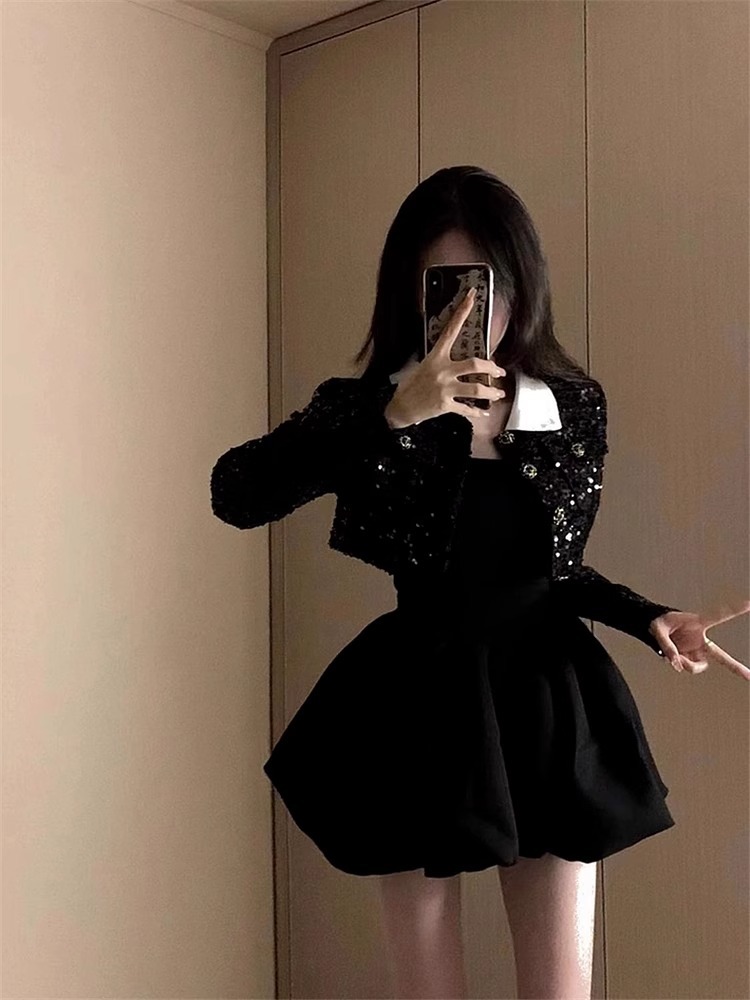 작은 향기로운 스타일 패션 세트 봄과 가을 새로운 디자인 센스 연예인 스타일 짧은 코트 스퀘어 칼라 공주 원피스
