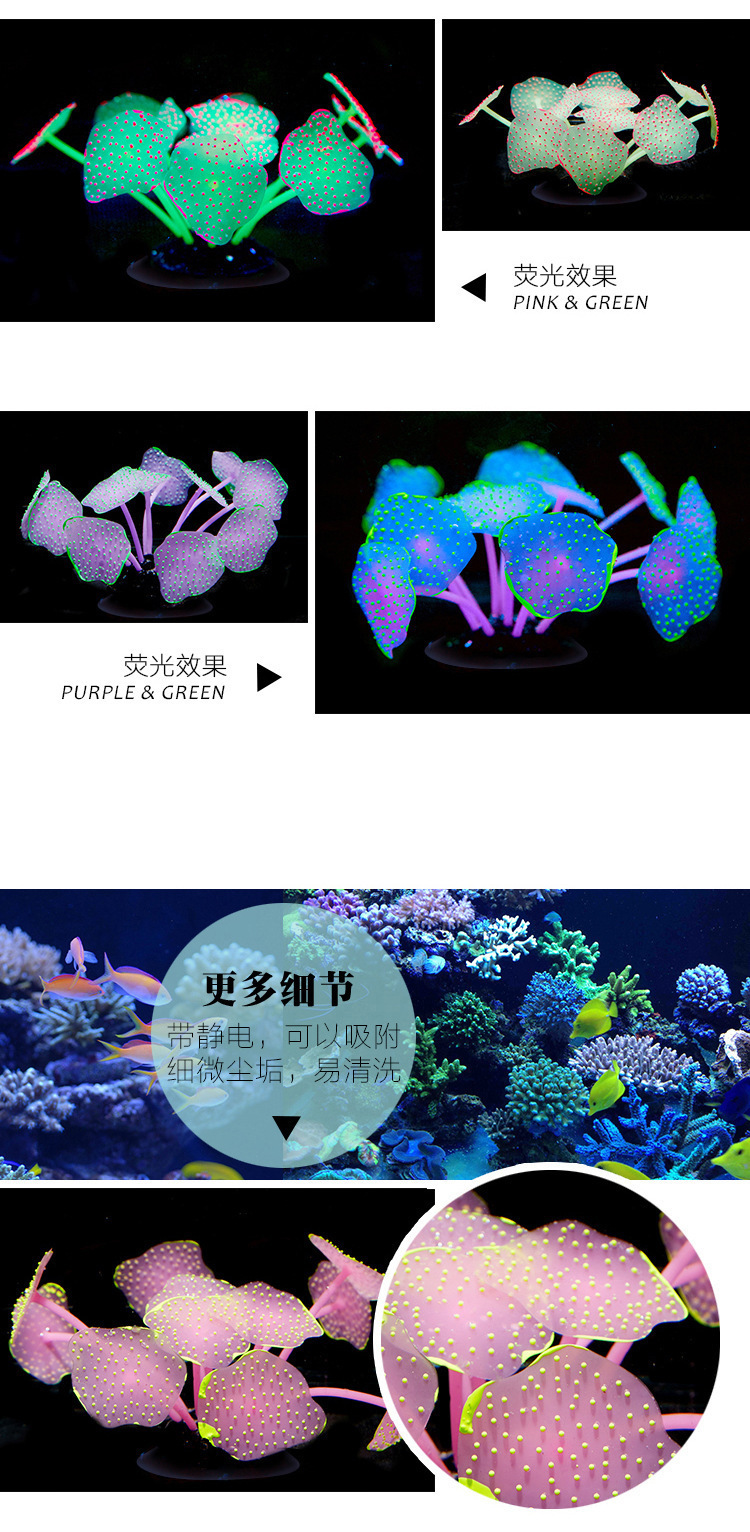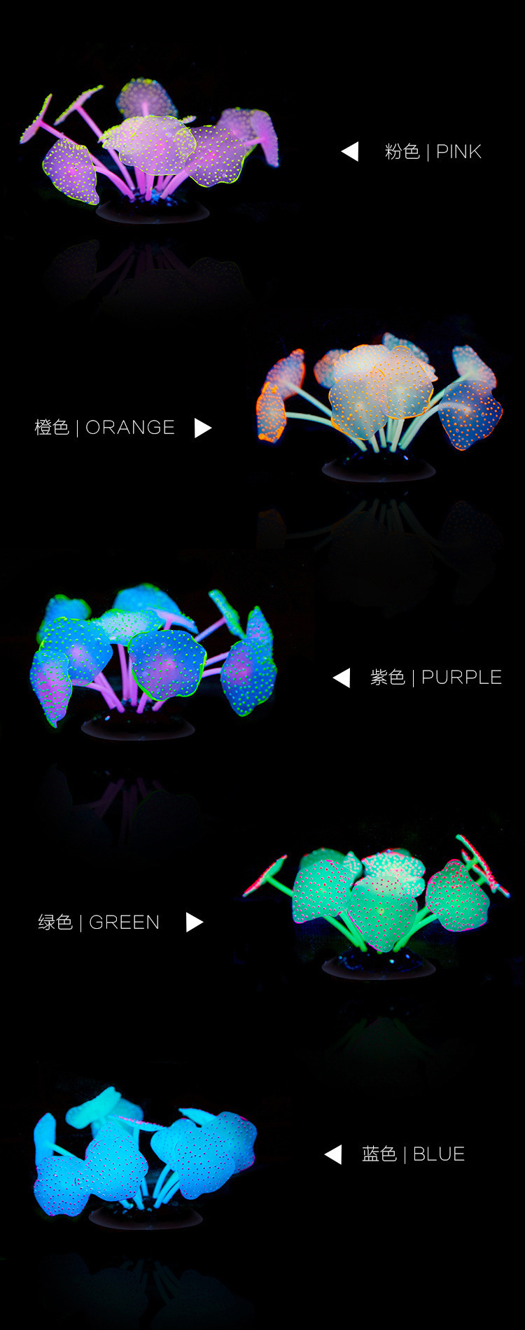 • 珊瑚本身不会发光,如果要有荧光效果建议使用荧光灯,荧光仅仅是色泽,纯黑暗环境不会发光