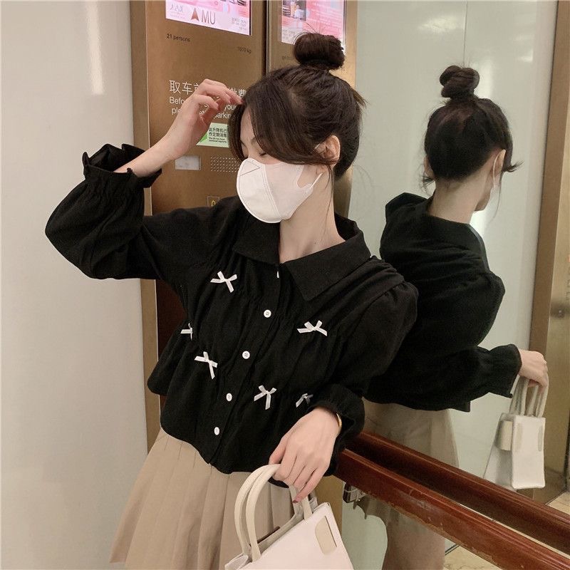 디자인 감각이 돋보이는 니치 리본 숏 셔츠 여성용 봄 가을 신상 달콤한 프렌치 스타일의 독특한 긴팔 셔츠스토어 가기