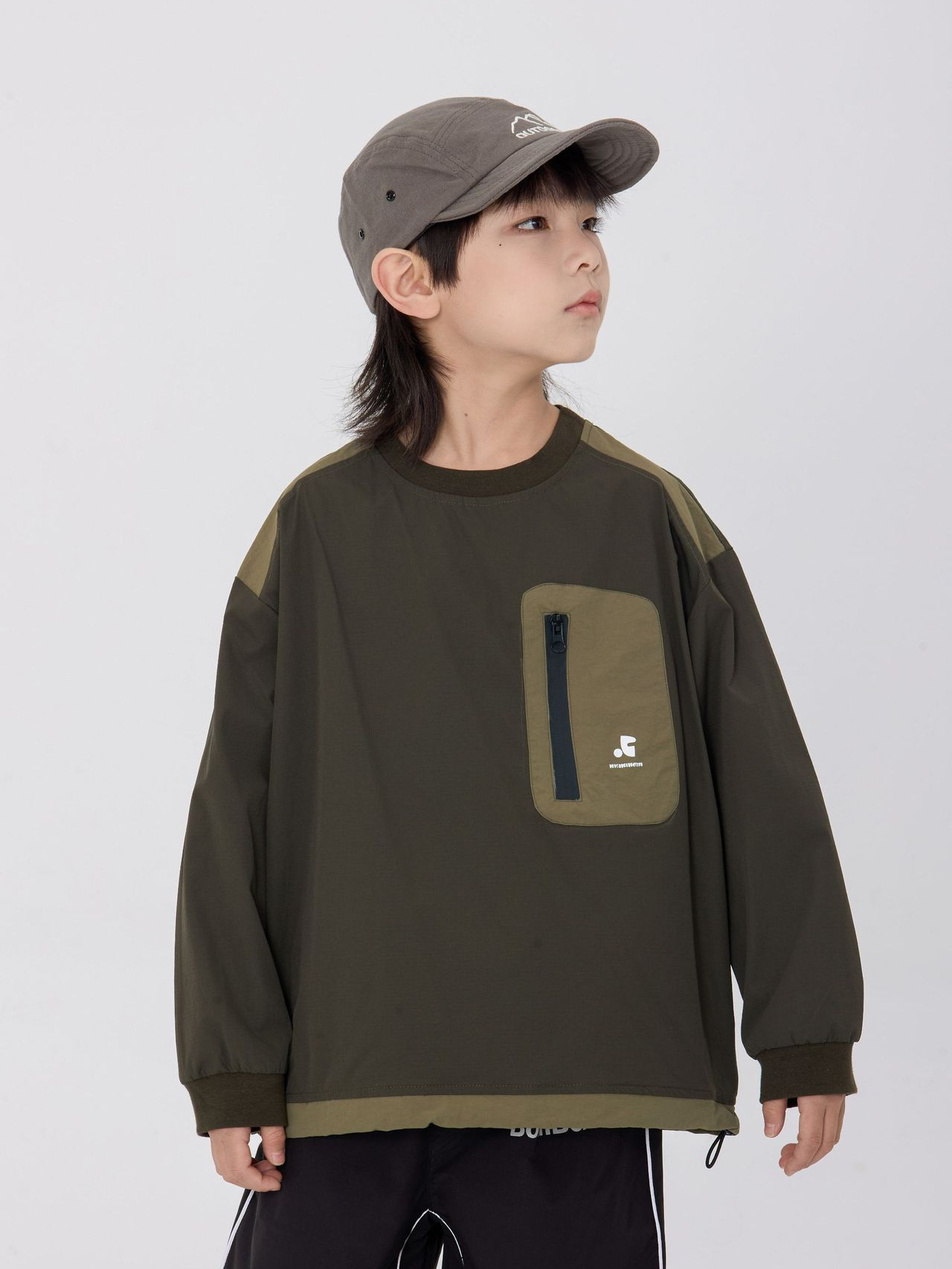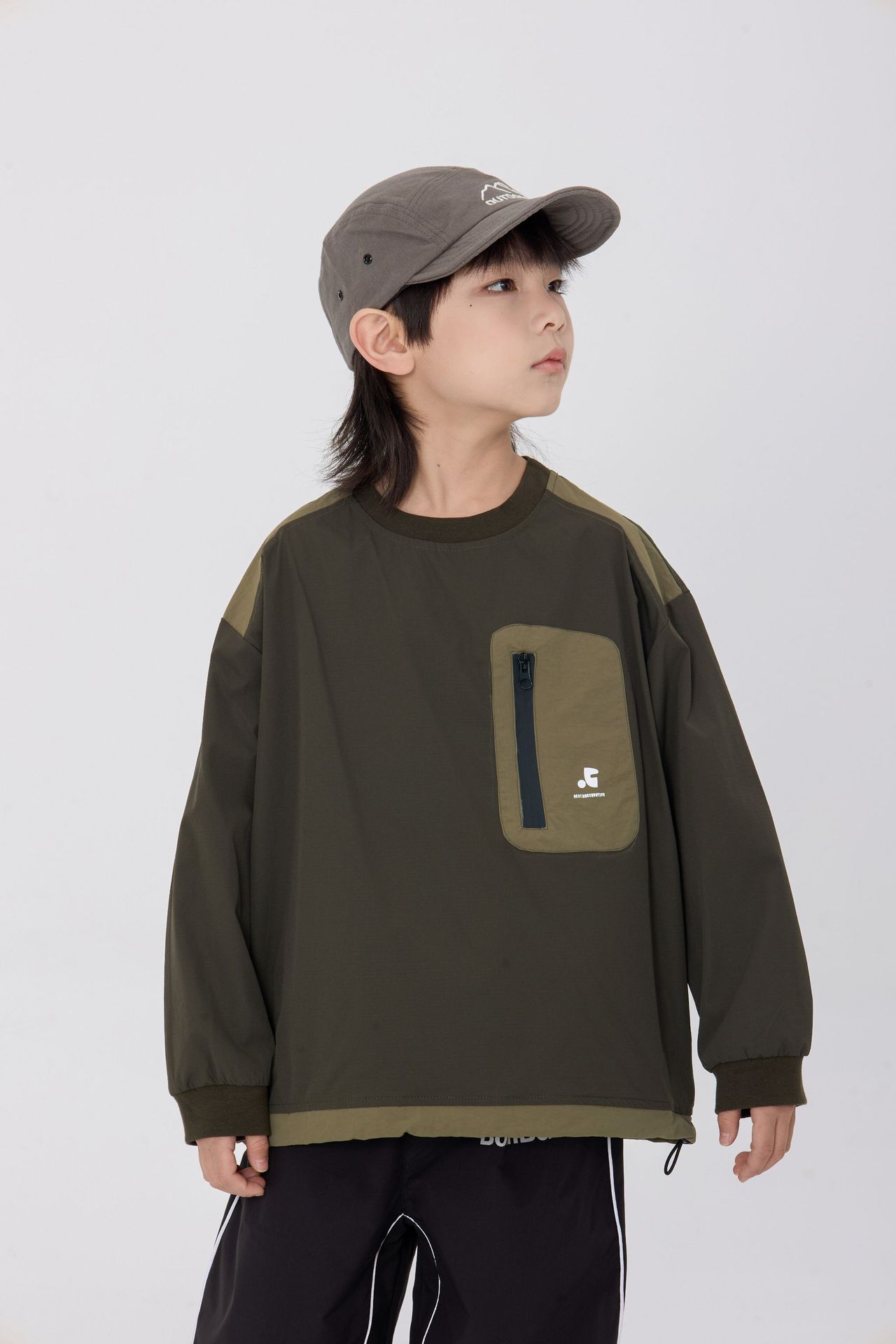 반품 및 교환 불가 어린이 방수 지퍼 장식 디자이너 스타일 긴팔 티셔츠 트렌디한 어린이용 짙은 녹색 연한 녹색 배색 티셔츠스토어 가기