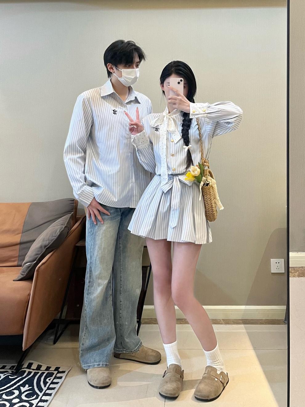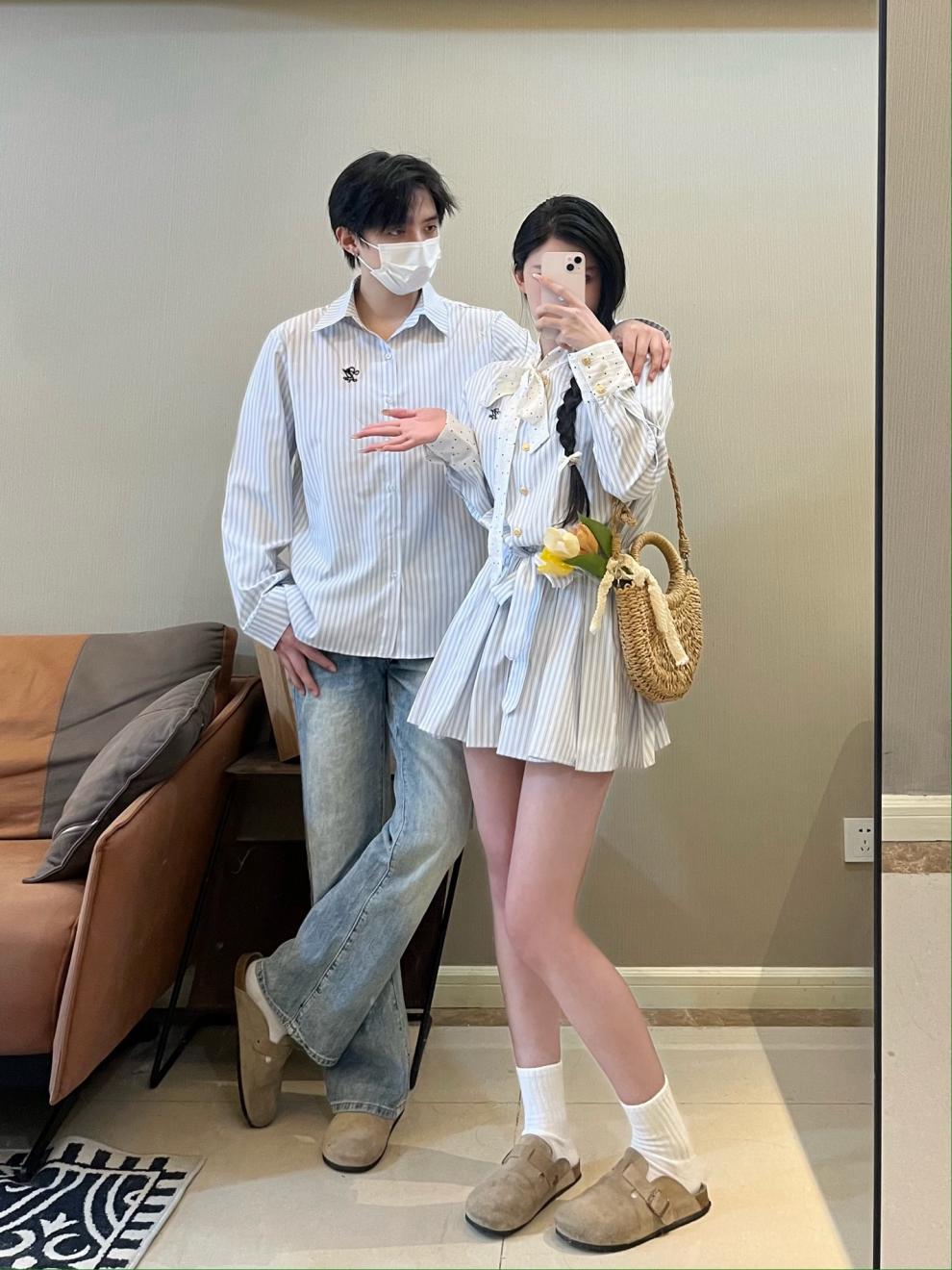 봄 2025 프랑스 기질 스티칭 대조 줄무늬 캐주얼 셔츠 원피스 타이트한 허리 슬리밍 커플 원피스