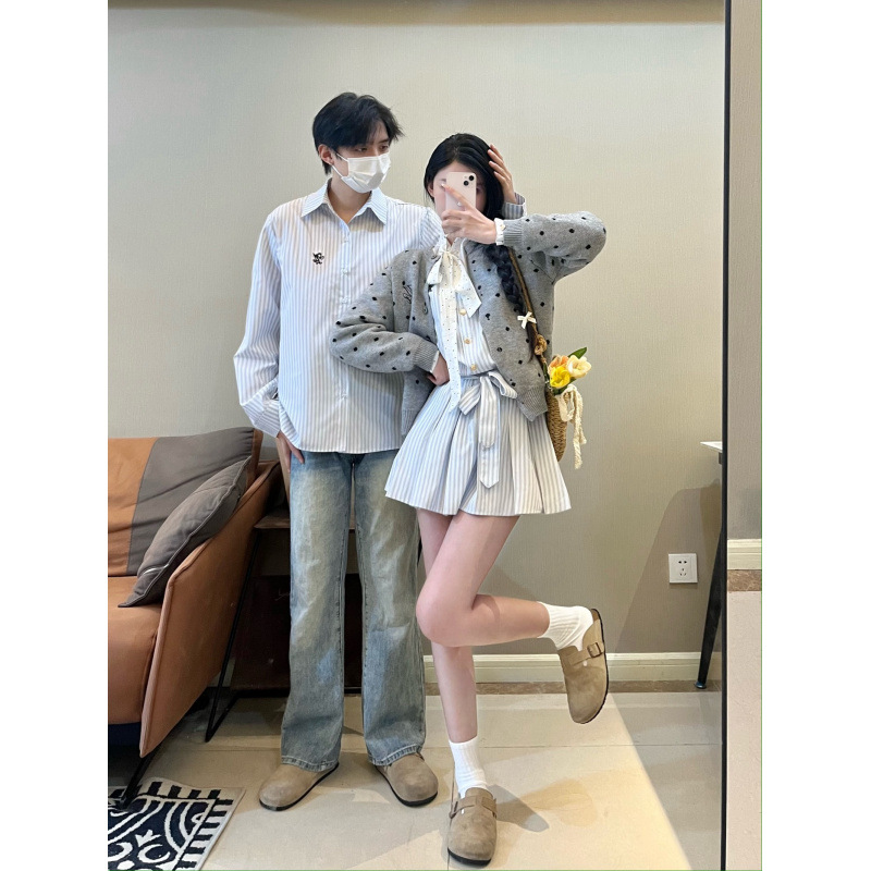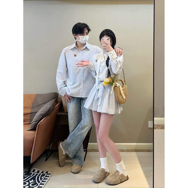 봄 2025 프랑스 기질 스티칭 대조 줄무늬 캐주얼 셔츠 원피스 타이트한 허리 슬리밍 커플 원피스스토어 가기