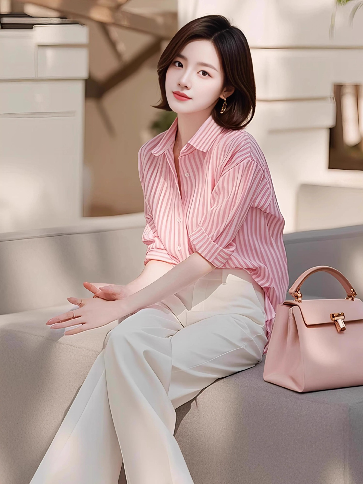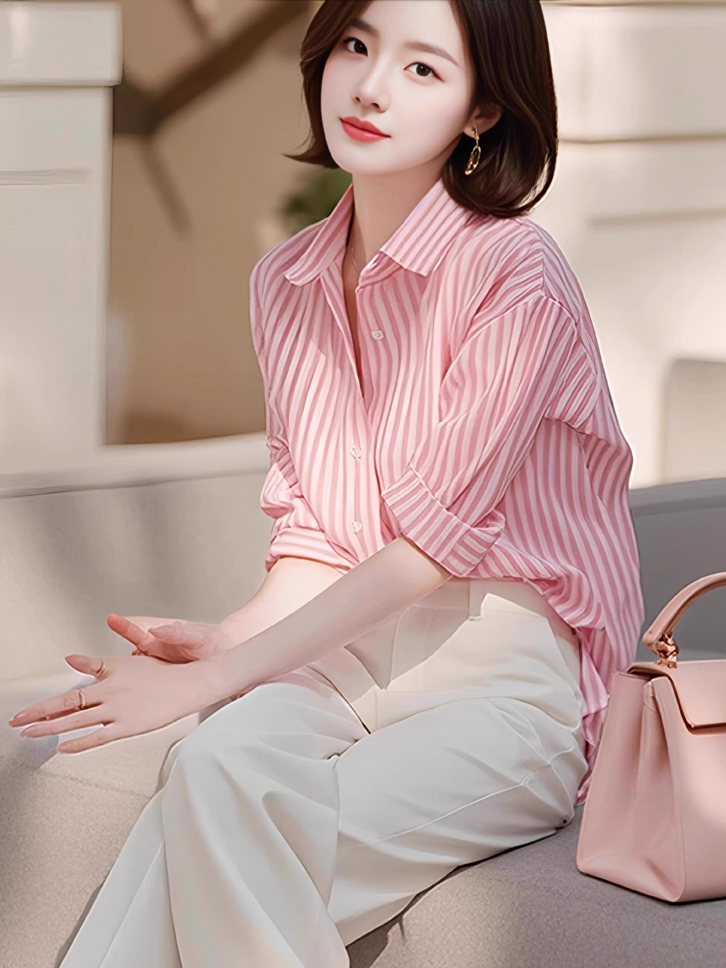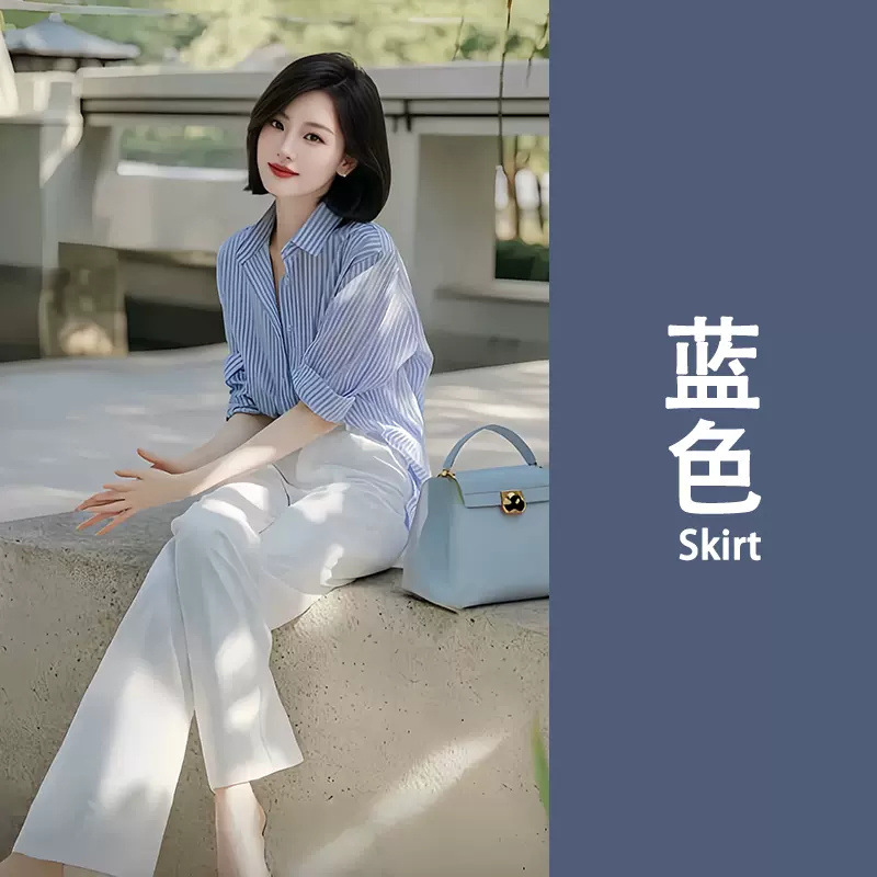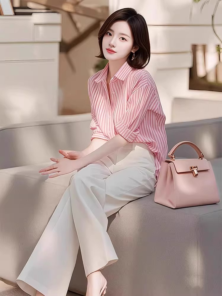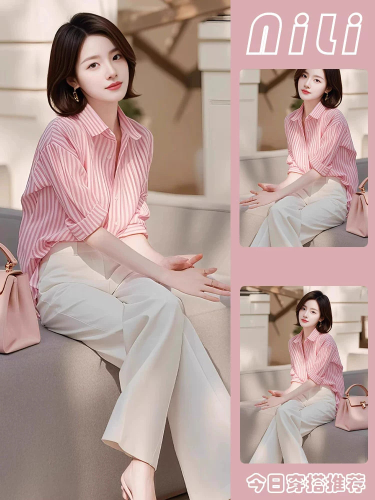 틈새 디자인 감각 우아한 제국 자매 투피스 여성 이른 봄 새로운 유행 연령 감소 줄무늬 셔츠 바지 세트
