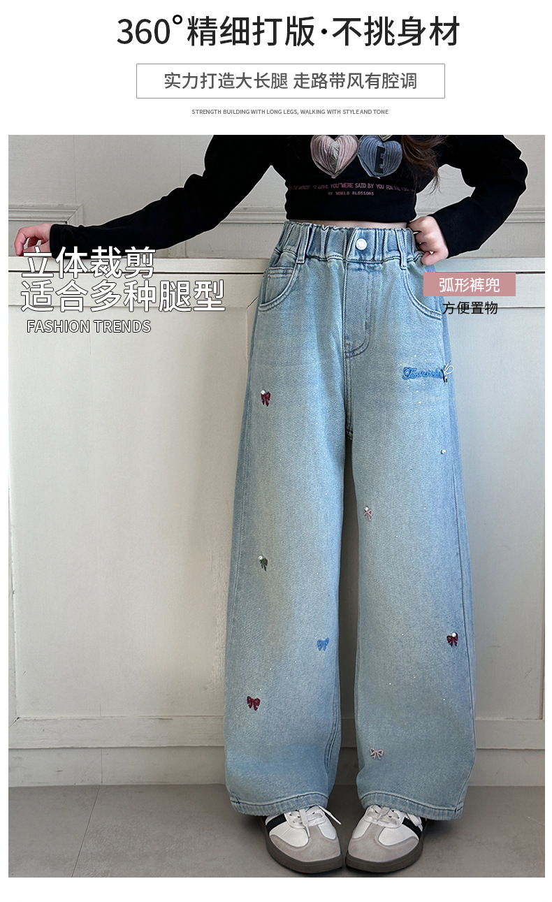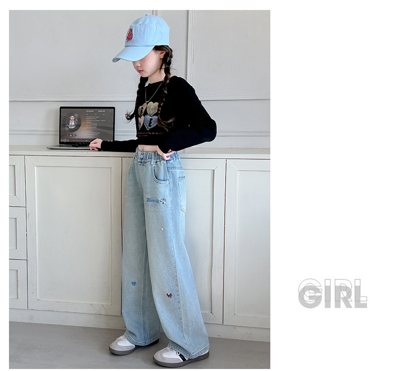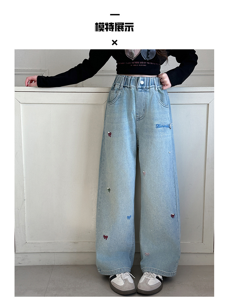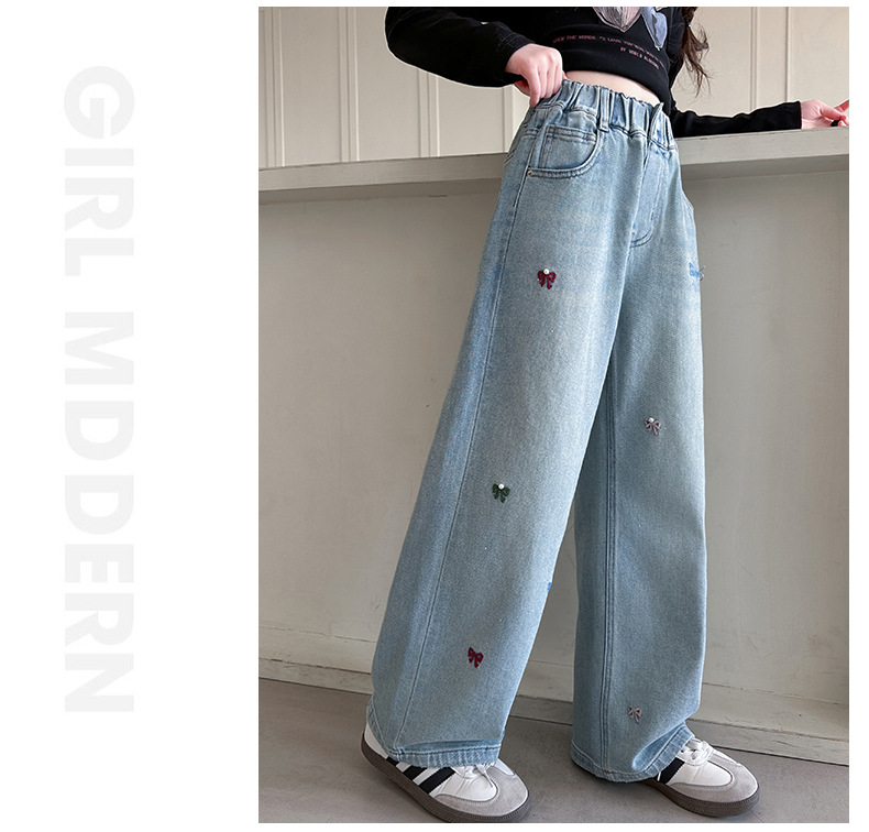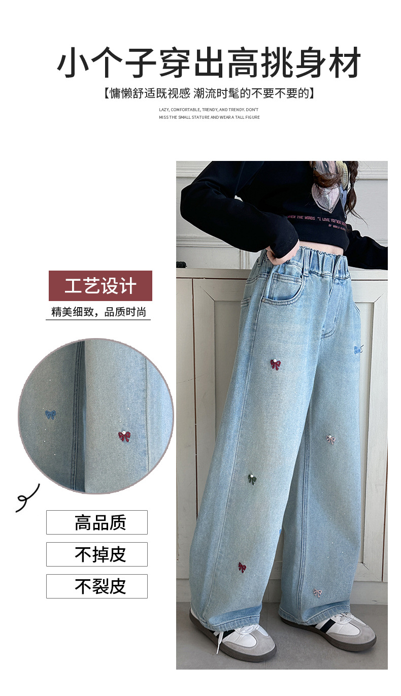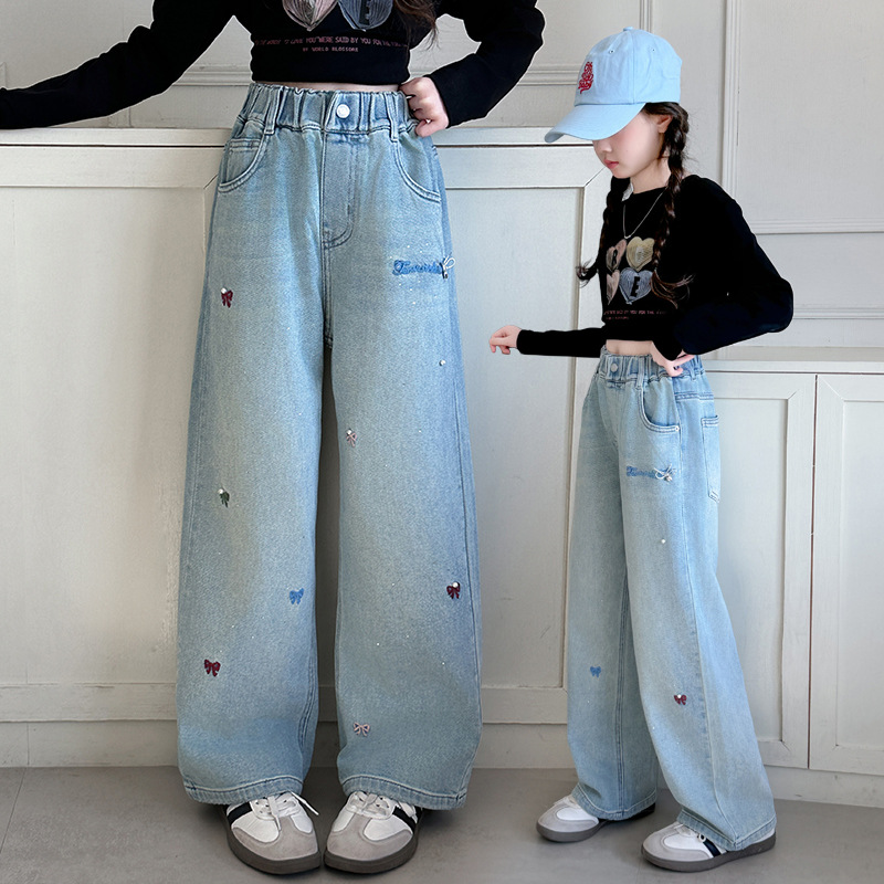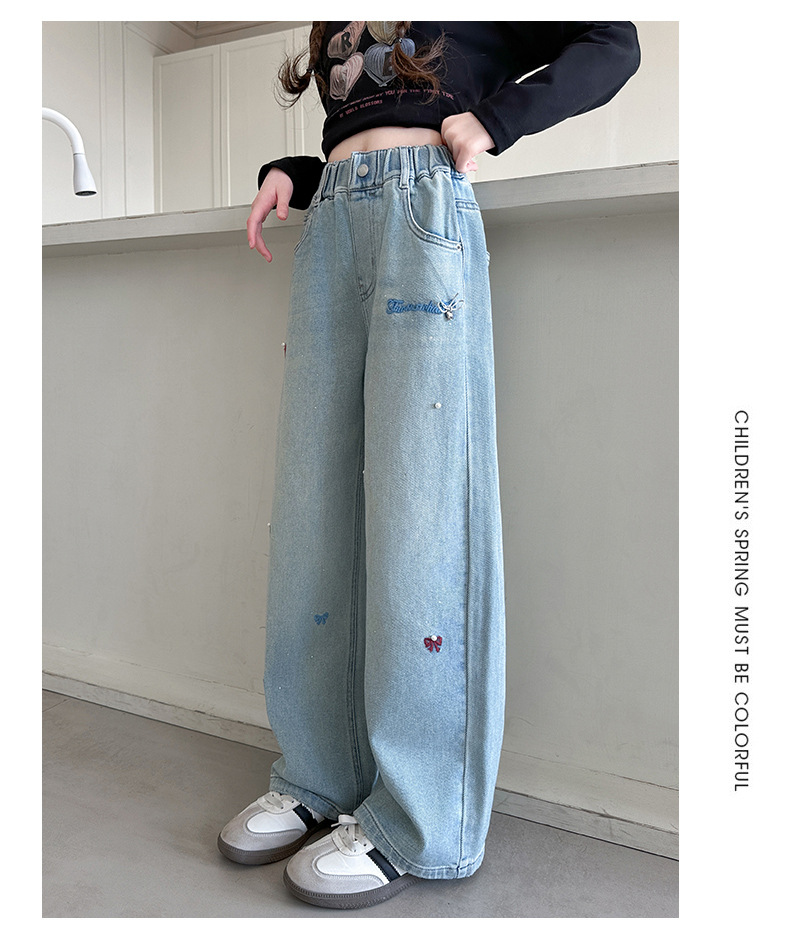 소녀 바지 봄과 가을 유행 서양식 인터넷 연예인 거리 넓은 다리 바지 봄 어린이 캐주얼 청바지스토어 가기