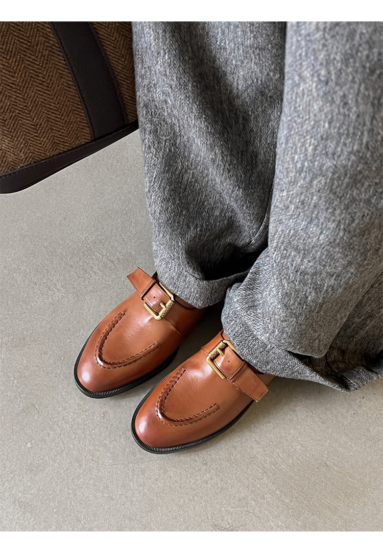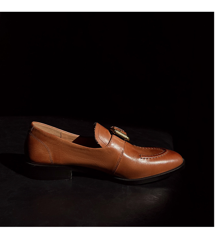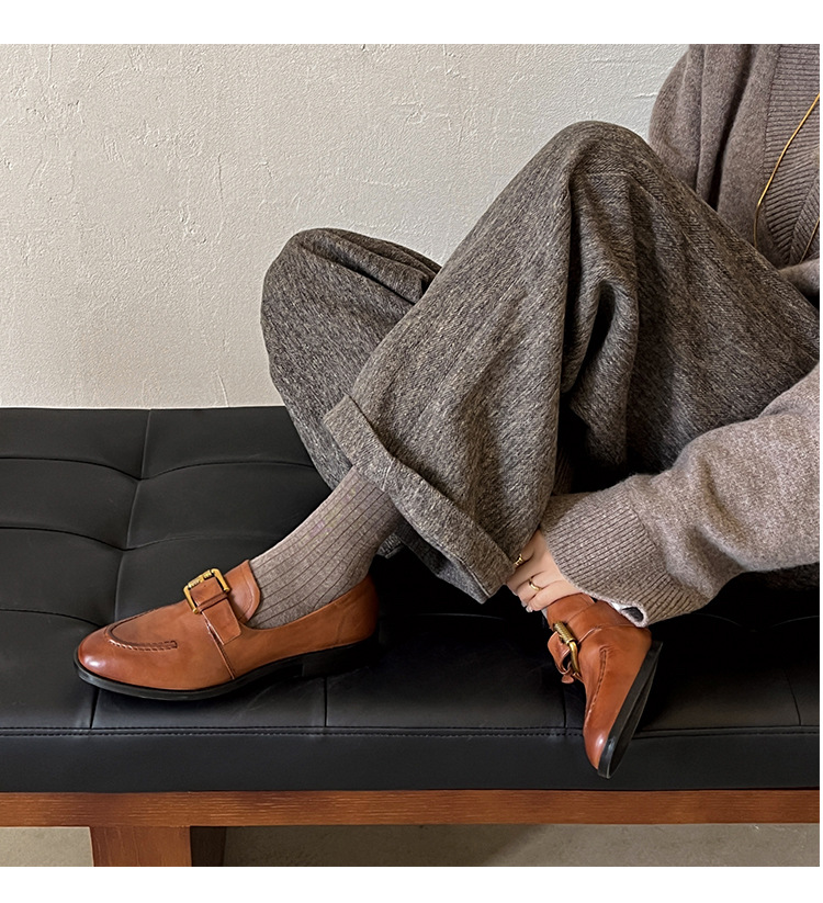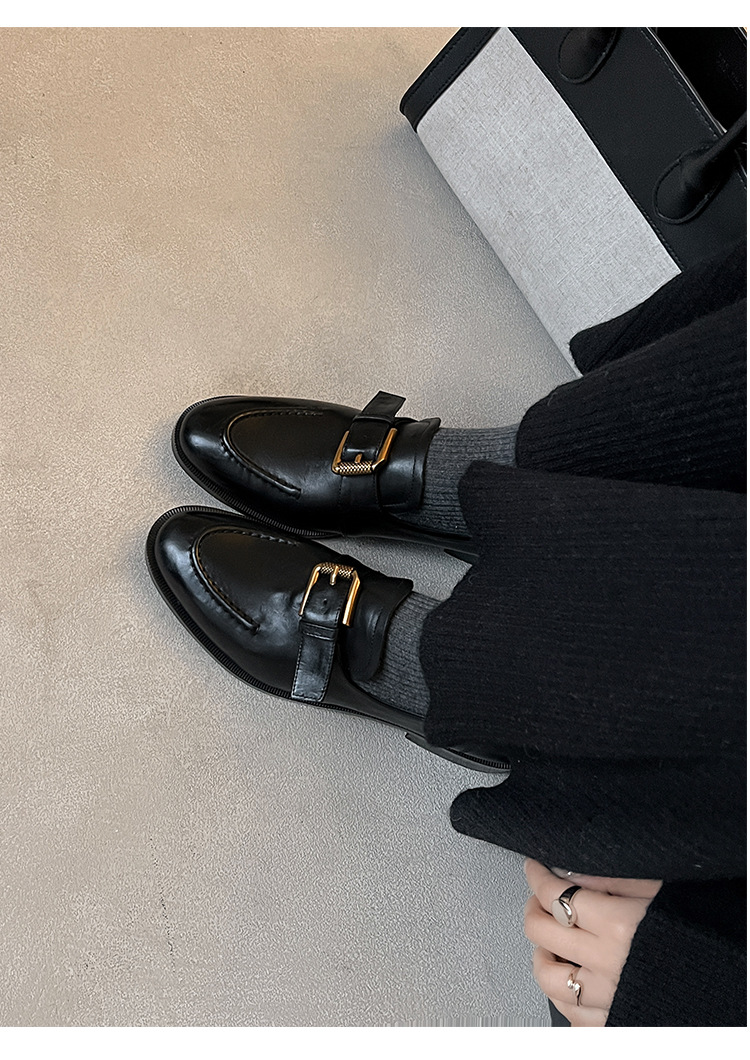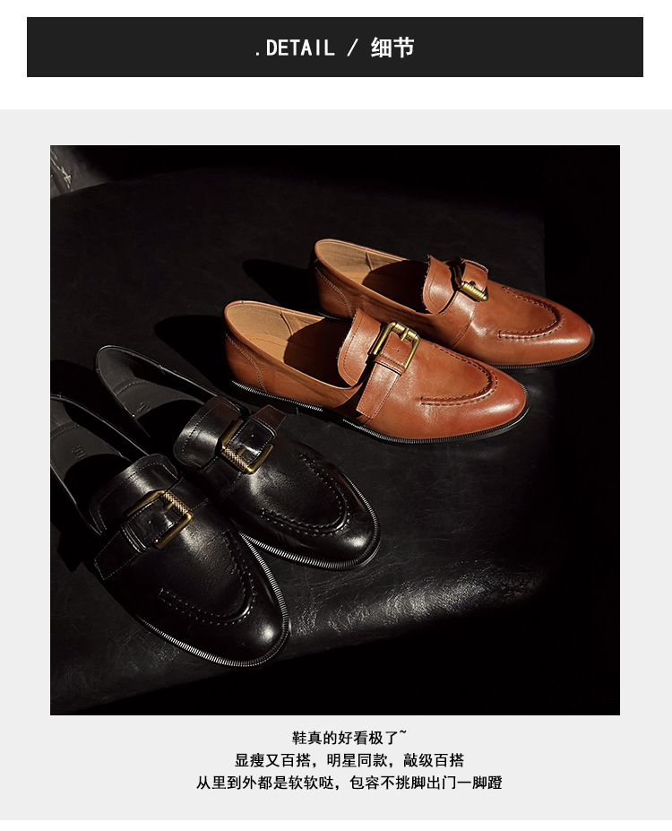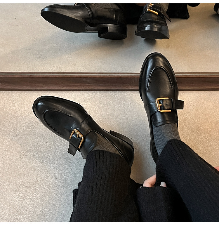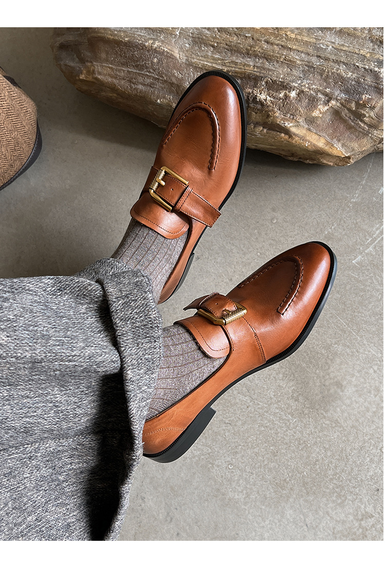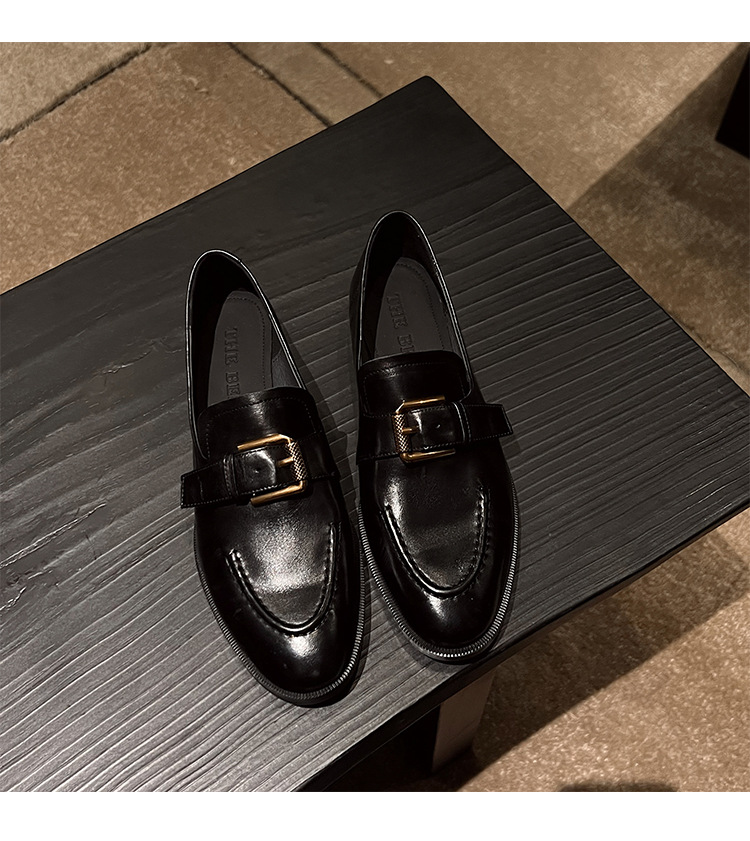 라운드 헤드 로퍼 여성 2025 봄 새로운 깊은 입 신발 벨트 버클 주름 탑 레이어 소 가죽 여성 신발 도매스토어 가기