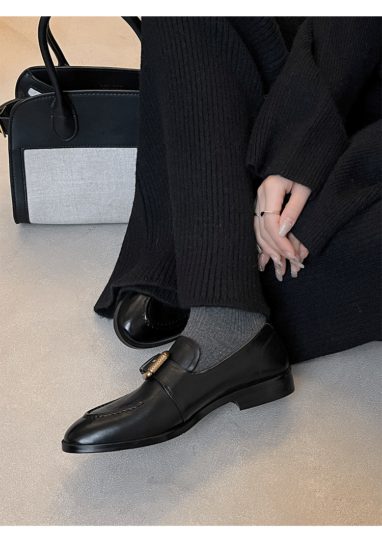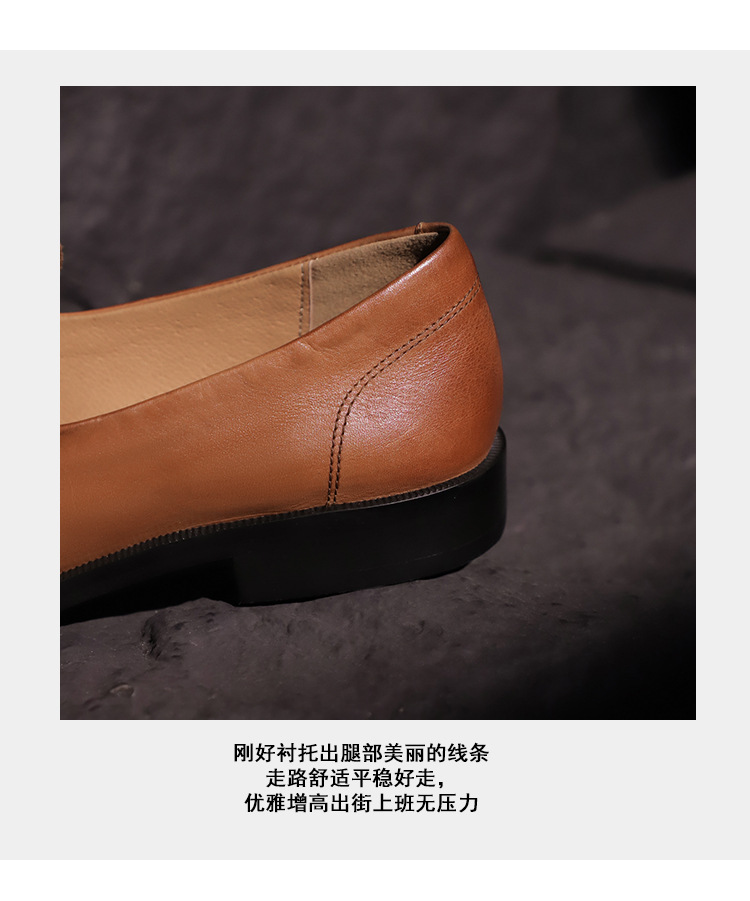 라운드 헤드 로퍼 여성 2025 봄 새로운 깊은 입 신발 벨트 버클 주름 탑 레이어 소 가죽 여성 신발 도매