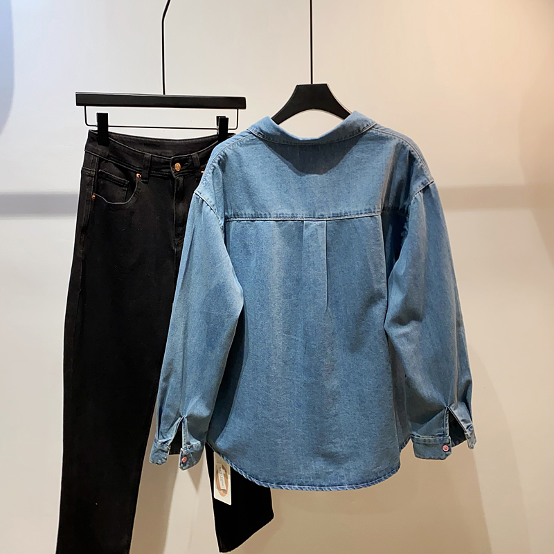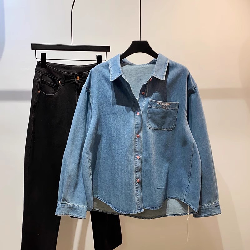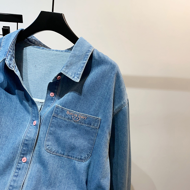 홍콩 스타일 빈티지 싱글 포켓 레터 자수 옷깃 데님 셔츠 여자 봄 새로운 도착 스택 올 매치 재킷