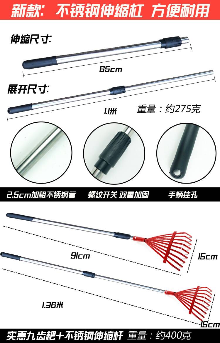 • 9톱니 낙엽 갈퀴 헤드 + 스테인레스 스틸 텔레스코픽 막대