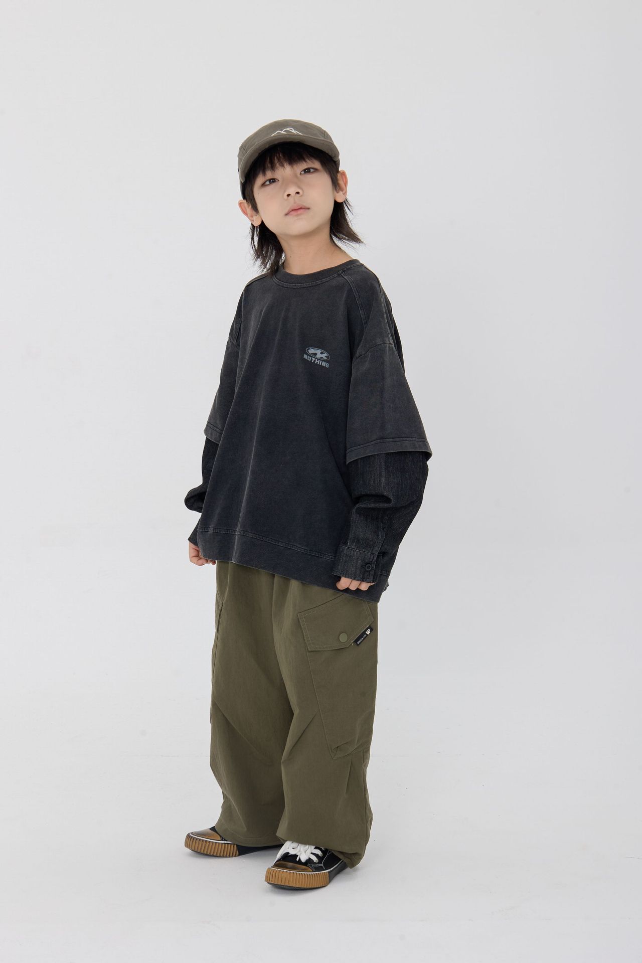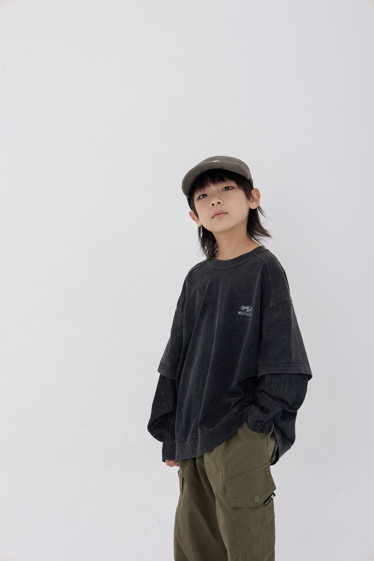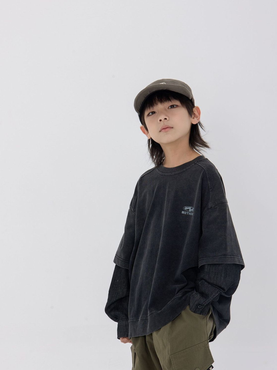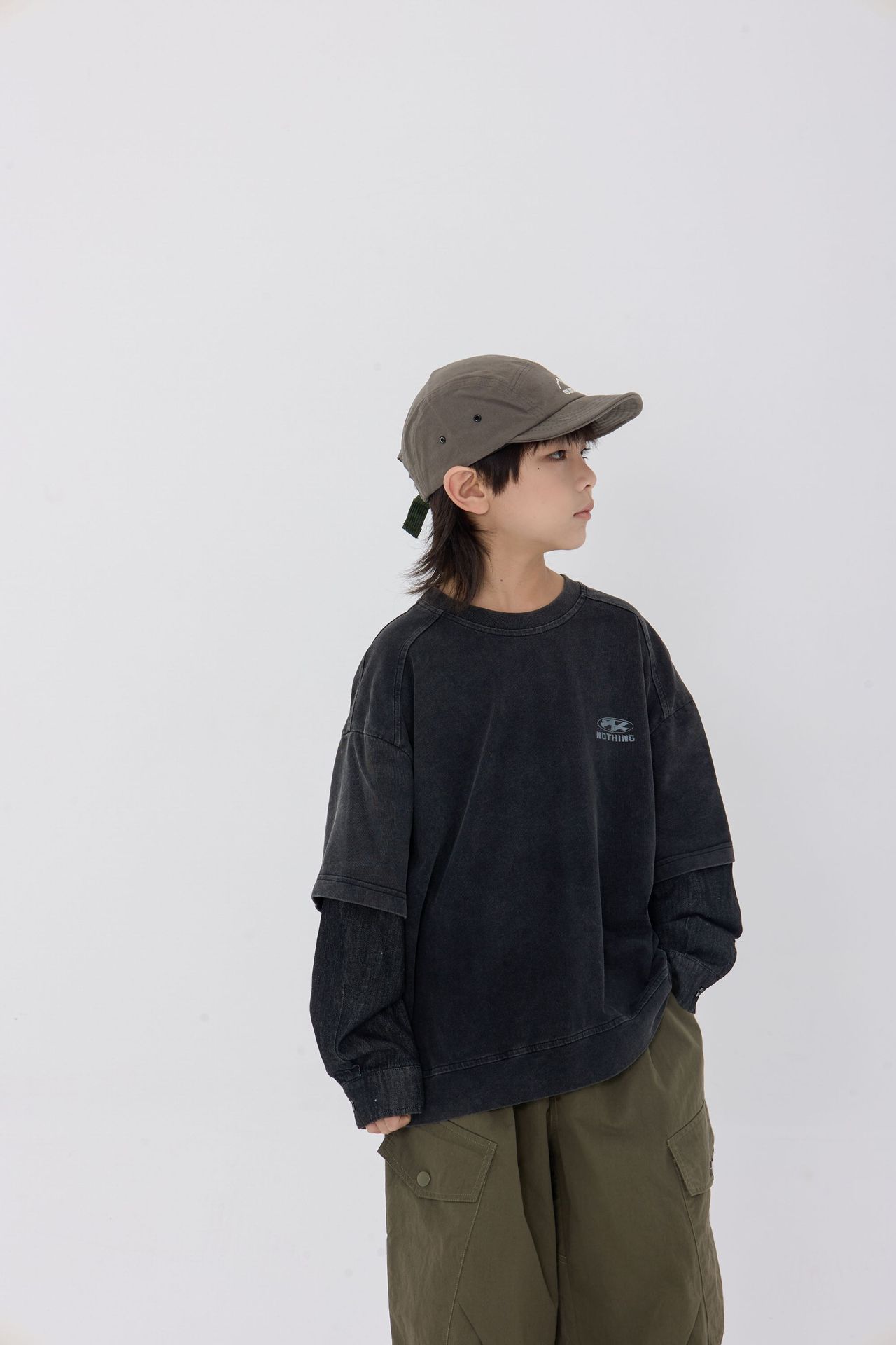 25 봄 신작 아동용 블랙 샌드 워시 코튼 아동용 티셔츠 트렌디 아동용 디스트레스드 스플 라이스 데님 슬리브 가짜 투피스 긴팔 티셔츠스토어 가기