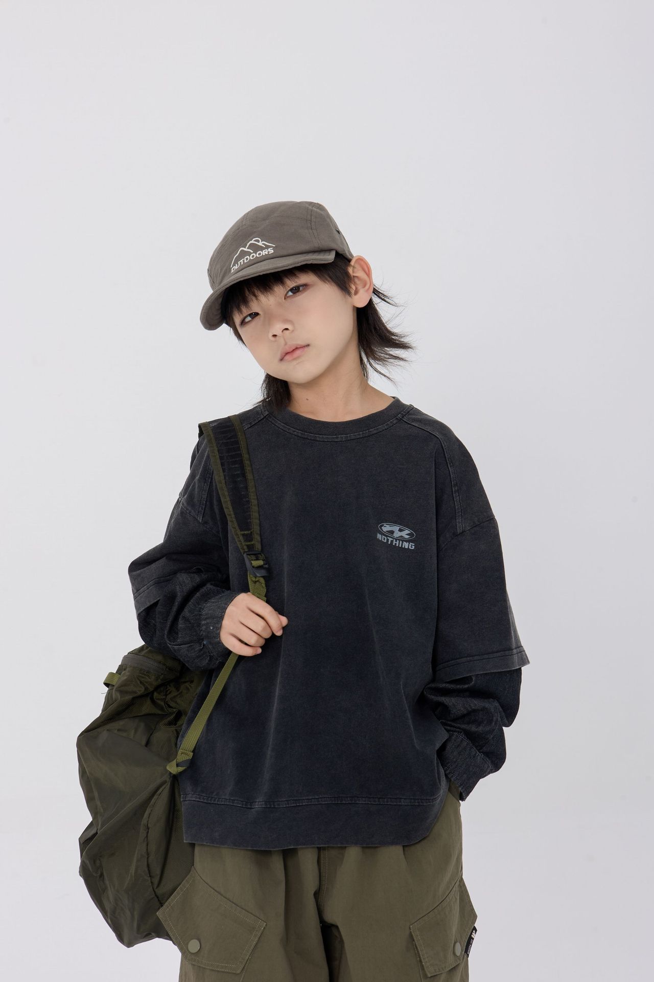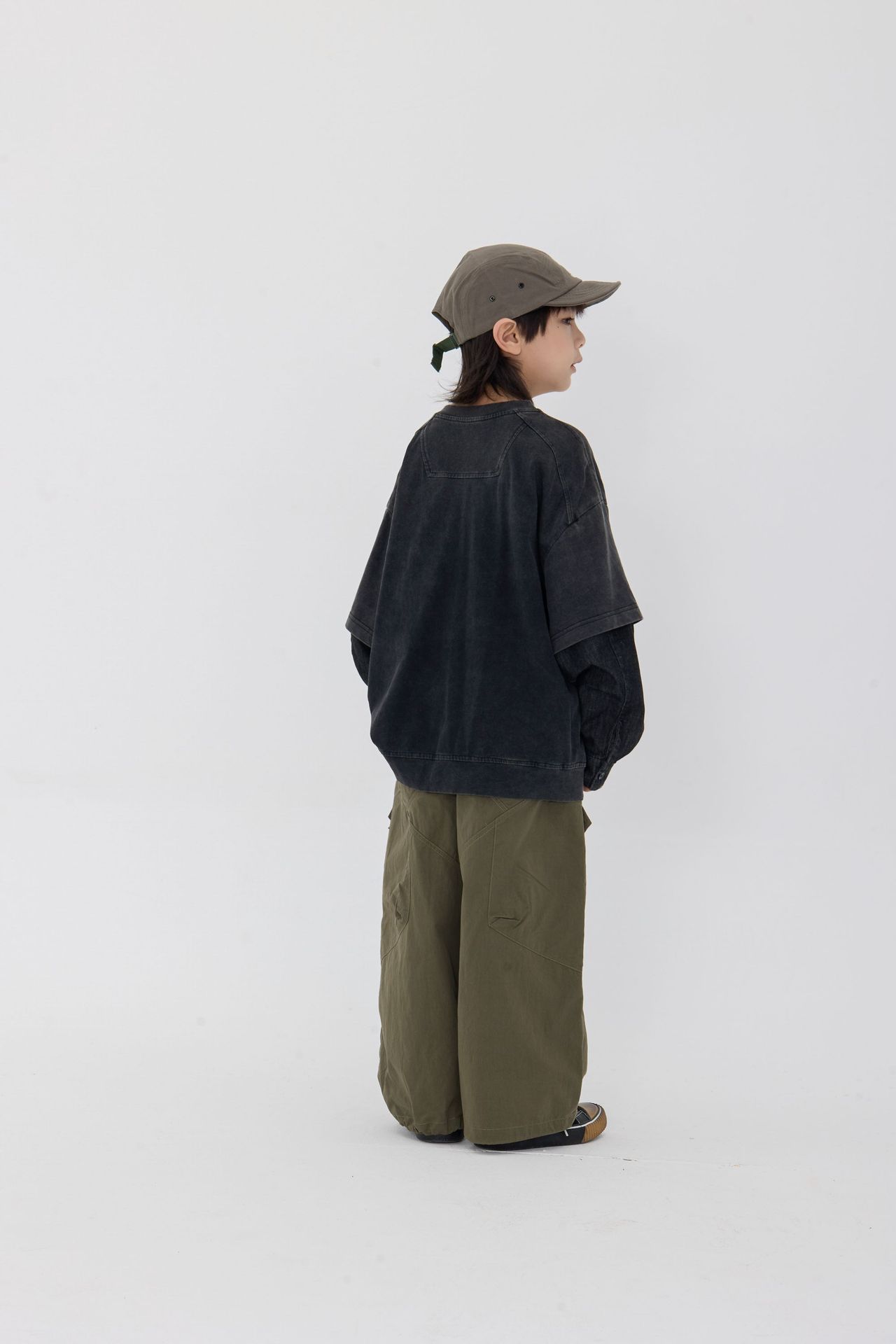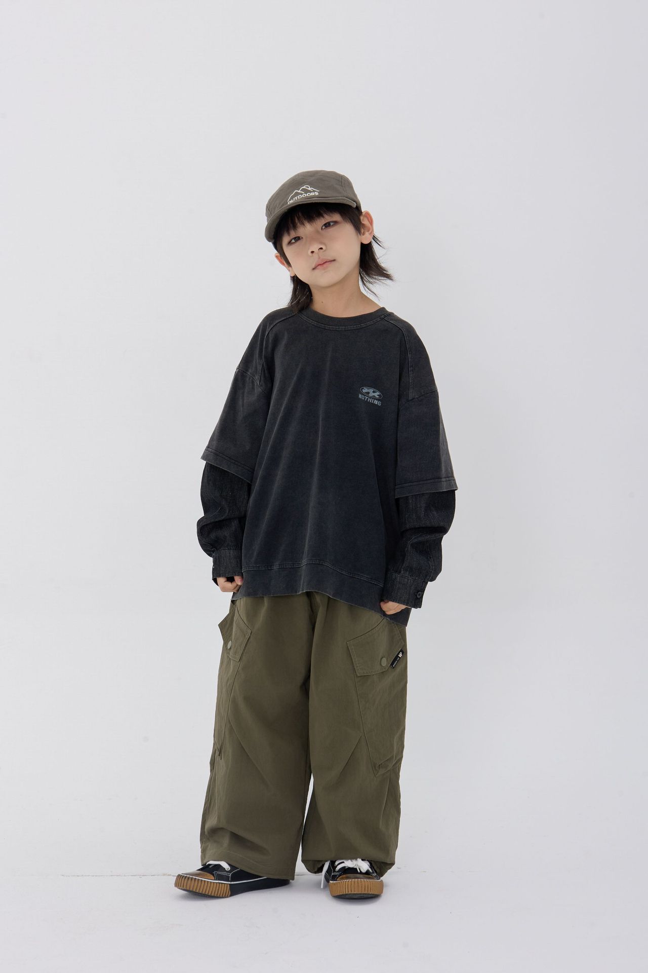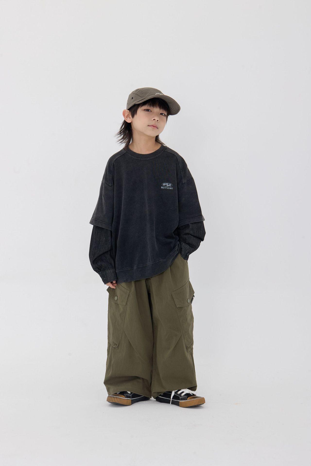 25 봄 신작 아동용 블랙 샌드 워시 코튼 아동용 티셔츠 트렌디 아동용 디스트레스드 스플 라이스 데님 슬리브 가짜 투피스 긴팔 티셔츠스토어 가기