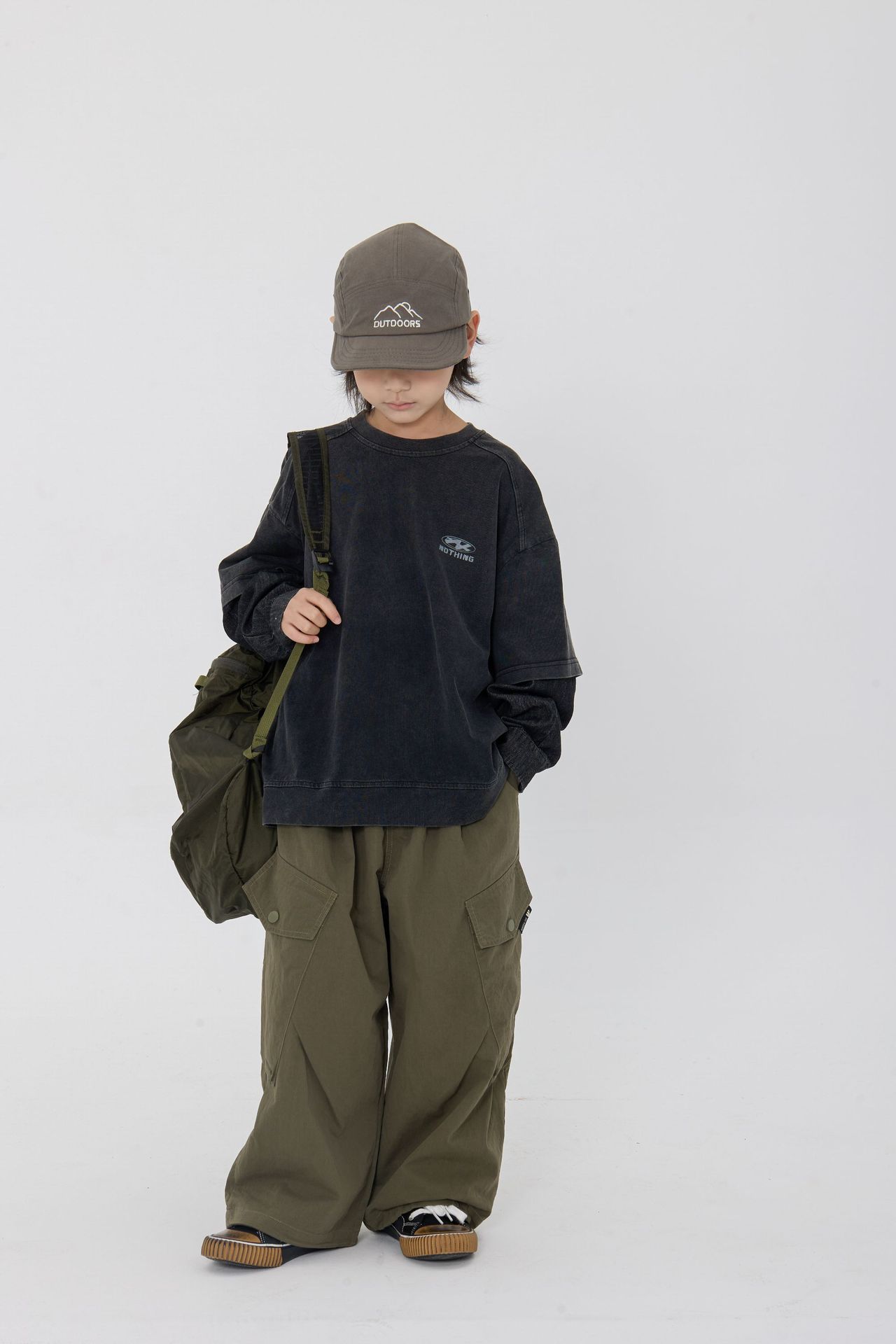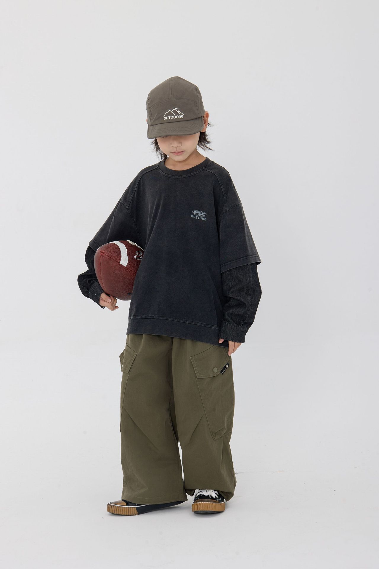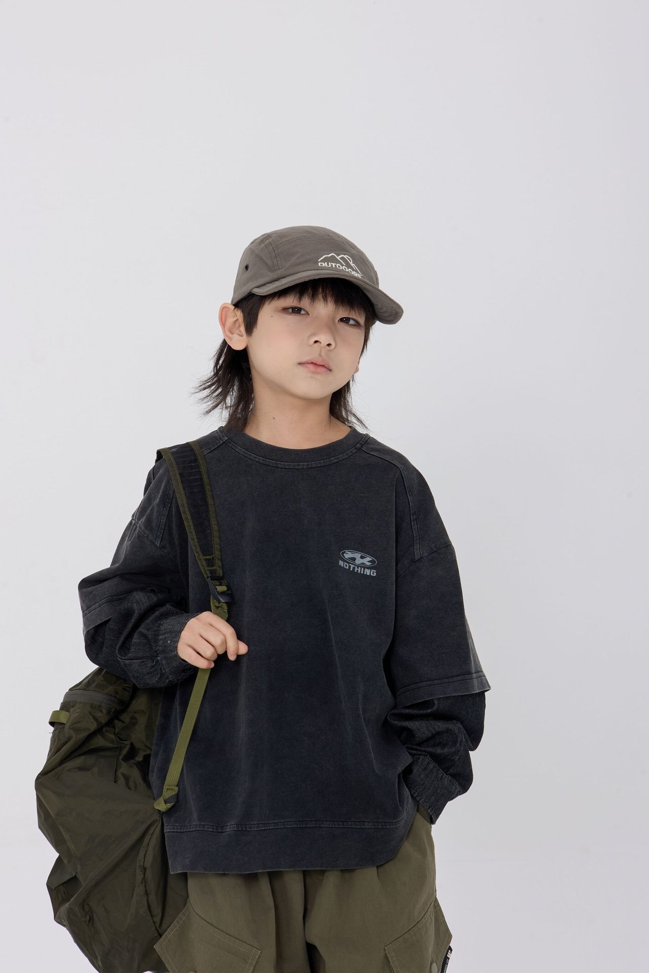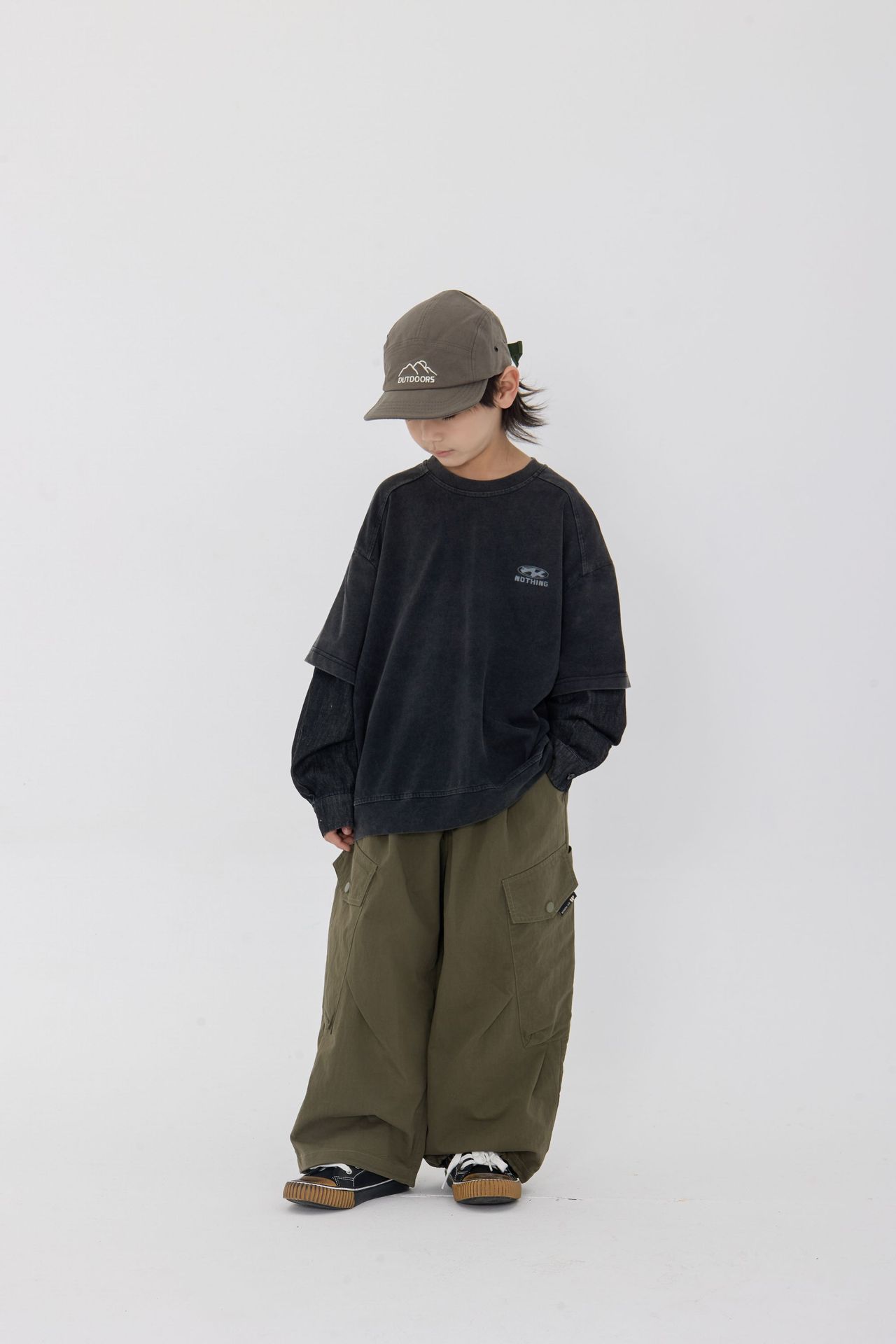 25 봄 신작 아동용 블랙 샌드 워시 코튼 아동용 티셔츠 트렌디 아동용 디스트레스드 스플 라이스 데님 슬리브 가짜 투피스 긴팔 티셔츠스토어 가기