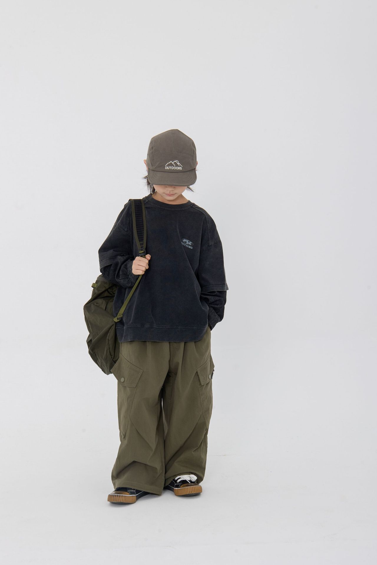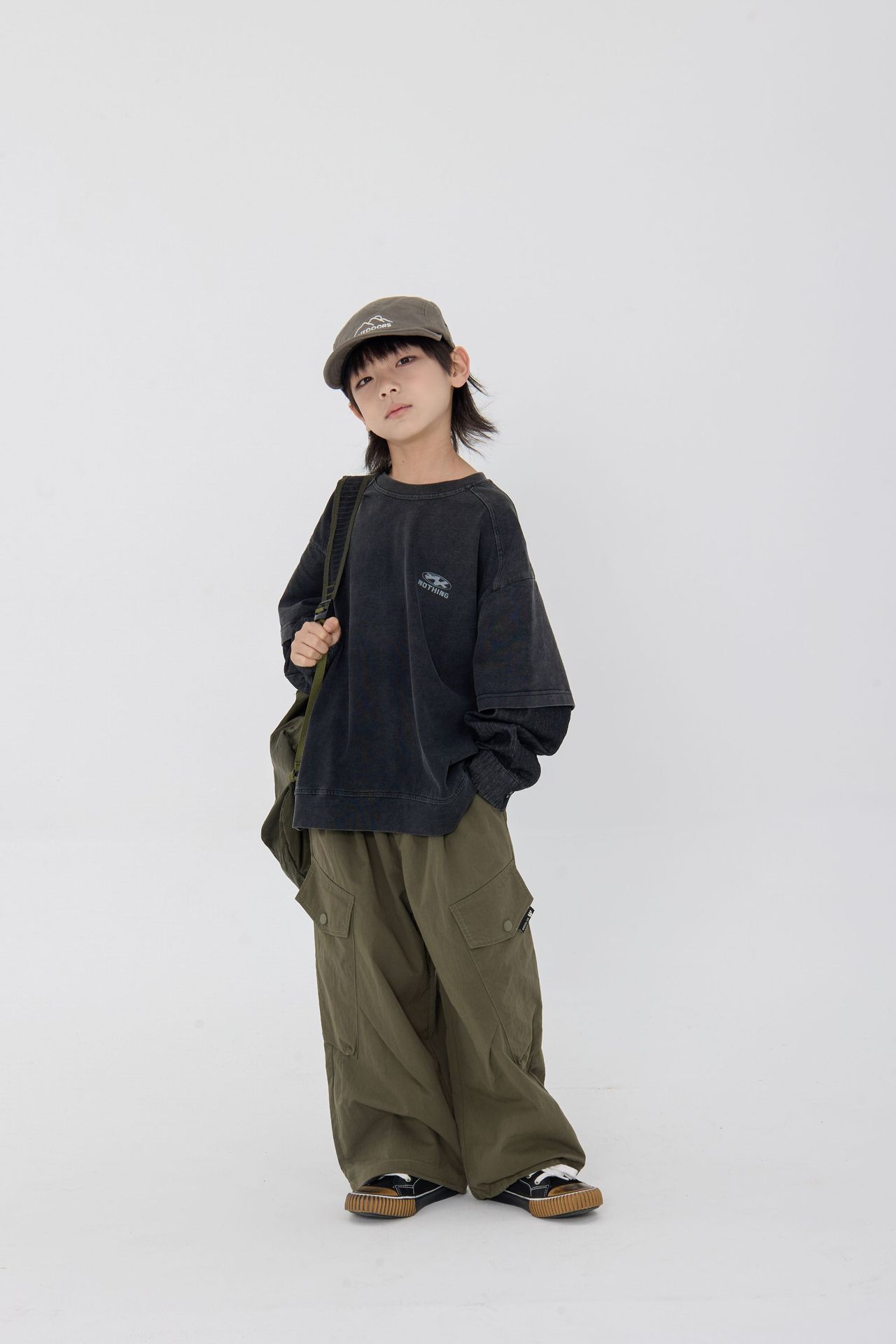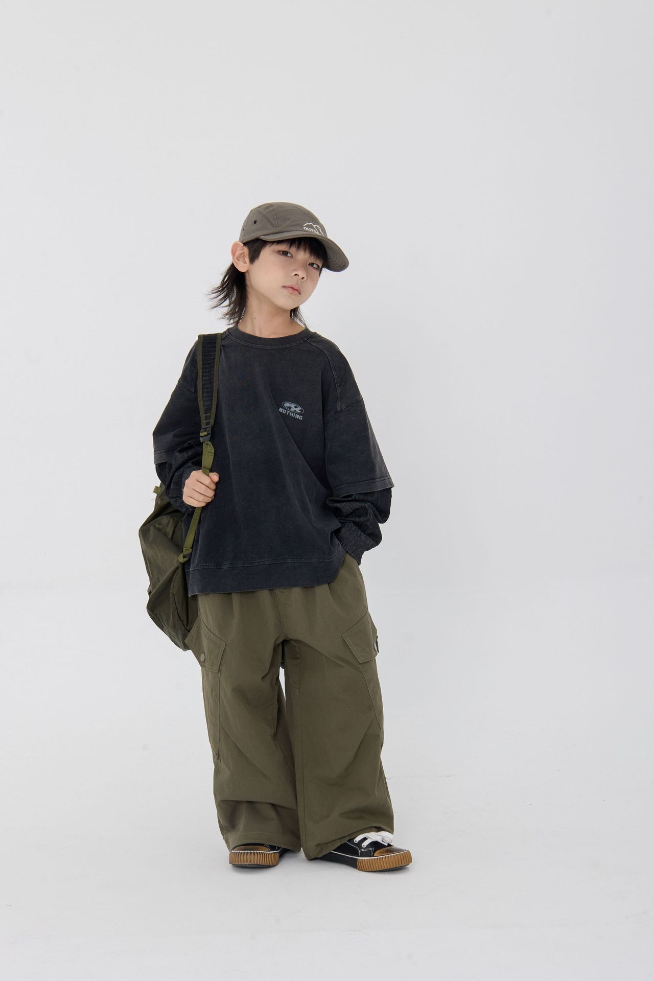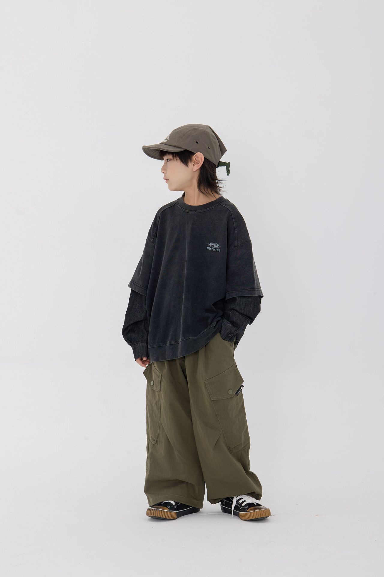 25 봄 신작 아동용 블랙 샌드 워시 코튼 아동용 티셔츠 트렌디 아동용 디스트레스드 스플 라이스 데님 슬리브 가짜 투피스 긴팔 티셔츠스토어 가기