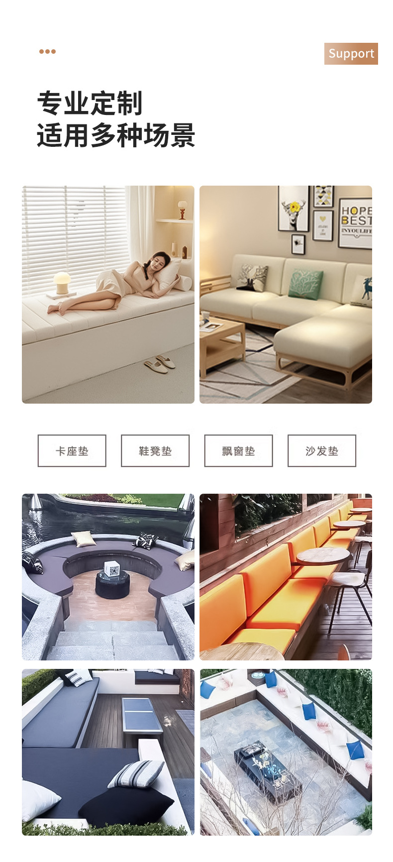 由于飘窗垫、坐垫等产品内胆为海绵材质,此材料有一定的延展性,成品的尺寸存在1-2cm误差纯属正常情况,如有复杂不规则形状请在图纸上标明尺寸。