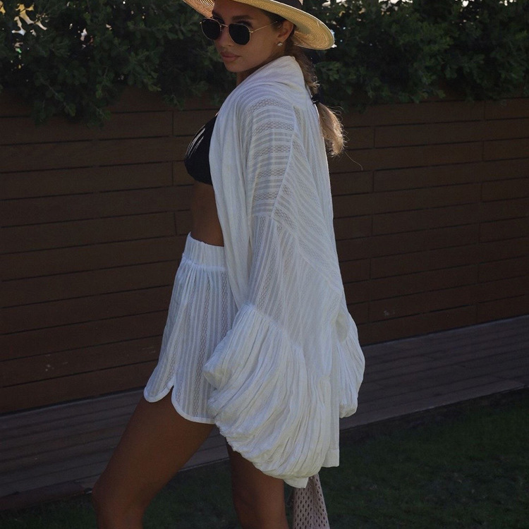 유럽 및 미국 여성 캐주얼 세트 여성 2025 새로운 코튼 스트랩 느슨한 긴팔 카디건 탑 반바지 투피스 세트스토어 가기