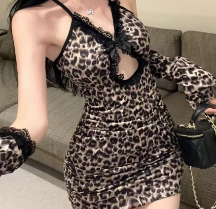 야생 레오파드 핫 백 힙합 넥 슬링 섹시한 홈 파자마 섹시한 레이스 할로우 유혹 원피스 여성스토어 가기