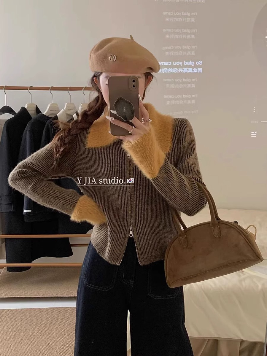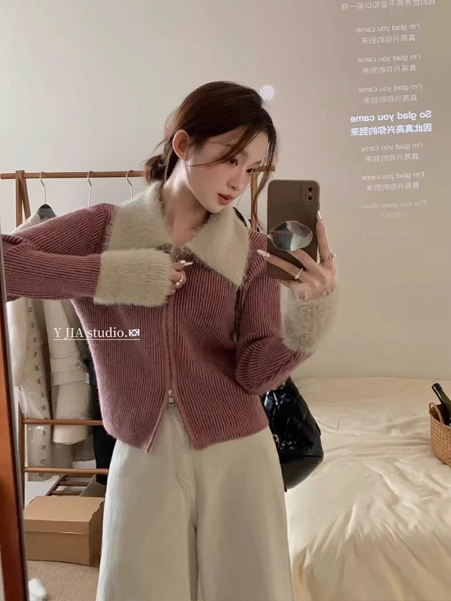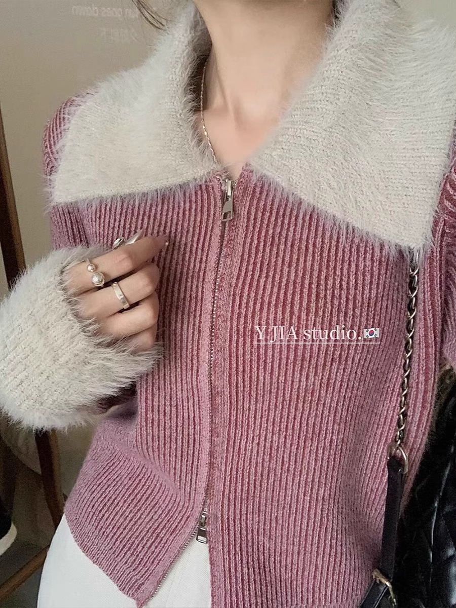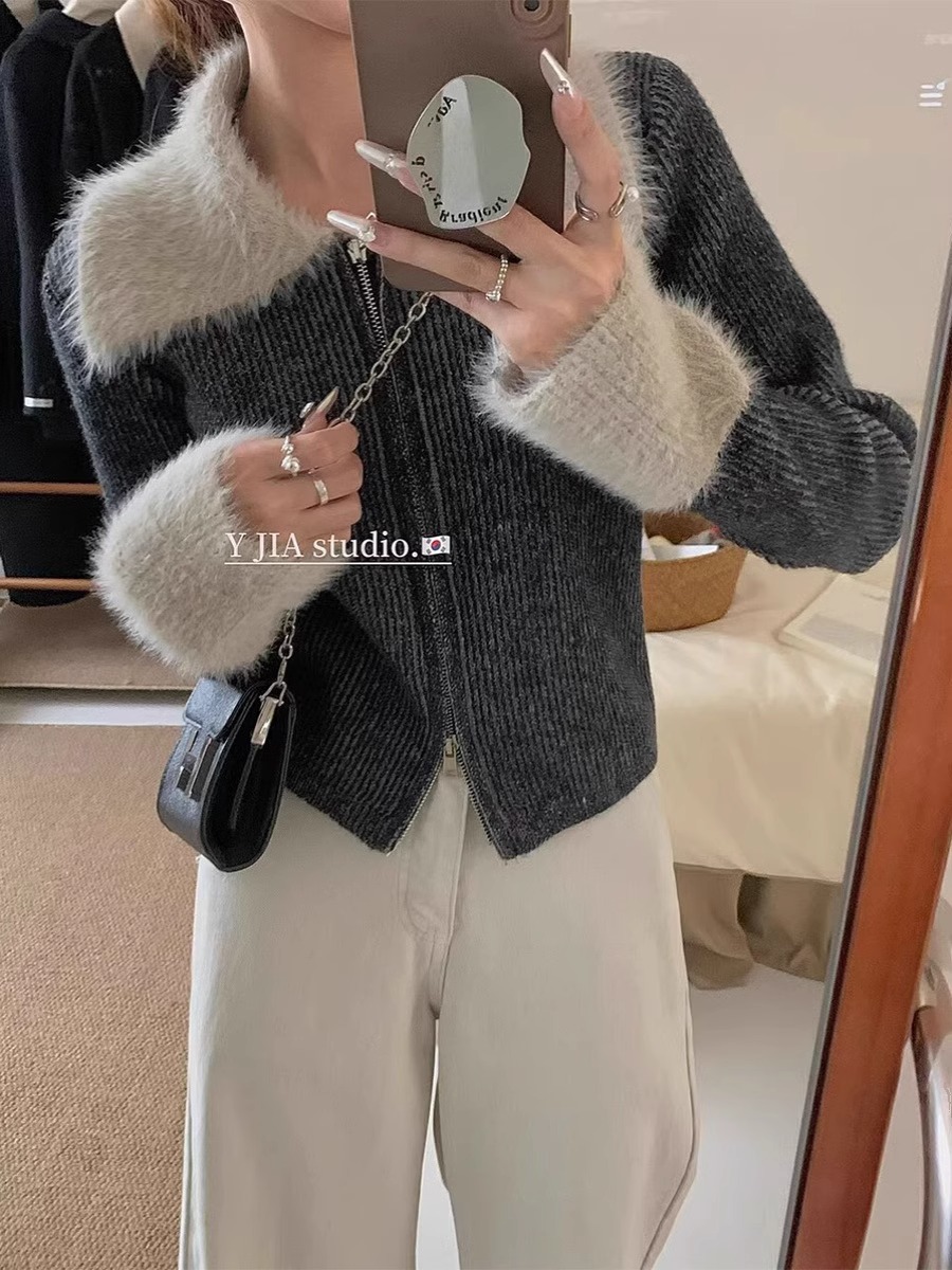 더블 지퍼 옷깃 밍크 벨벳 커프 스티칭 스웨터 코트 여성용 가을 겨울 짧은 감각 내부 니트 카디건