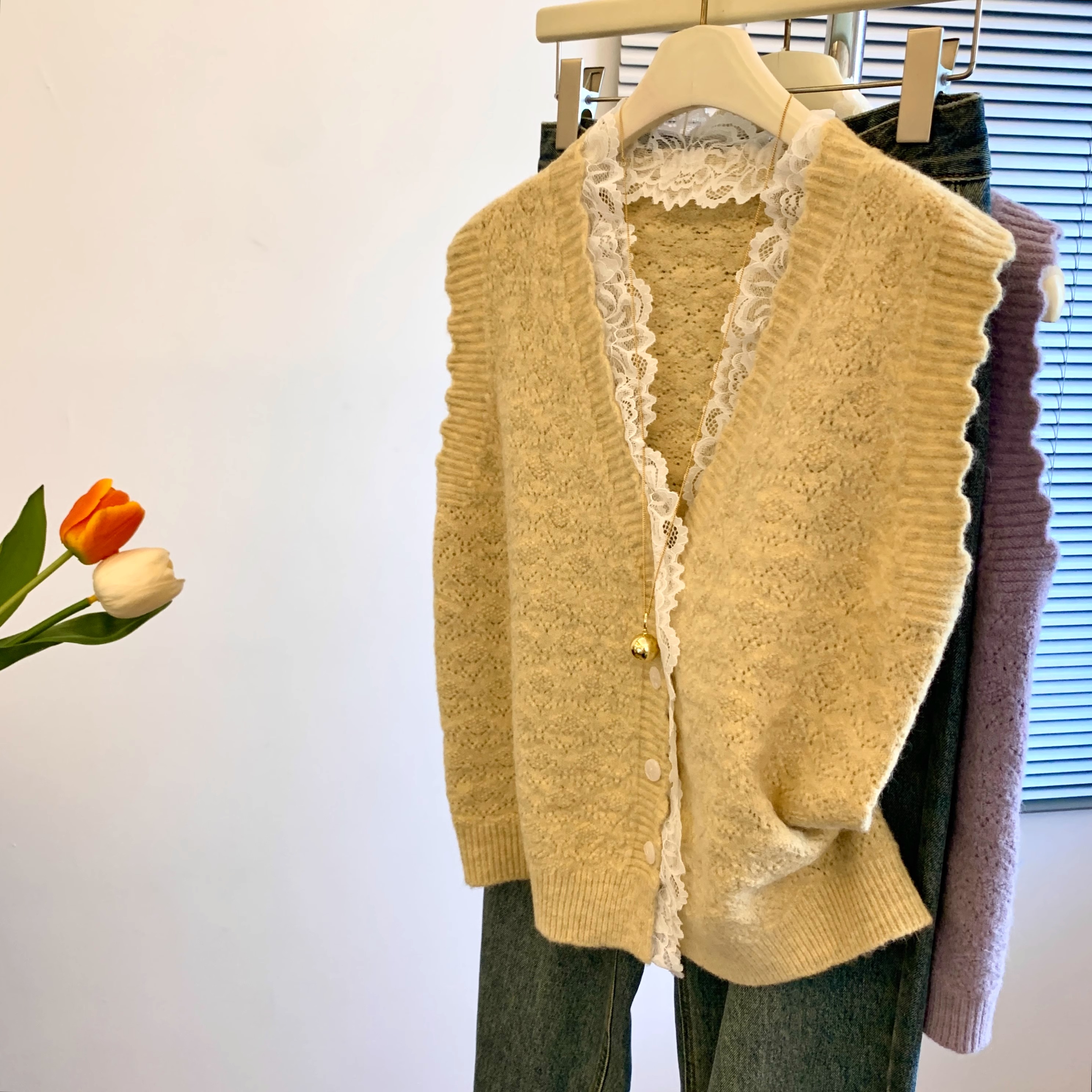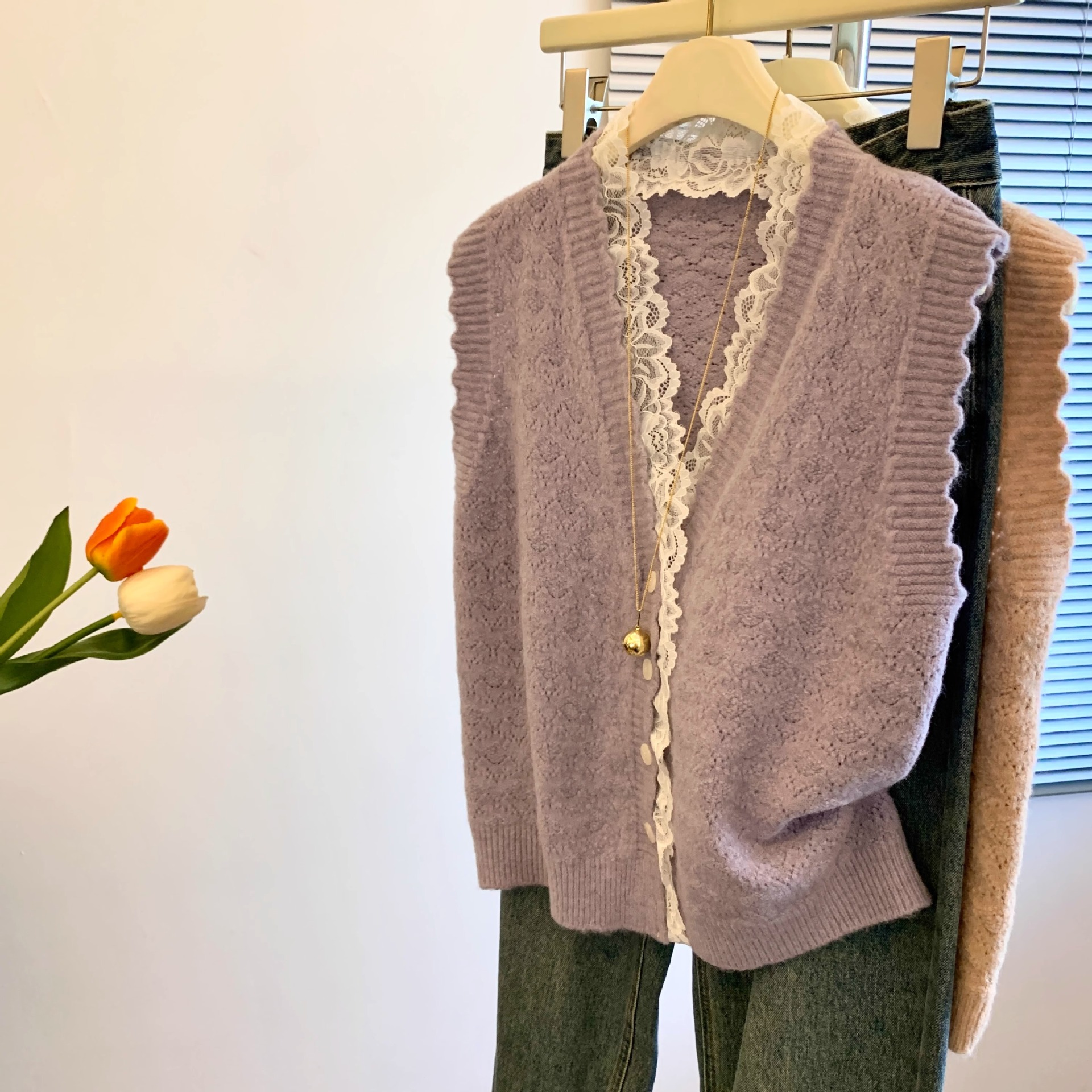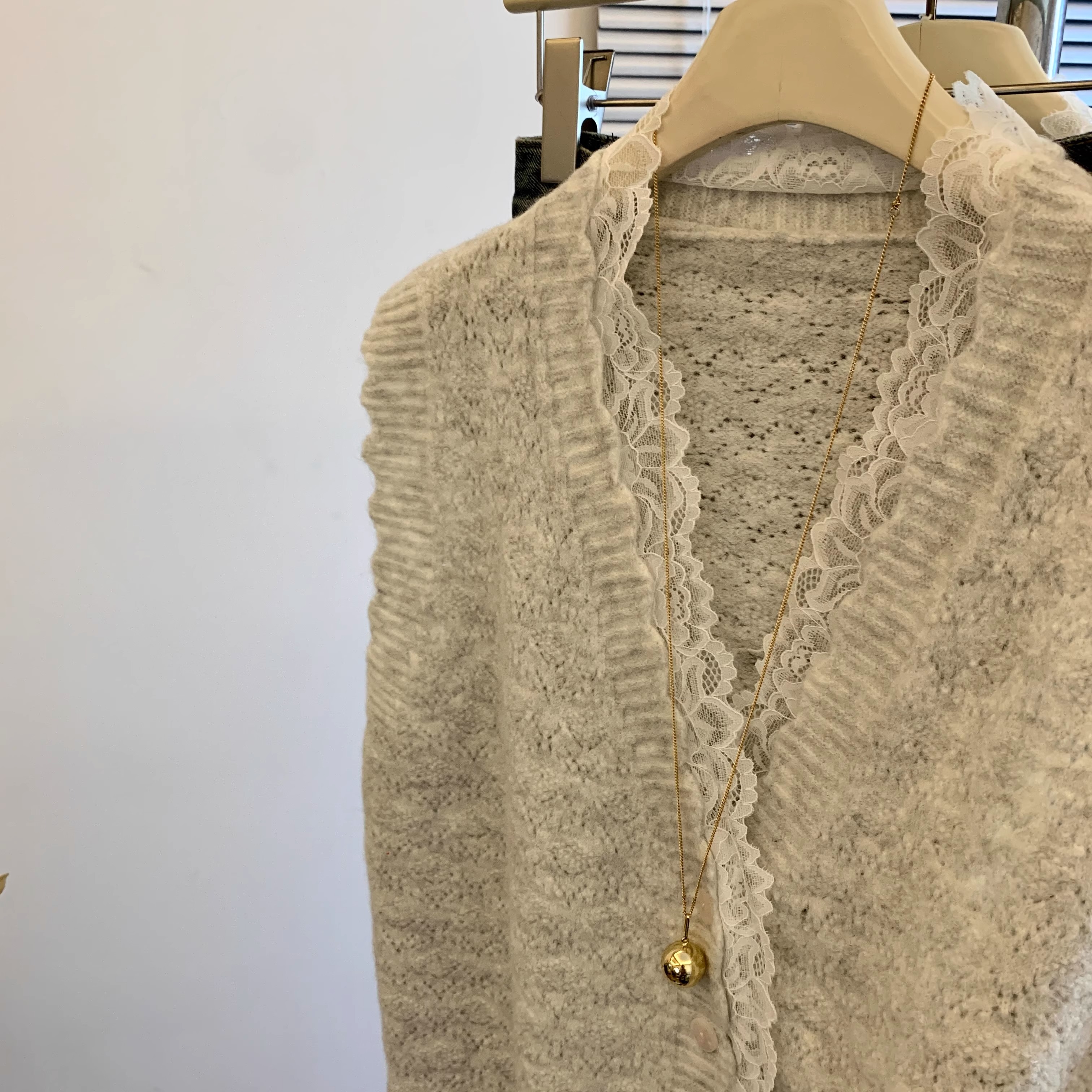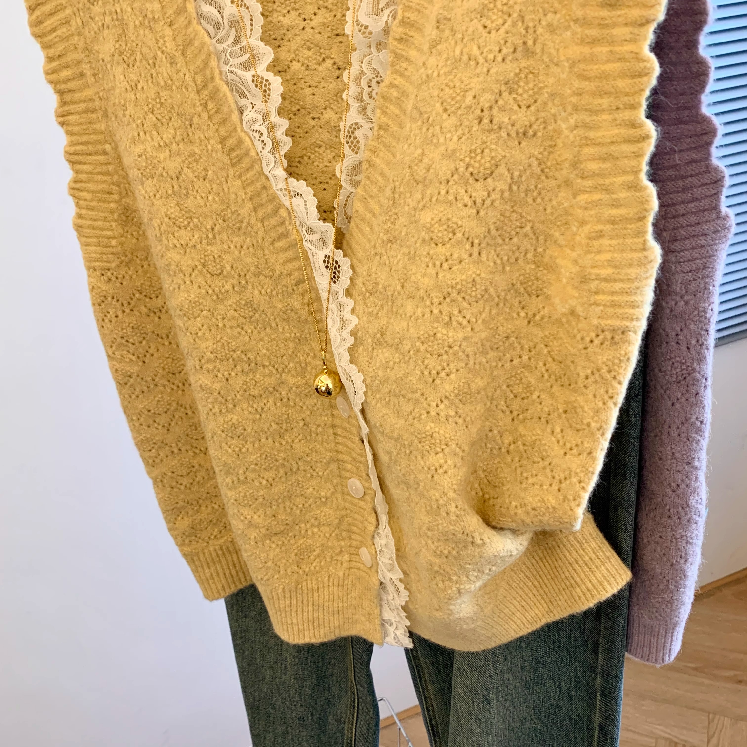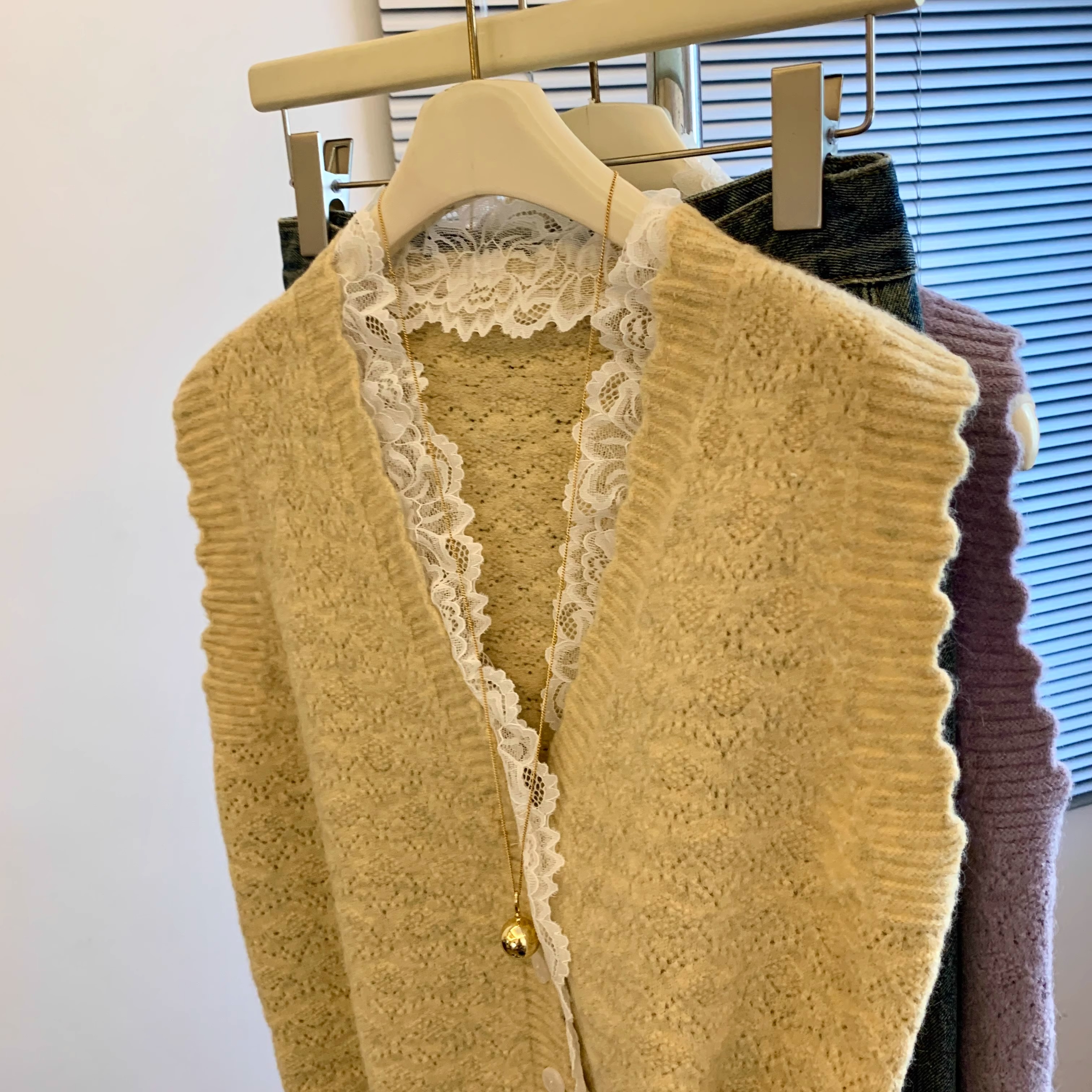 노란색 V 넥 레이스 스티칭 니트 조끼 여성 봄 2025 새로운 하이 엔드 카디건 양복 조끼 스웨터스토어 가기